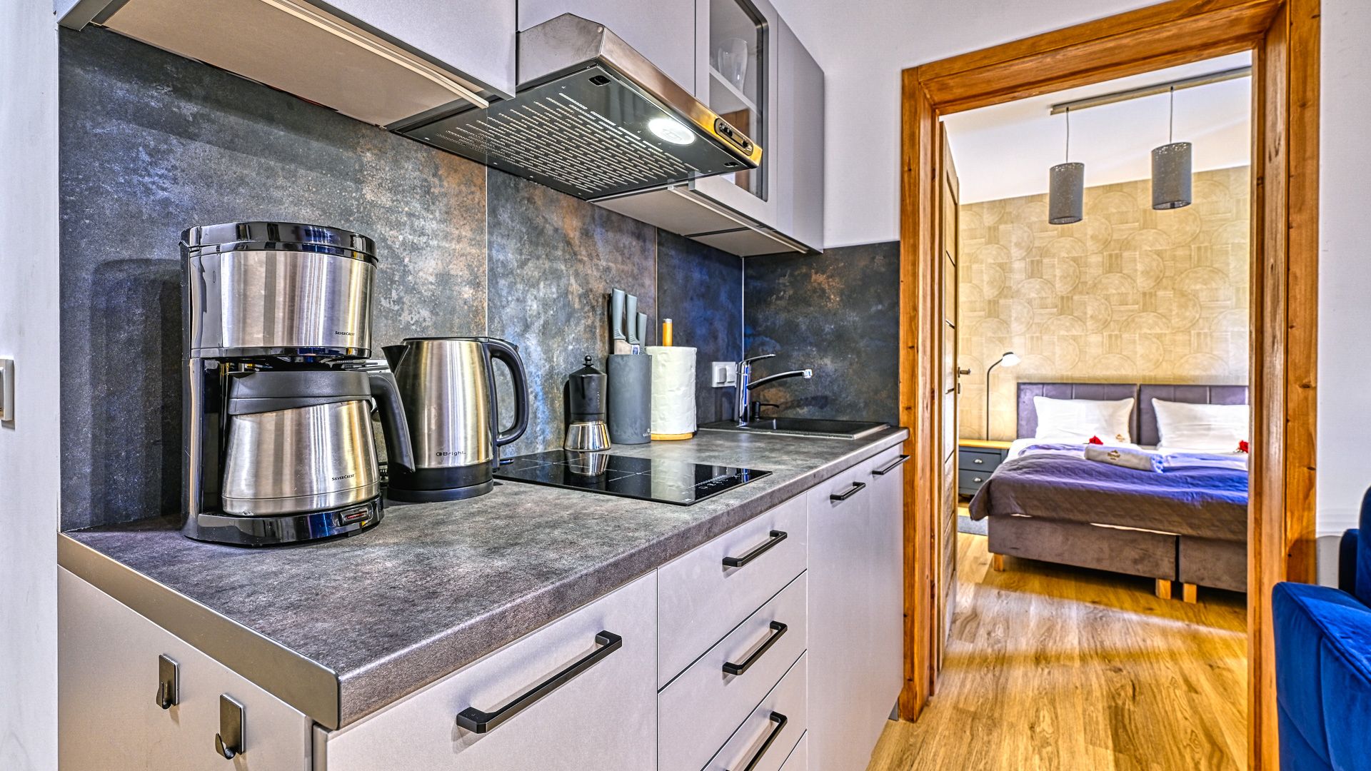 Apartament składa się z przestronnego salonu z rozkładaną sofą i aneksu kuchennego, gdzie znajdziesz wszystkie niezbędne urządzenia i sprzęty do gotowania m.in. czajnik, toster, ekspres do kawy, płytę grzewczą, lodówkę oraz zmywarkę z mikrofalą. W oddzielnej sypialni znajduje się wygodne łóżko małżeńskie, zapewniające spokojny sen po dniu pełnym aktywności, a także obszerna szafa.  W łazience z prysznicem dla komfortu gości zapewniono dodatkowo pralkę.