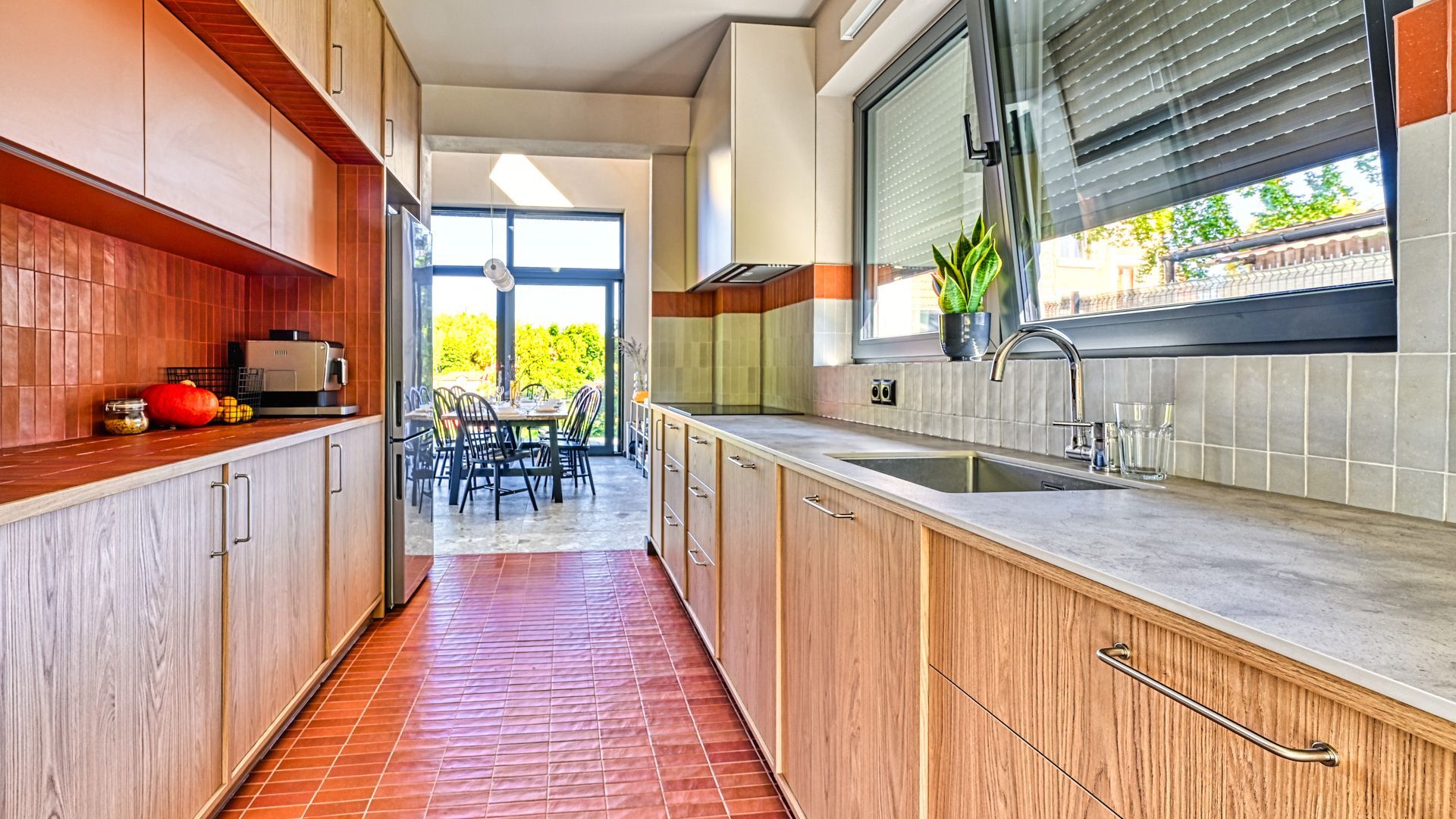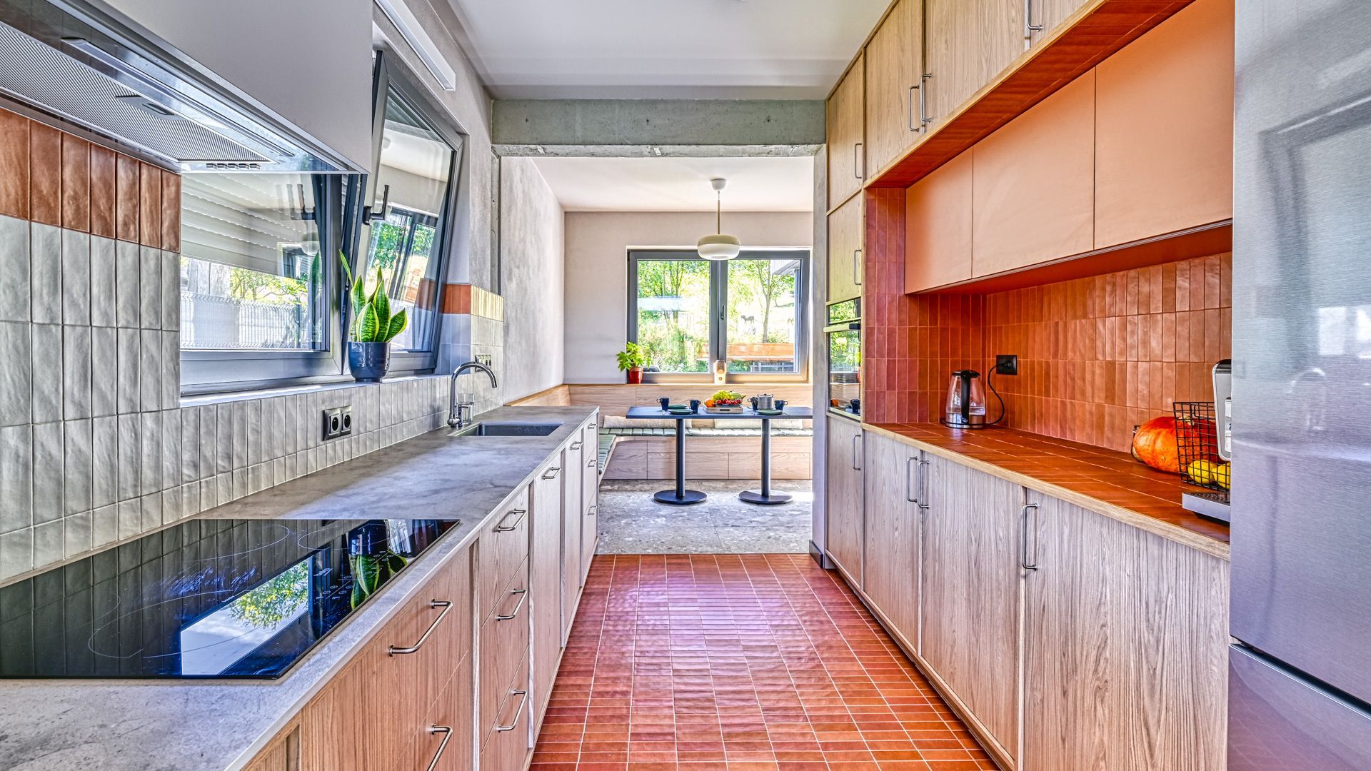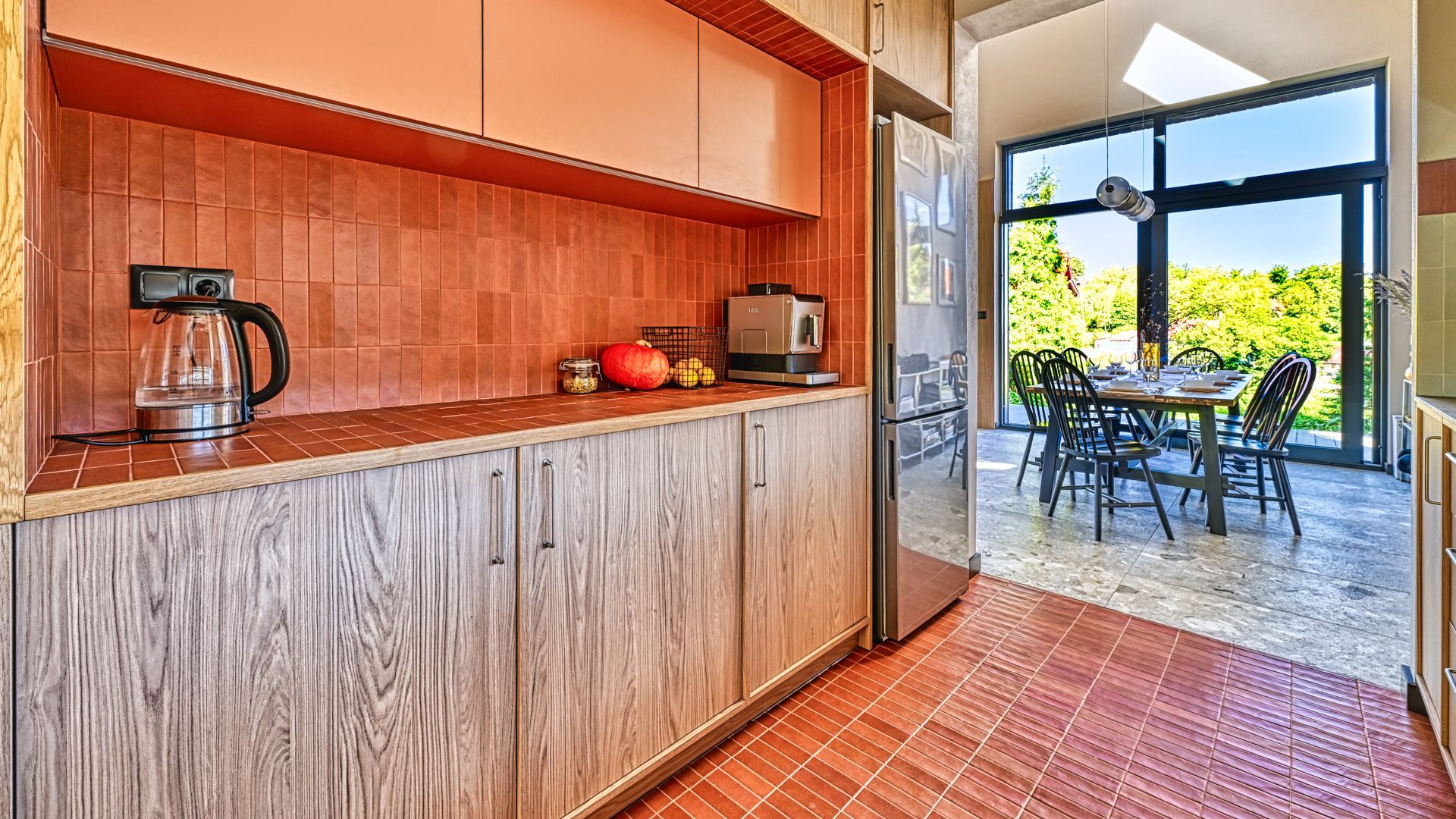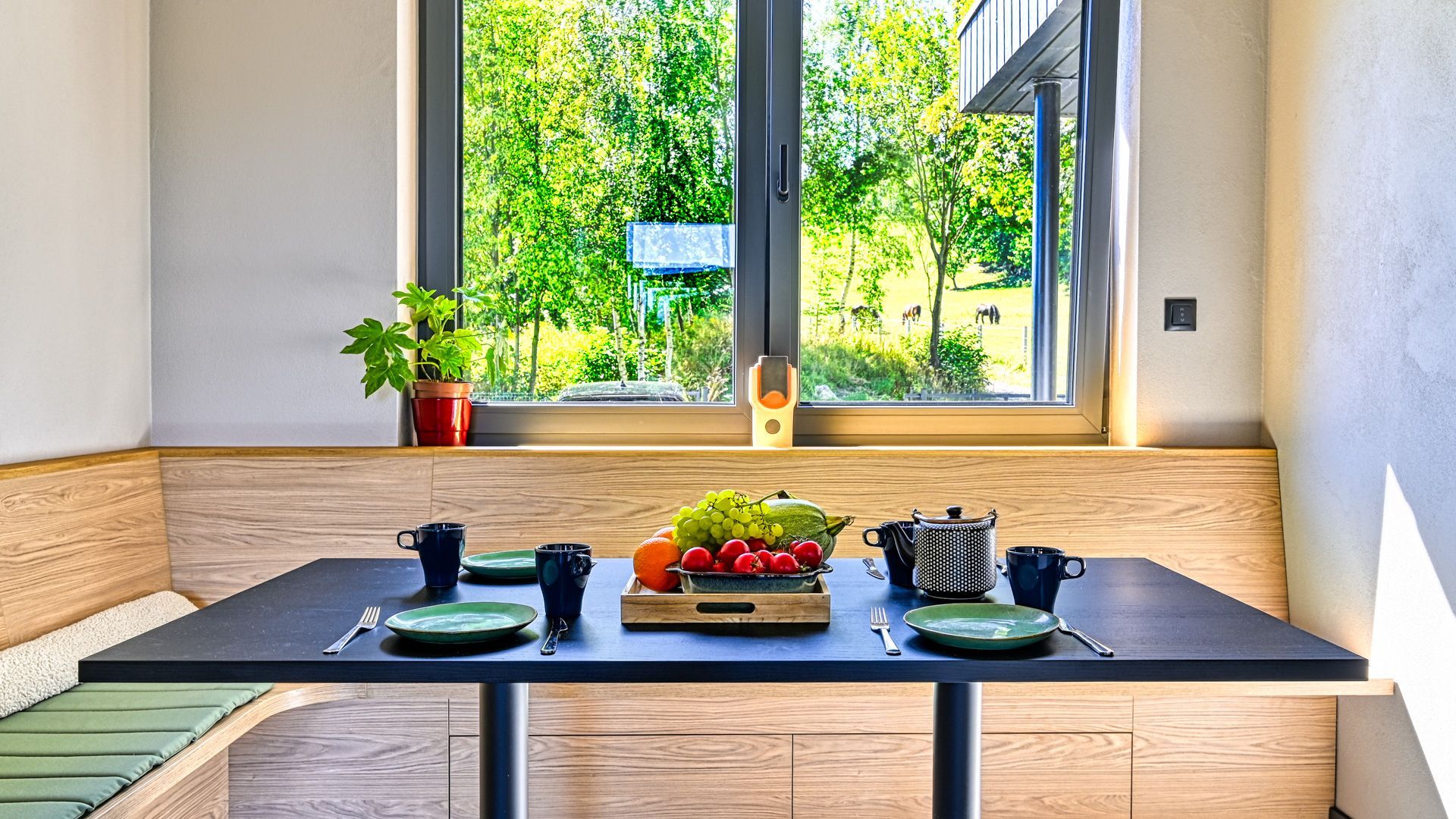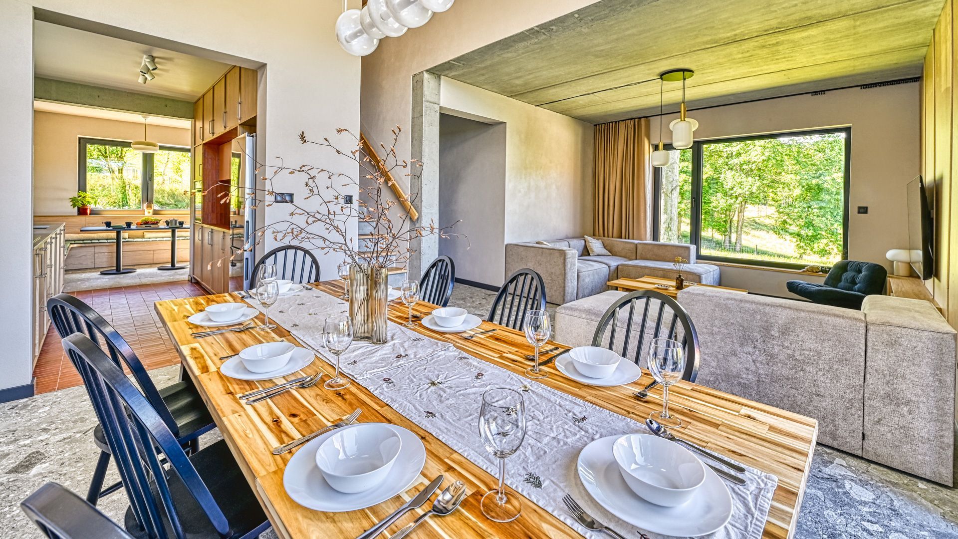 Willa oferuje przestronny salon z ogromnym oknem, z którego rozciąga się zachwycający widok na okoliczny krajobraz - przy zachodzie słońca bywa tam naprawdę wyjątkowo. Aneks kuchenny został w pełni wyposażony: znajduje się w nim lodówka, płyta kuchenna oraz stół jadalny, umożliwiający wspólne przygotowywanie i spożywanie posiłków.