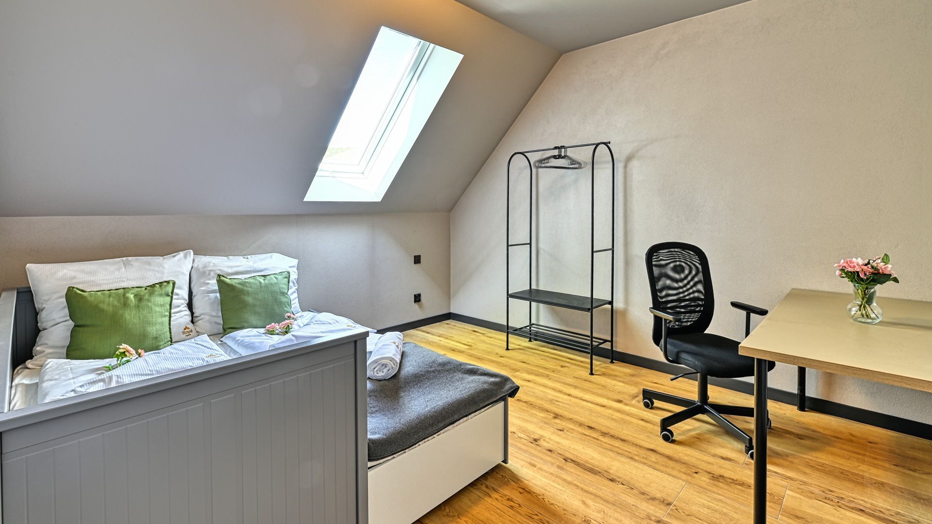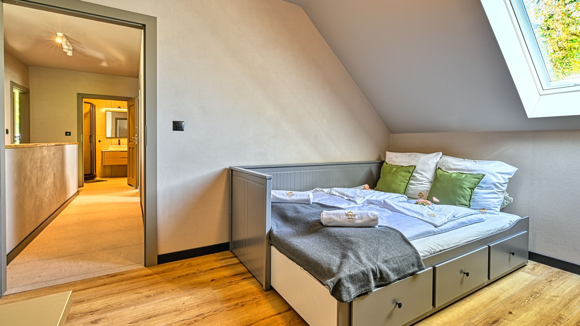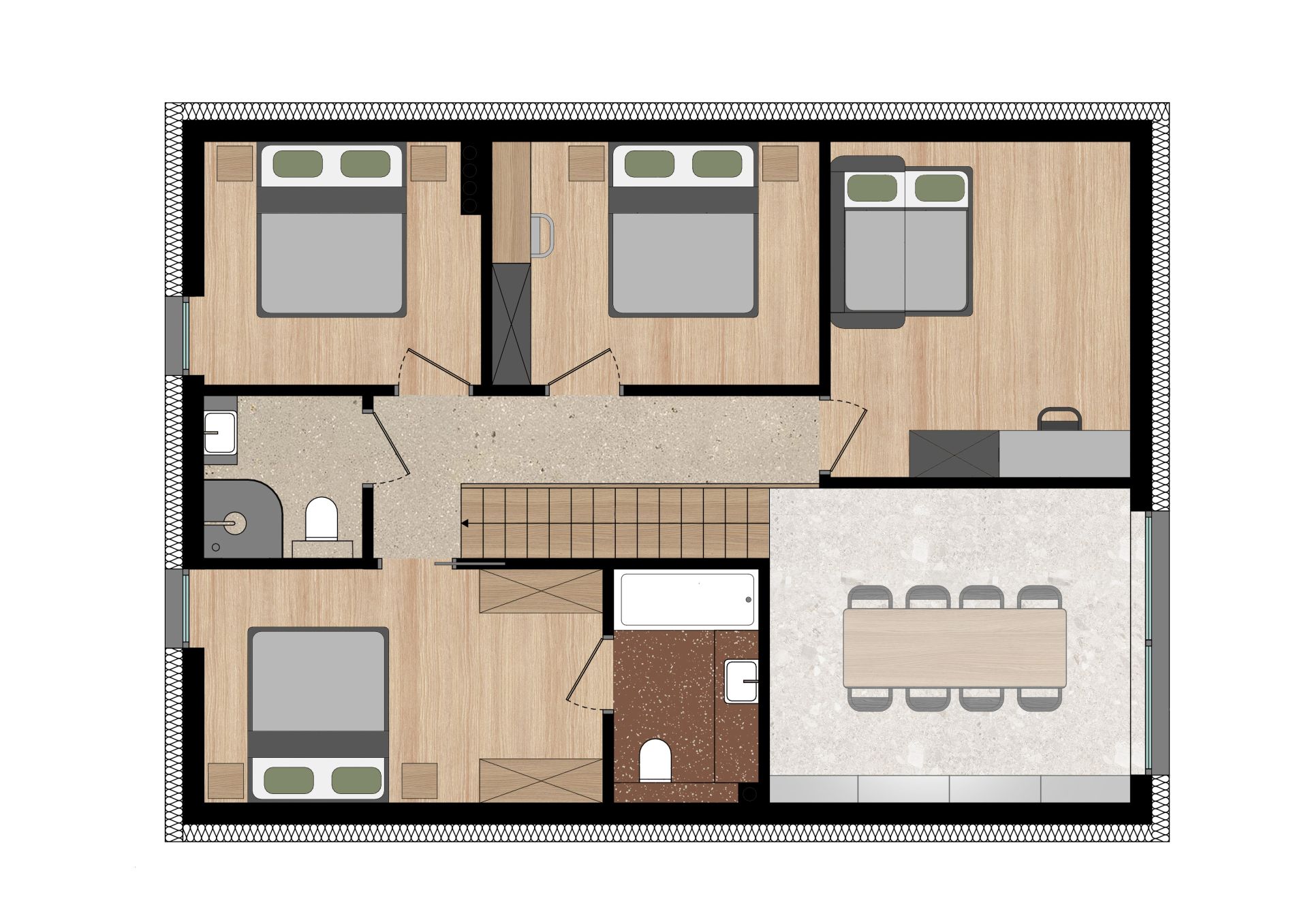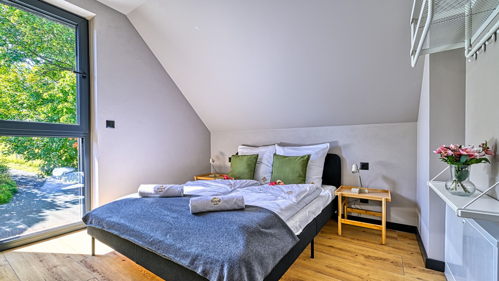 Na piętrze znajdują się cztery komfortowe sypialnie dwuosobowe, idealne dla rodzin lub grup przyjaciół. Willa dysponuje trzema łazienkami: jedną przynależąca do prywatnej strefy sauny i dwiema na piętrze, w tym jedną z wanną, co gwarantuje wygodę i komfort pobytu dla wszystkich gości.