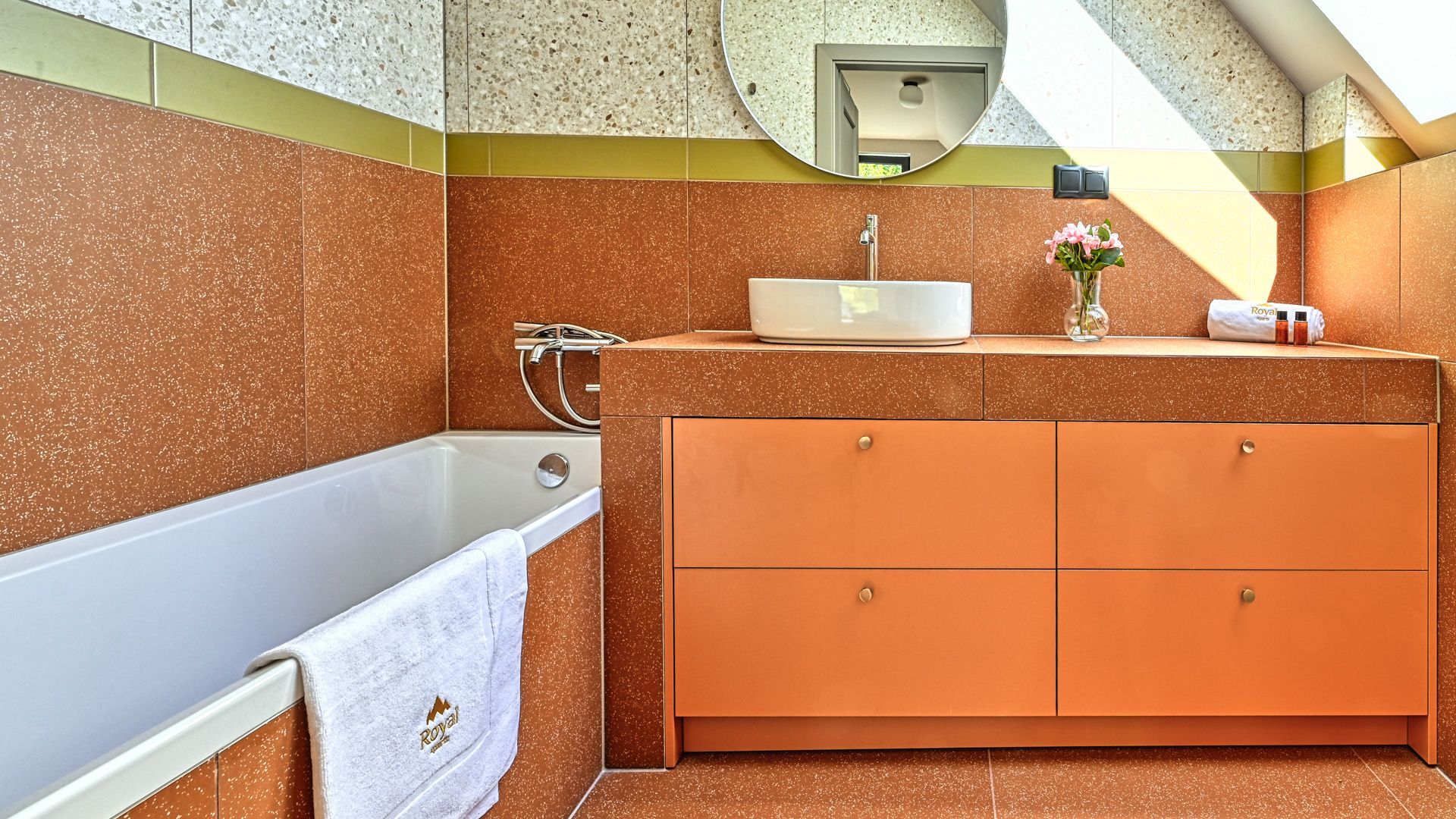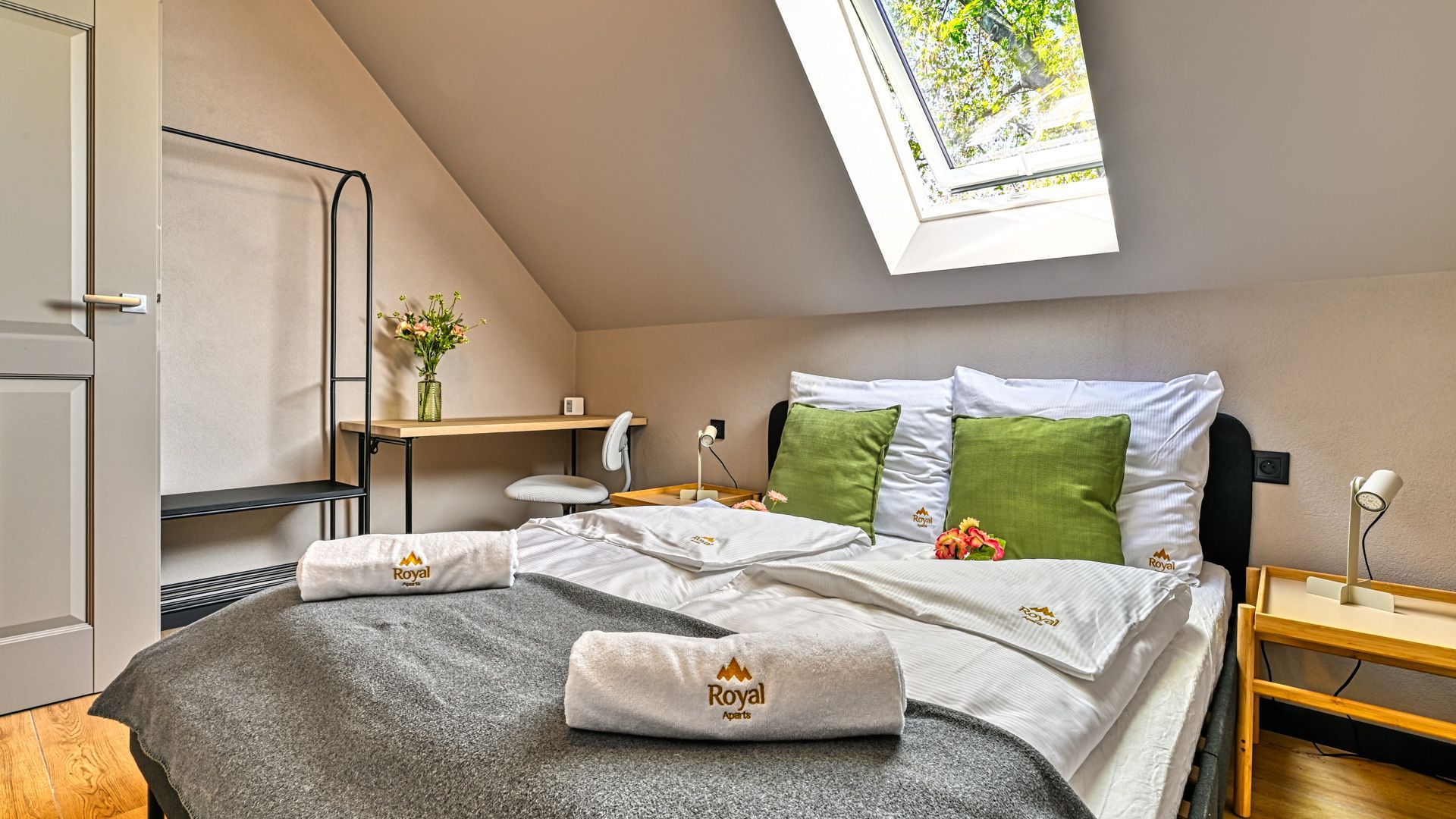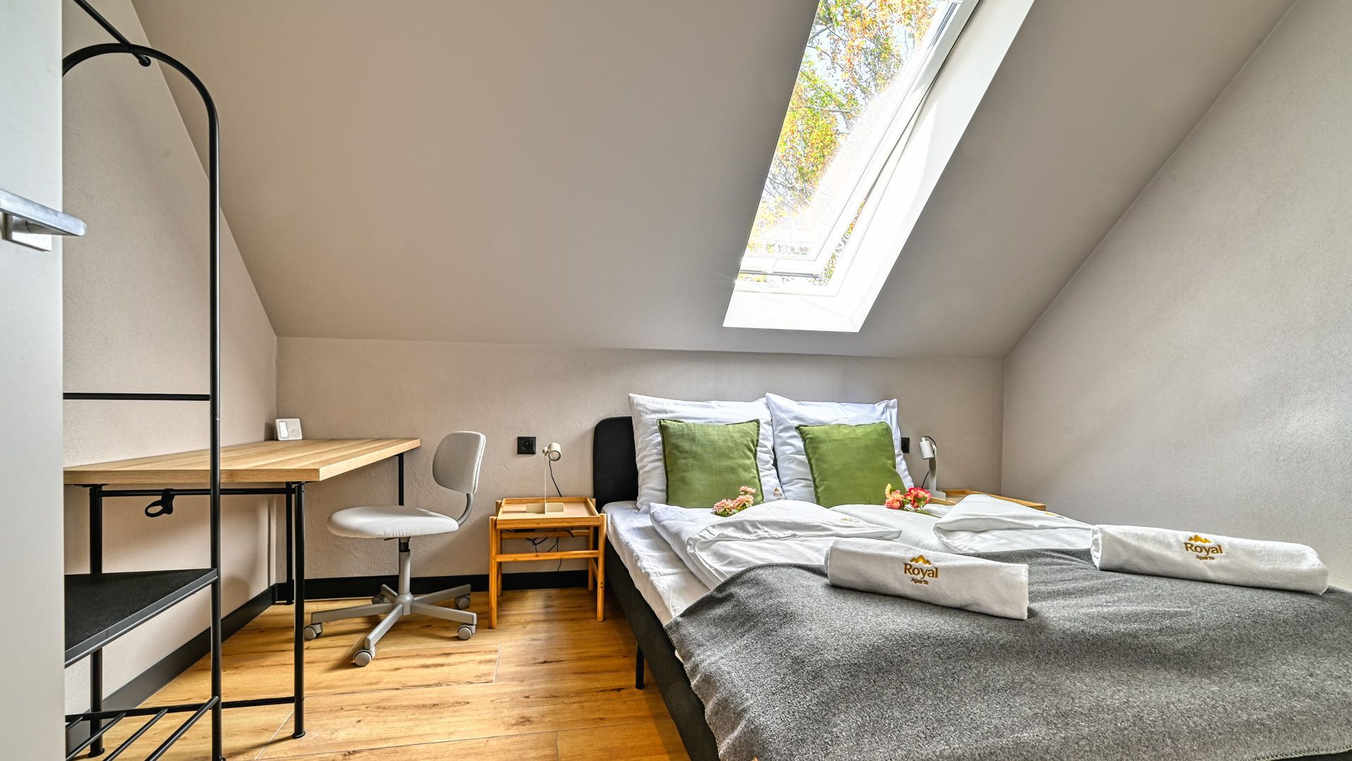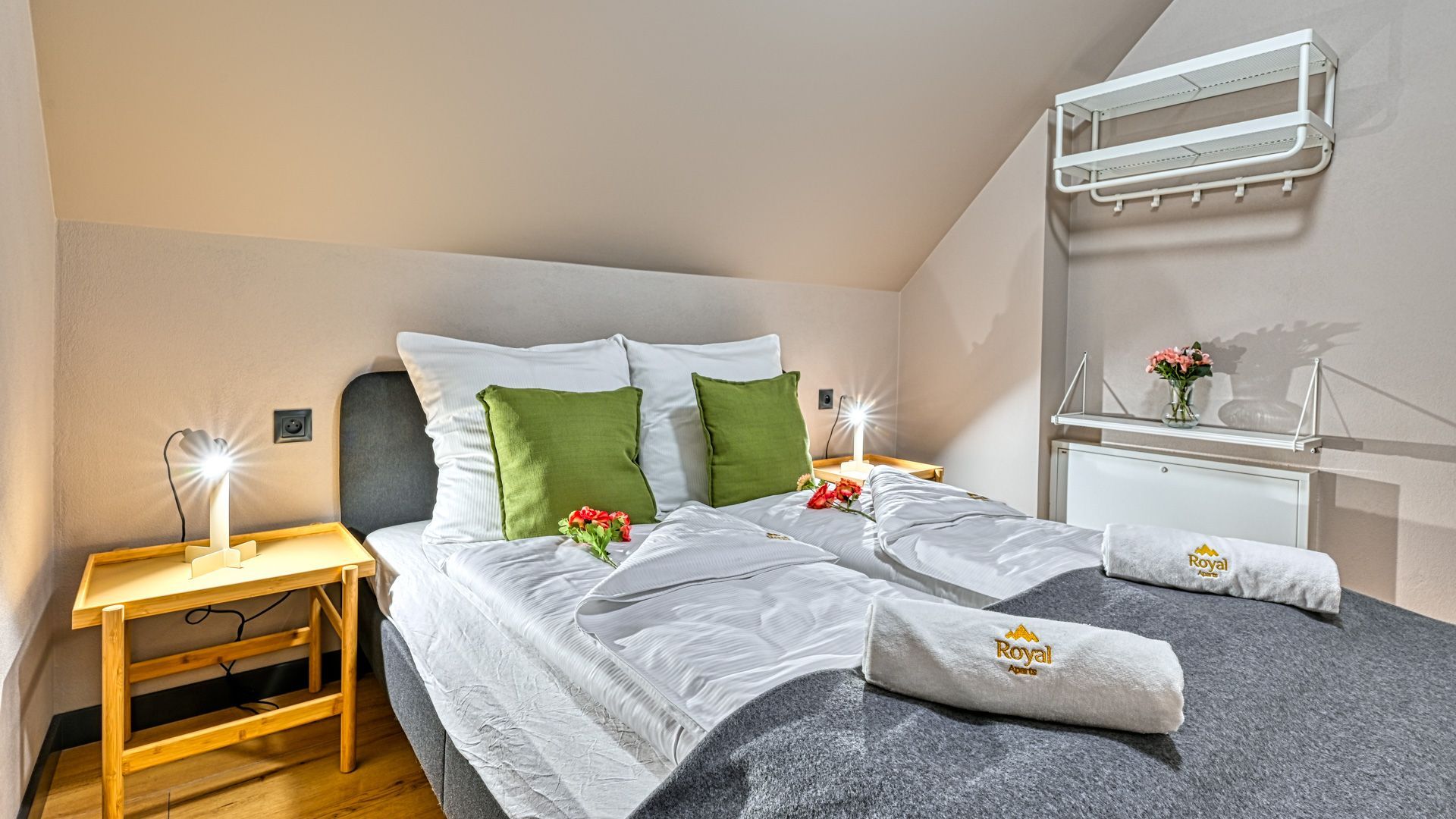 Na piętrze znajdują się cztery komfortowe sypialnie dwuosobowe, idealne dla rodzin lub grup przyjaciół. Willa dysponuje trzema łazienkami: jedną przynależąca do prywatnej strefy sauny i dwiema na piętrze, w tym jedną z wanną, co gwarantuje wygodę i komfort pobytu dla wszystkich gości.