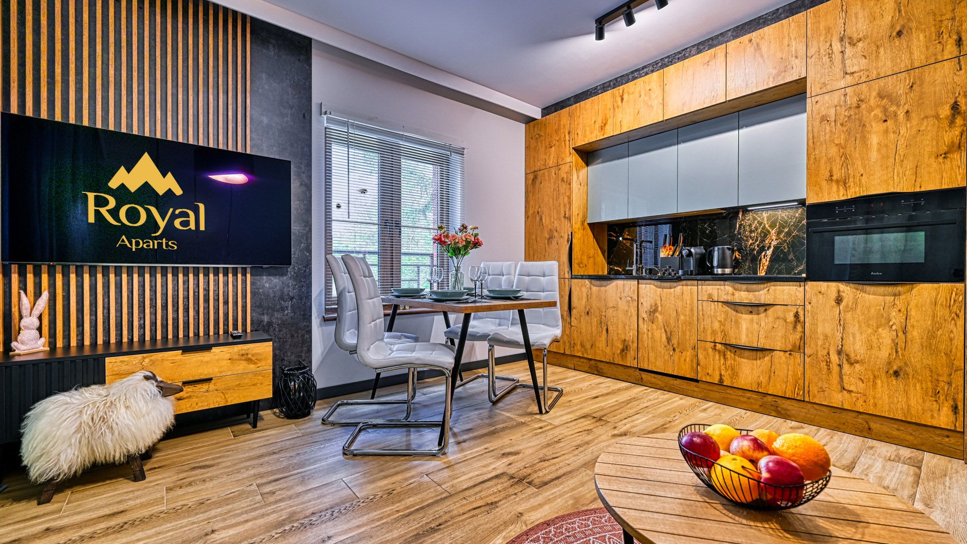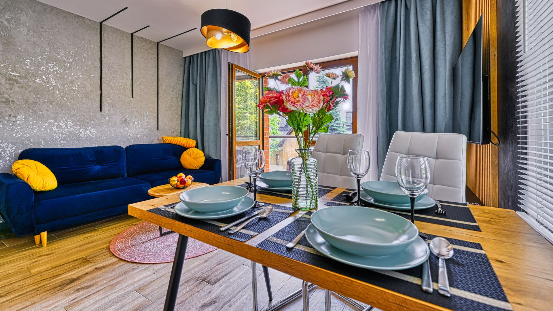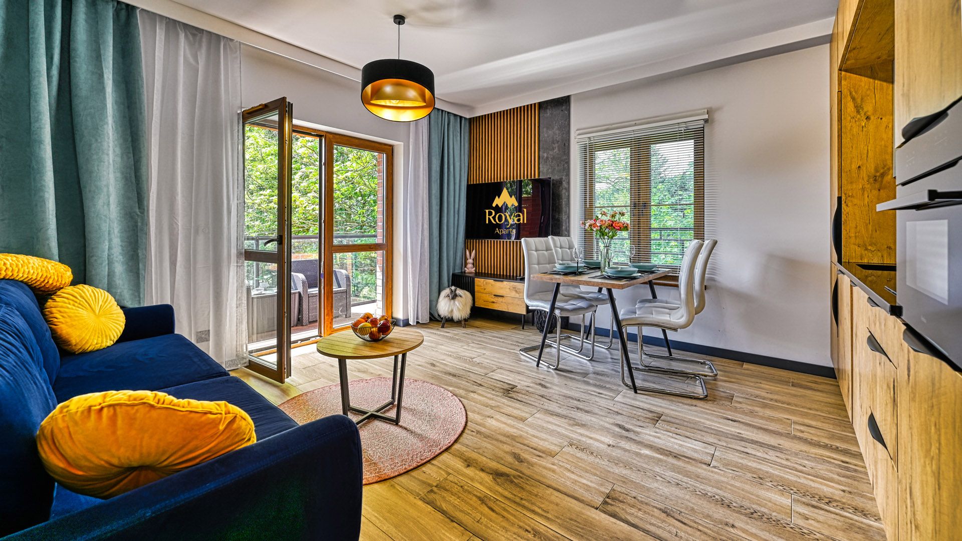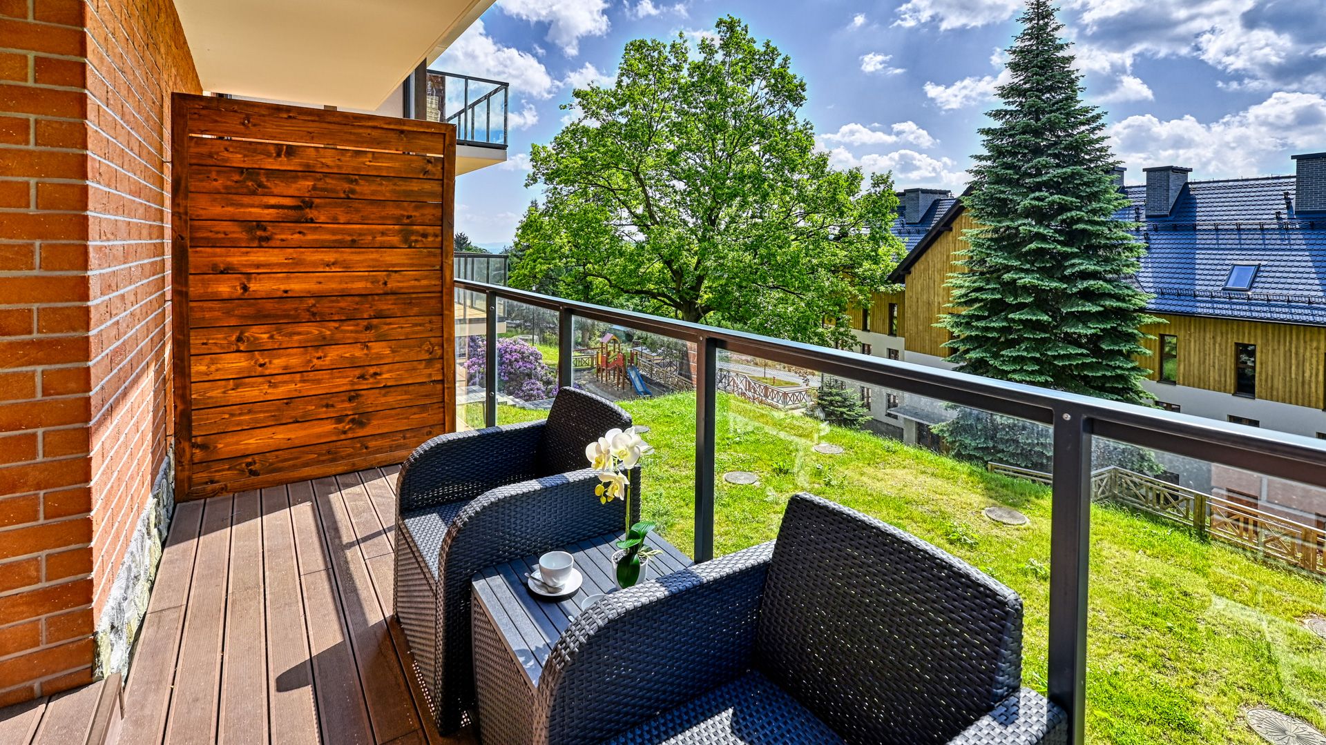 Prezentowany apartament jest częścią prestiżowego kompleksu Green Park Resort położonego w kameralnej i spokojnej części Szklarskiej Poręby. To nowoczesny, pięcioosobowy, w pełni wyposażony lokal o powierzchni 35,4m^2. W sypialni znajduje się duże łóżko małżeńskie, telewizor oraz obszerna szafa. Część dzienna apartamentu składa się z, salonu połączonego z aneksem kuchennym i wyposażona jest w rozkładaną sofę, rozkładany fotel, panoramiczny telewizor oraz stół kuchenny. Całość domyka wykończona w wysokim standardzie łazienka.