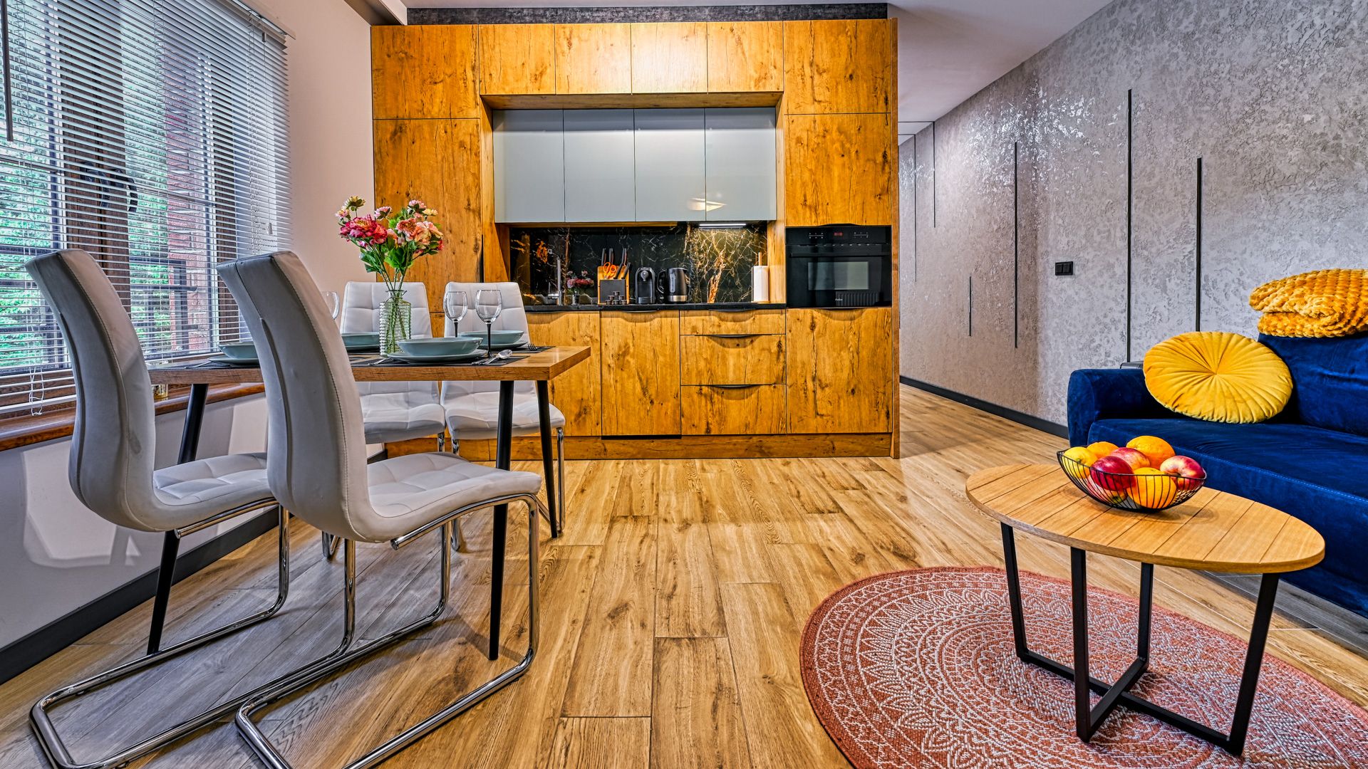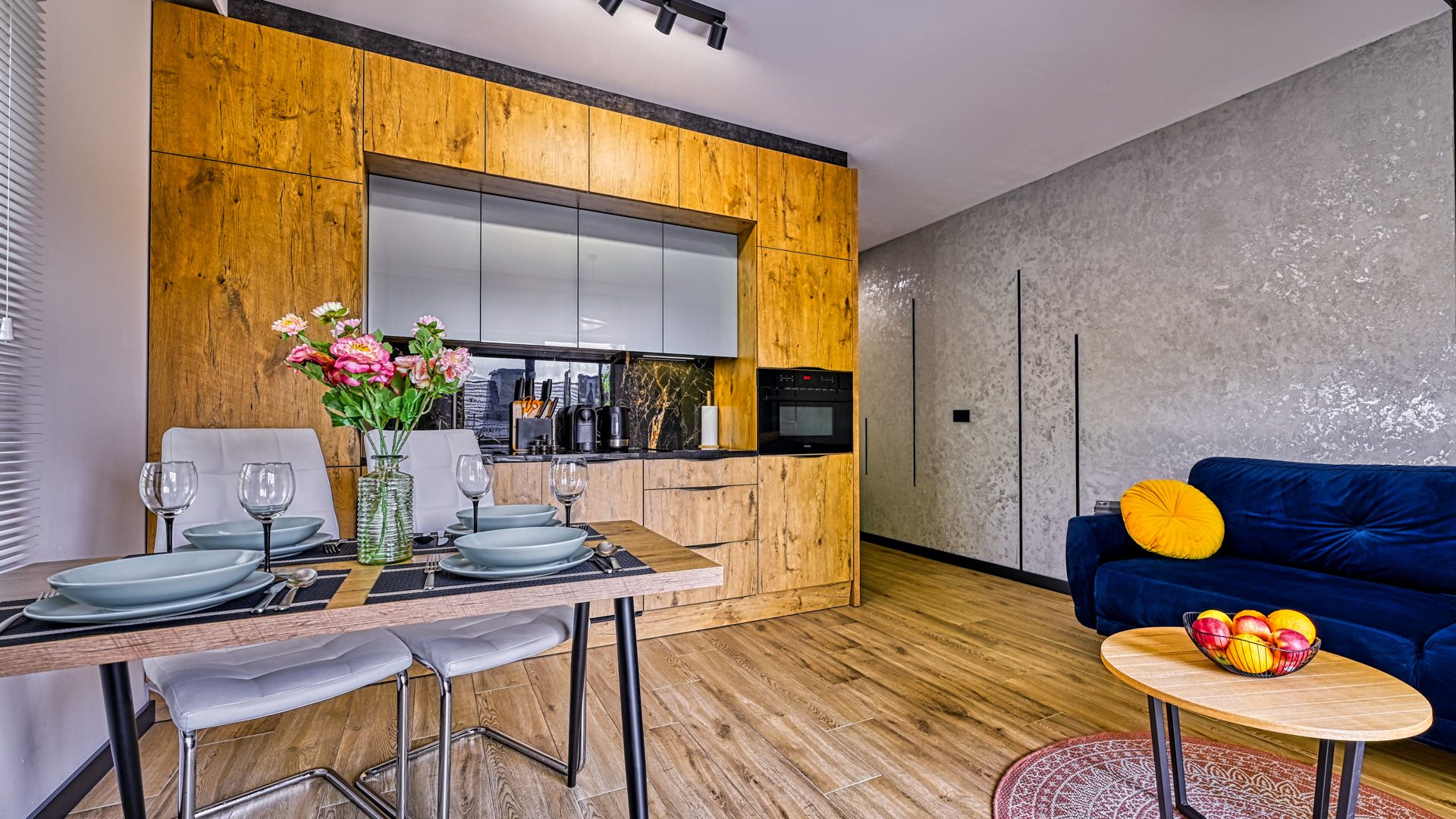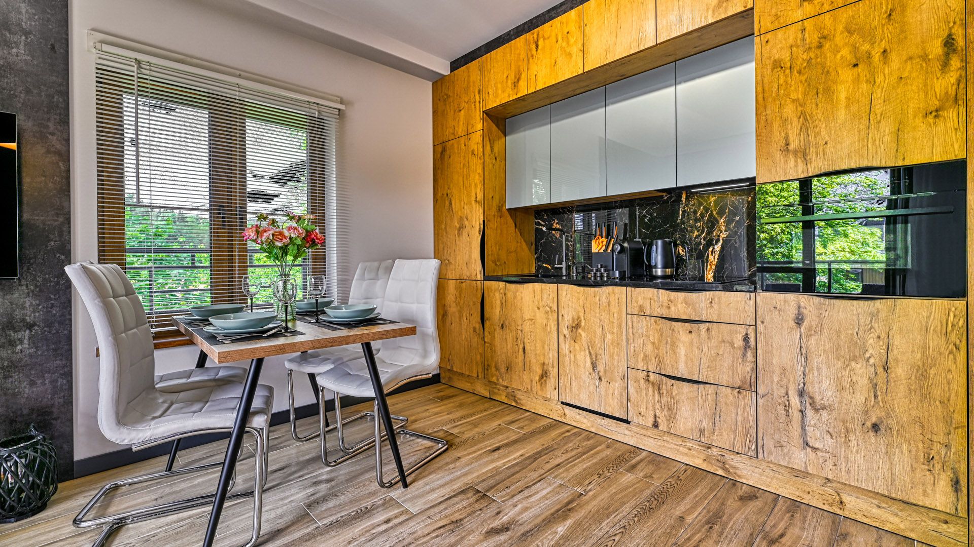 W pełni doposażony aneks kuchenny umożliwi przygotowanie nawet uroczystej kolacji. W skład wyposażenia wchodzą m.in.: talerze i sztućce, płyta kuchenna wraz z garnkami i patelnią, lodówka, zmywarka, mikrofalówka oraz ekspres do kawy.