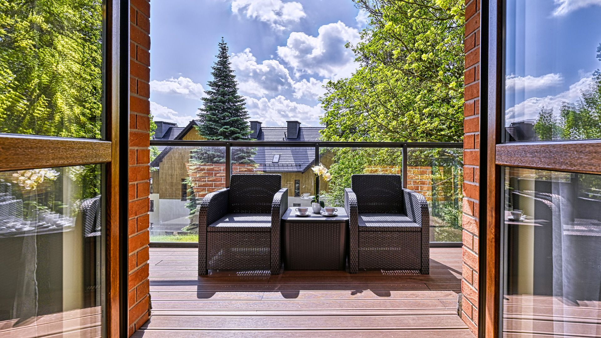 Obszerny balkon z widokiem na górski krajobraz będzie ulubionym miejscem Gości na poranną kawę.