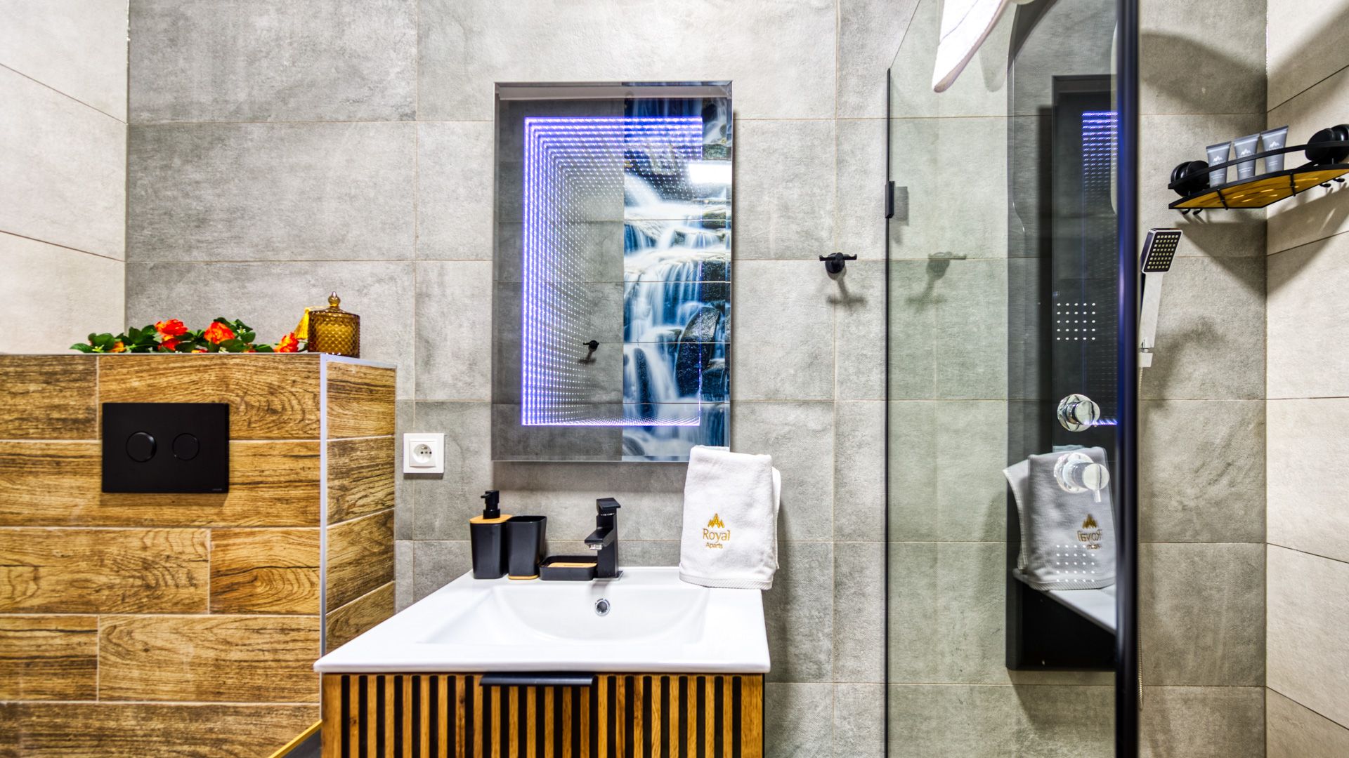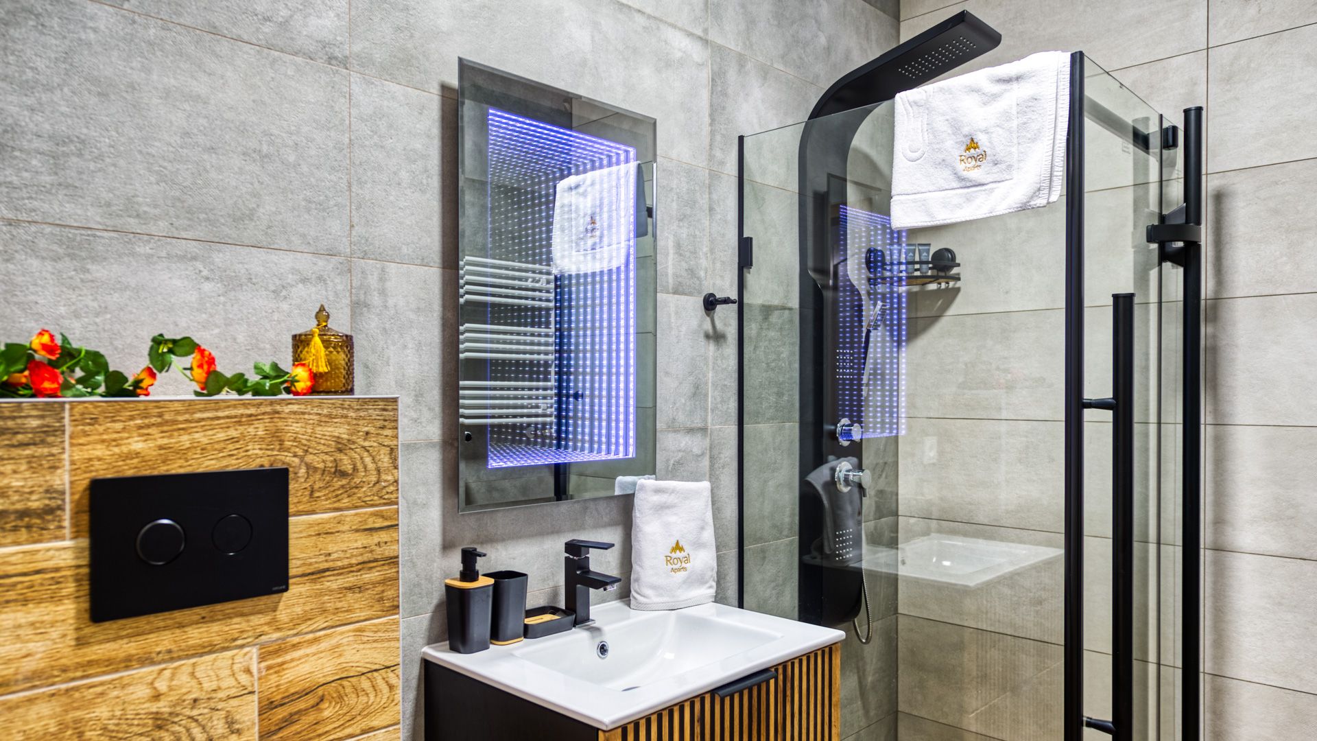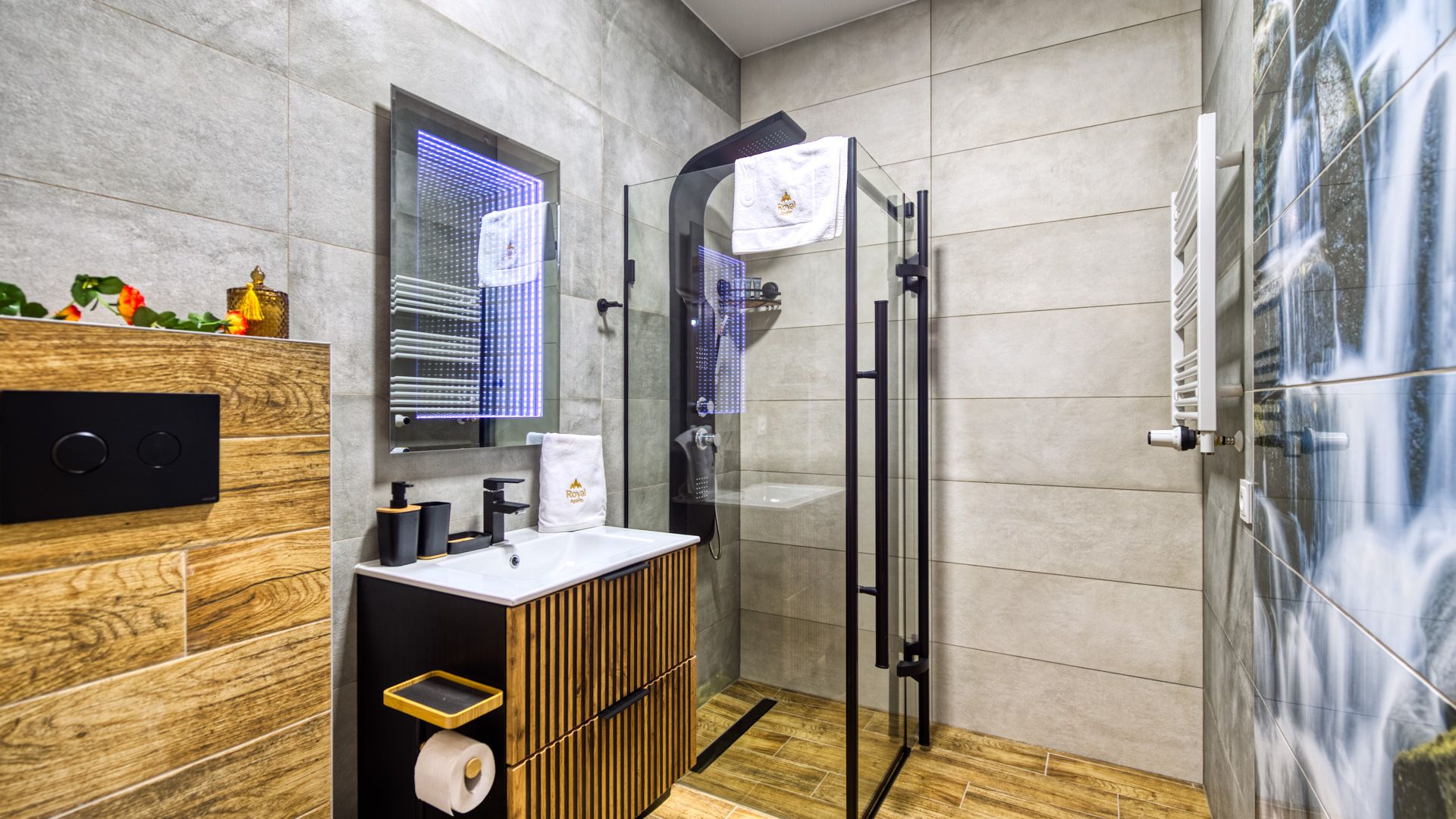 Łazienka apartamentu jest elegancka i wyposażona w prysznic, umywalkę i toaletę. Wszystkie niezbędne ręczniki i przybory toaletowe są dostępne na miejscu, aby zapewnić wygodę i komfort podczas pobytu.
