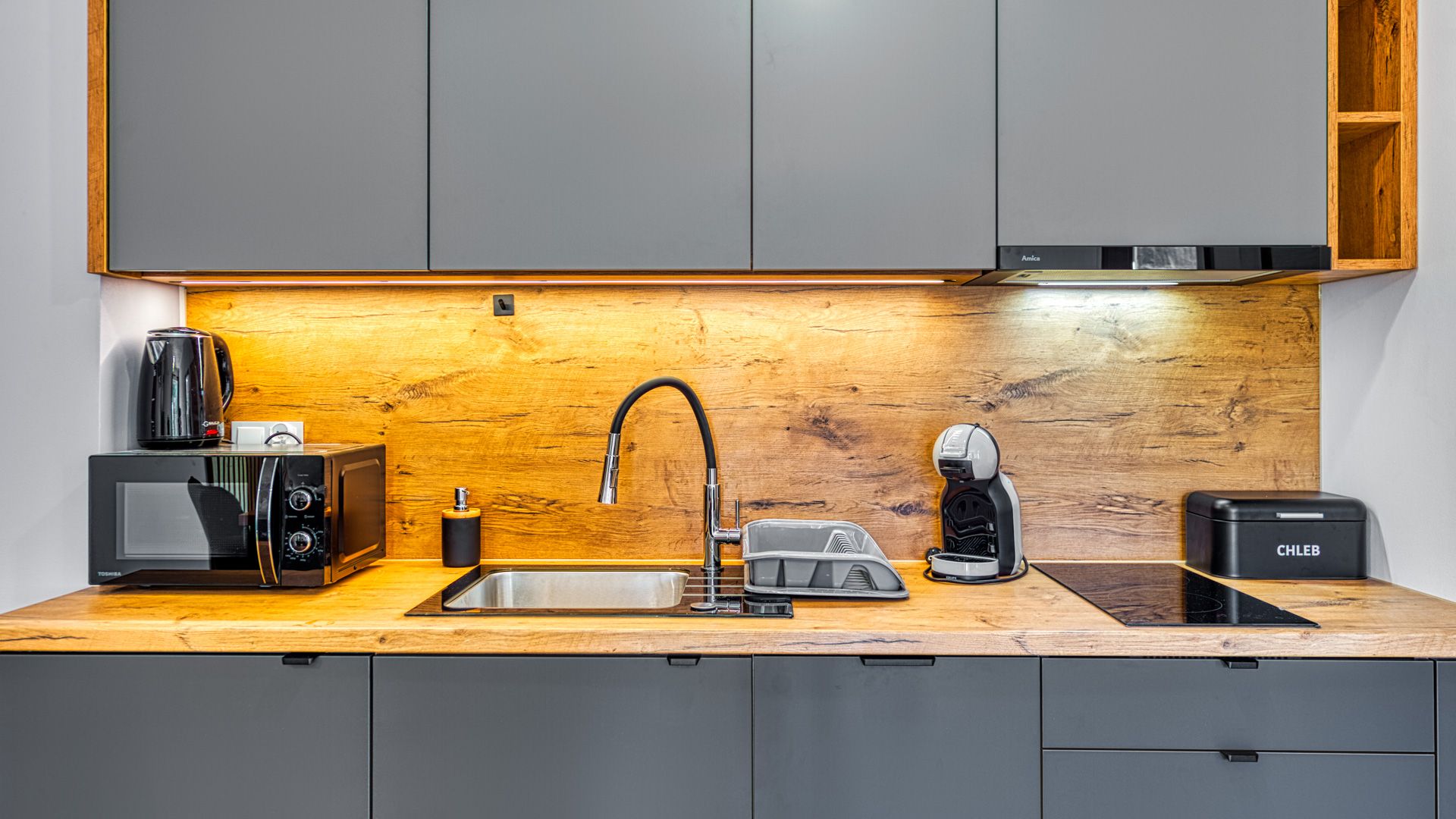 Po wejściu do apartamentu zostaniesz powitany przez przestronny salon z aneksem kuchennym. Salon został urządzony w nowoczesnym stylu z wygodną sofą, idealną do relaksu i spędzania czasu w towarzystwie. Telewizor z płaskim ekranem oraz dostęp do Wi-Fi zapewnią rozrywkę i łączność podczas pobytu.