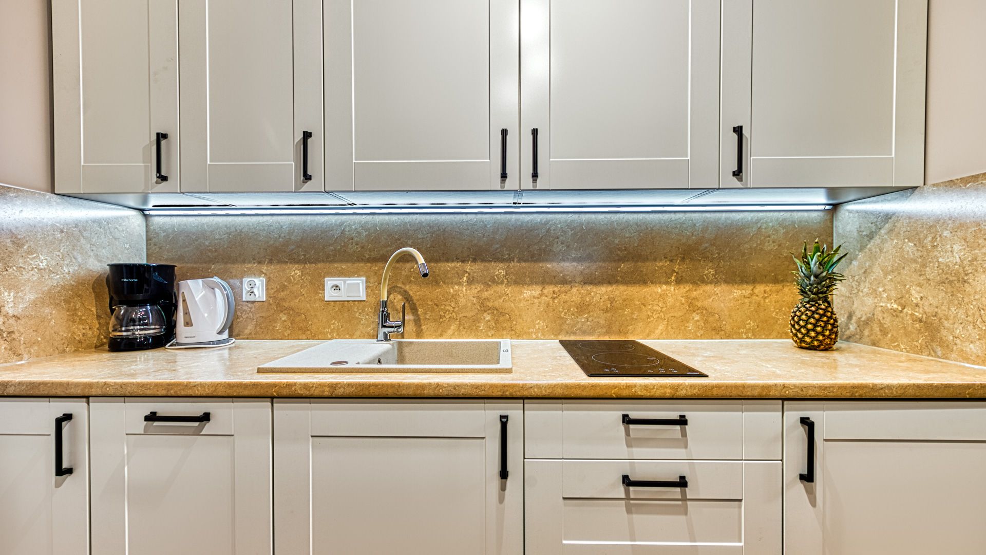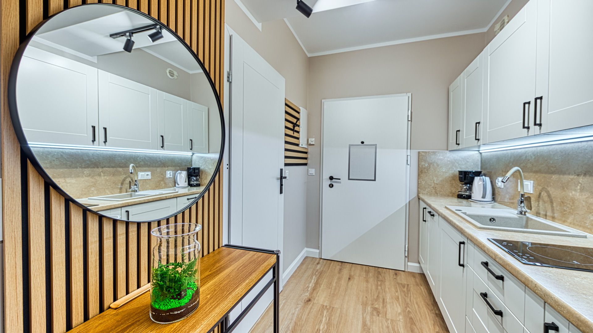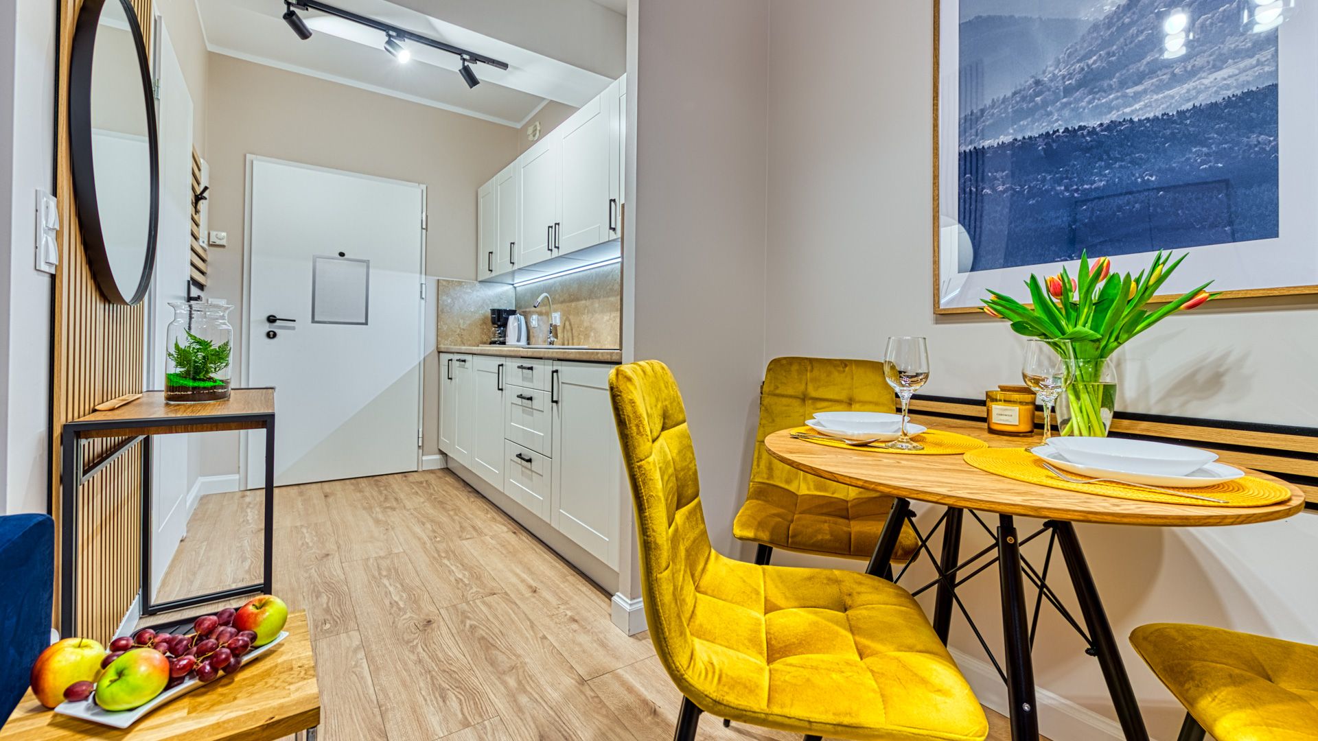 Aneks kuchenny został wyposażony w niezbędne urządzenia i sprzęty kuchenne, umożliwiając przygotowywanie pysznych potraw. To idealne rozwiązanie dla tych, którzy cenią sobie niezależność i możliwość samodzielnego przygotowywania posiłków. Przy stole jadalnym znajduje się miejsce dla wszystkich gości, aby można było wspólnie spożywać posiłki i cieszyć się towarzystwem. W skład wyposażenia apartamentu wchodzą również zmywarka i ekspres do kawy.