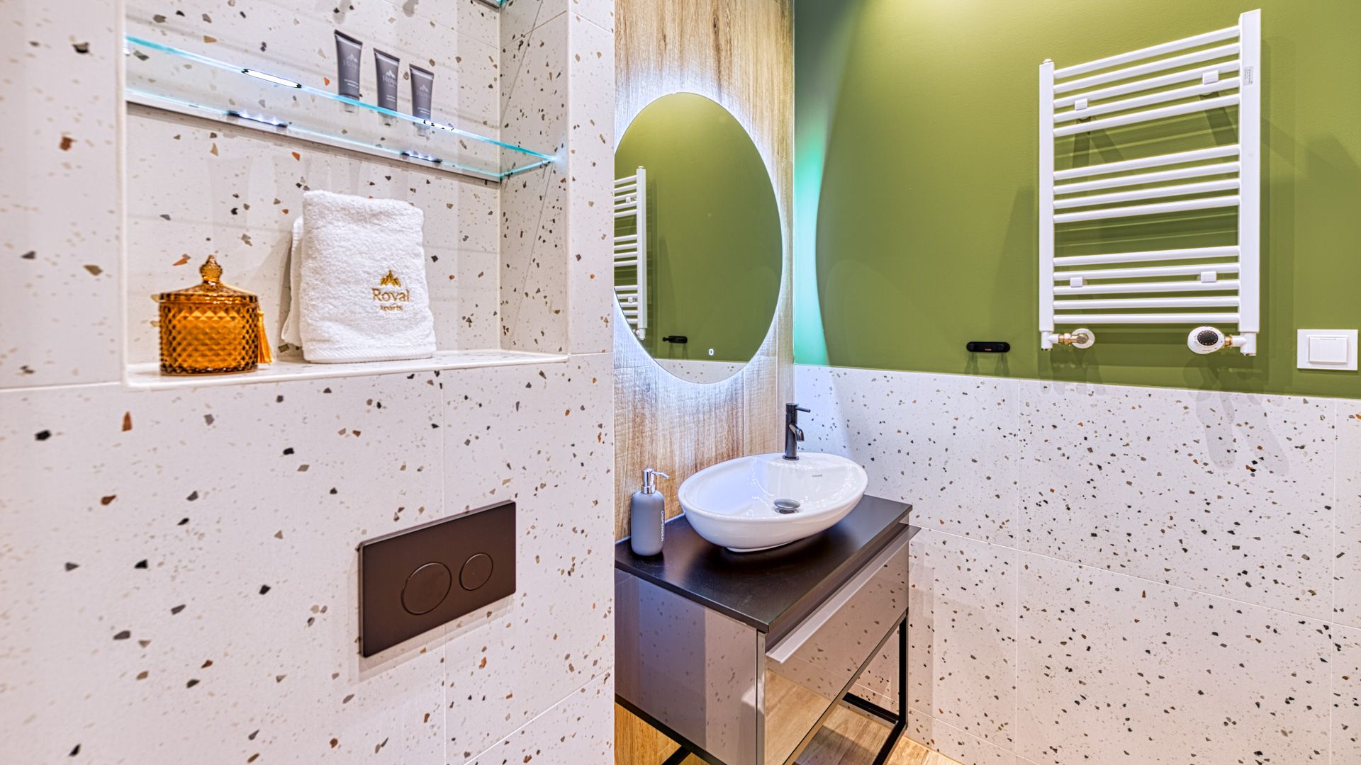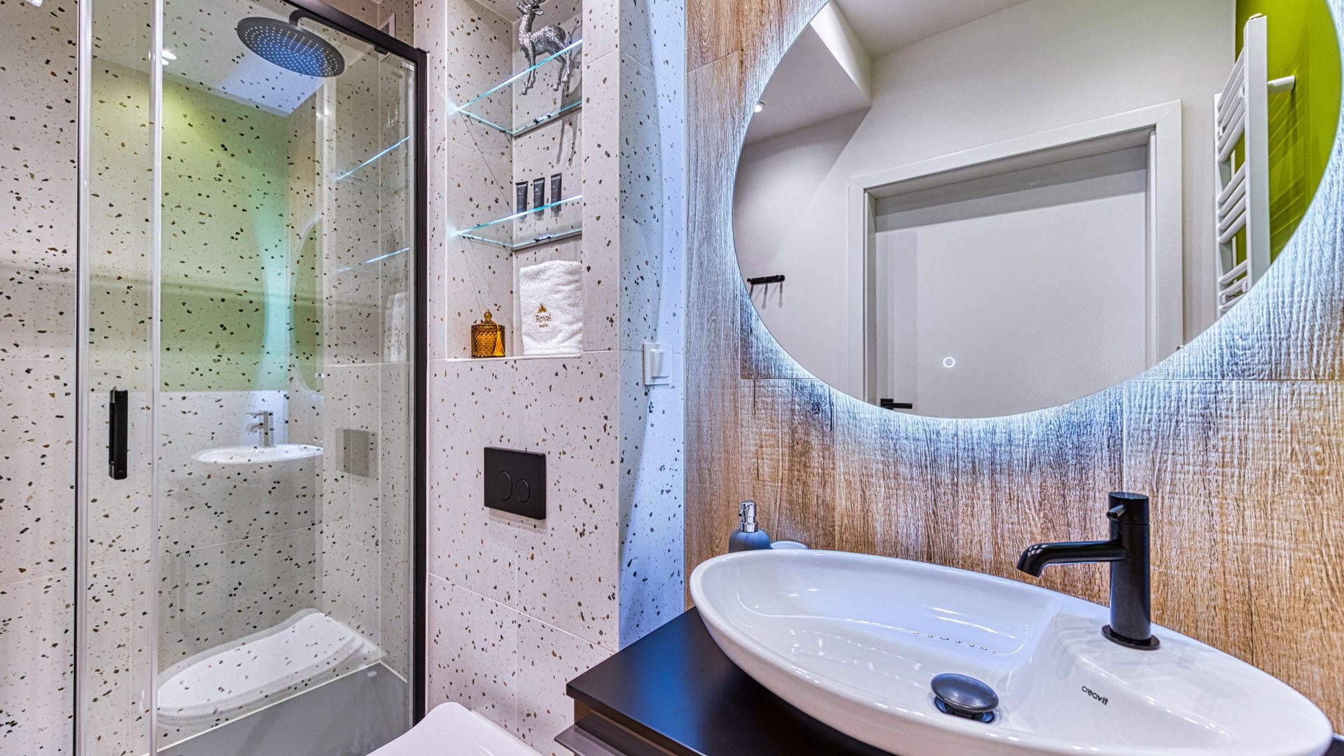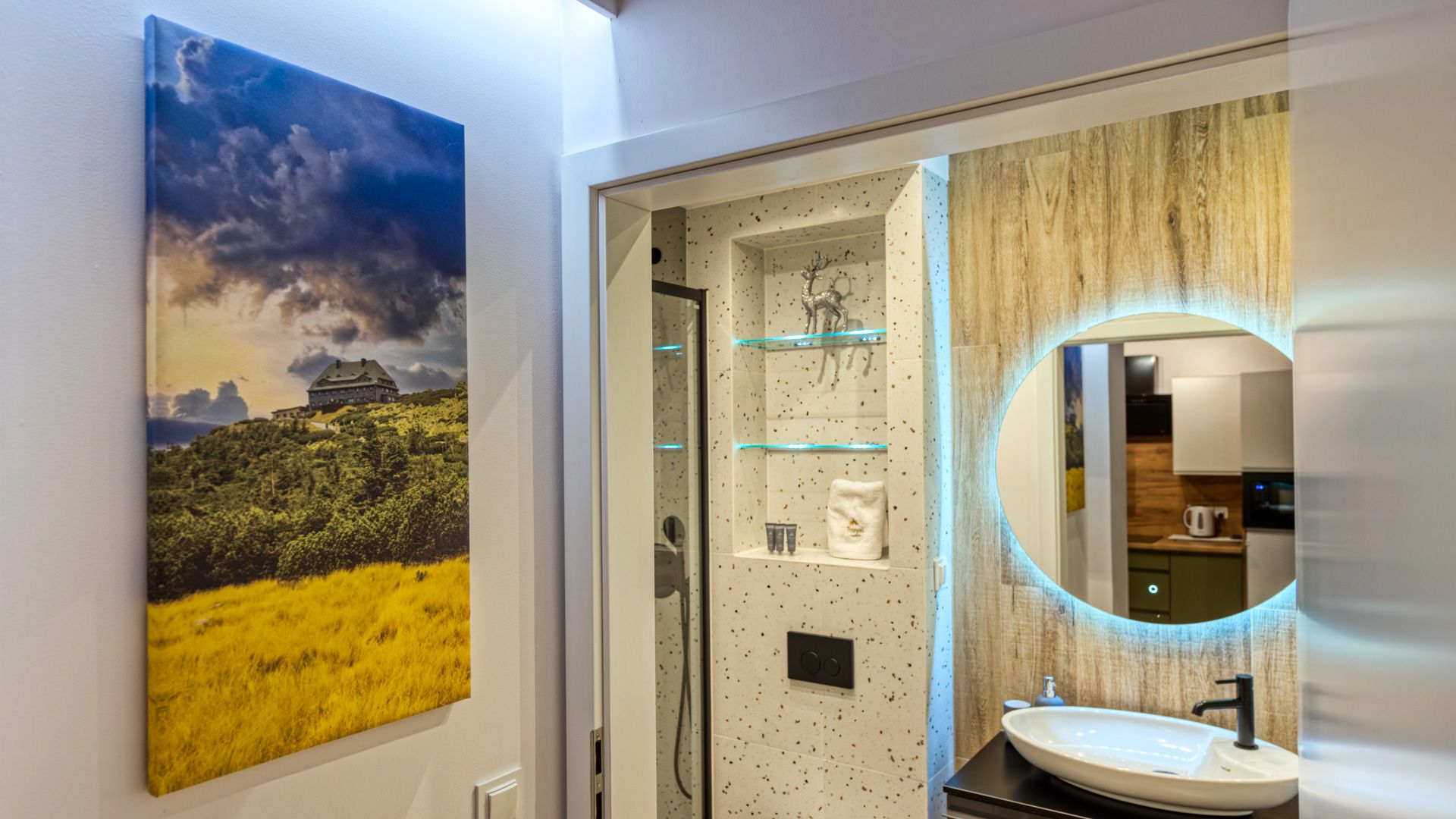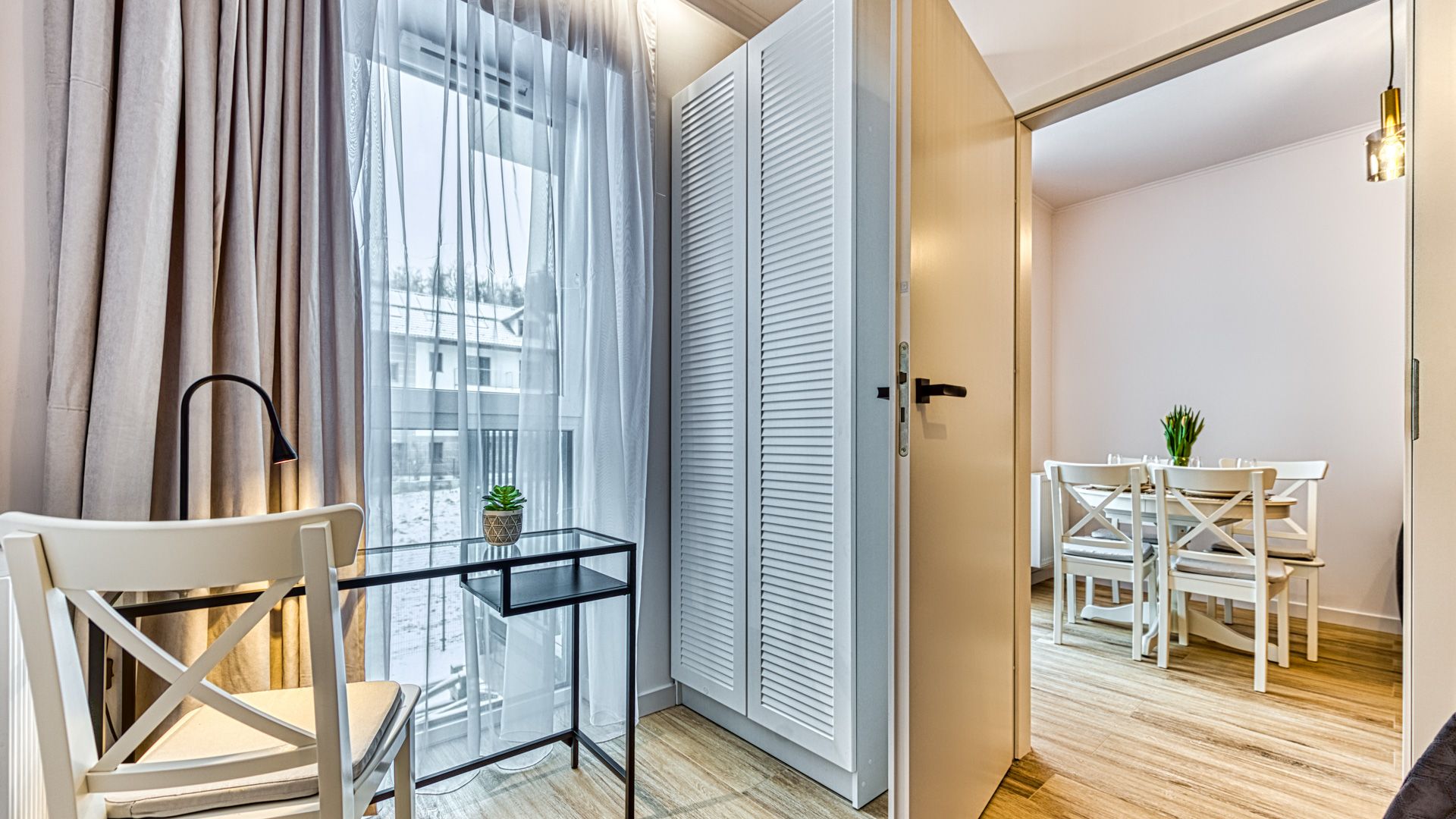 Elementem wyróżniającym ten apartament jest elektryczny kominek, dodający uroku i ciepła oraz tworzący przytulną atmosferę do relaksu i spędzania miłych chwil.