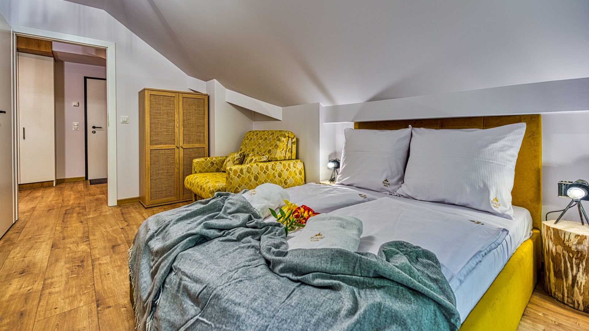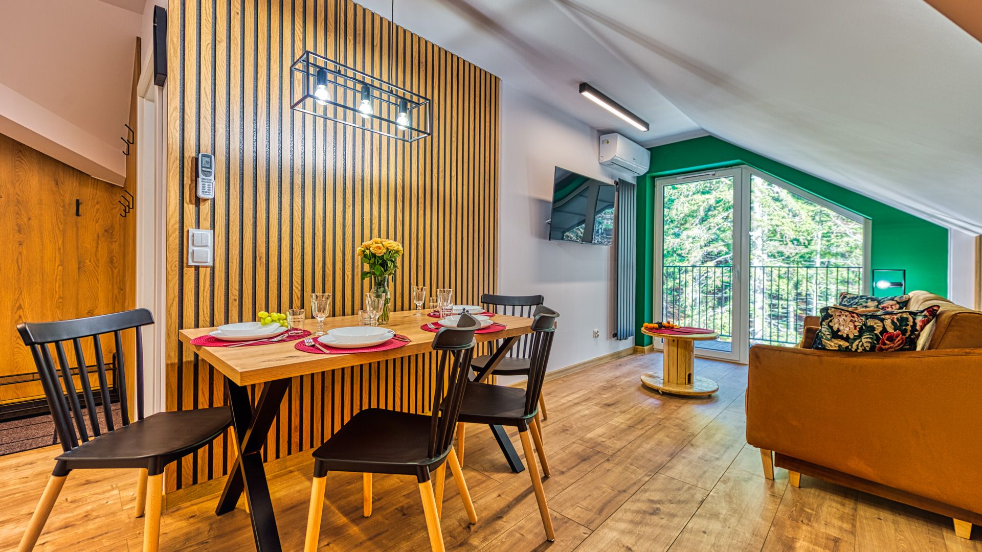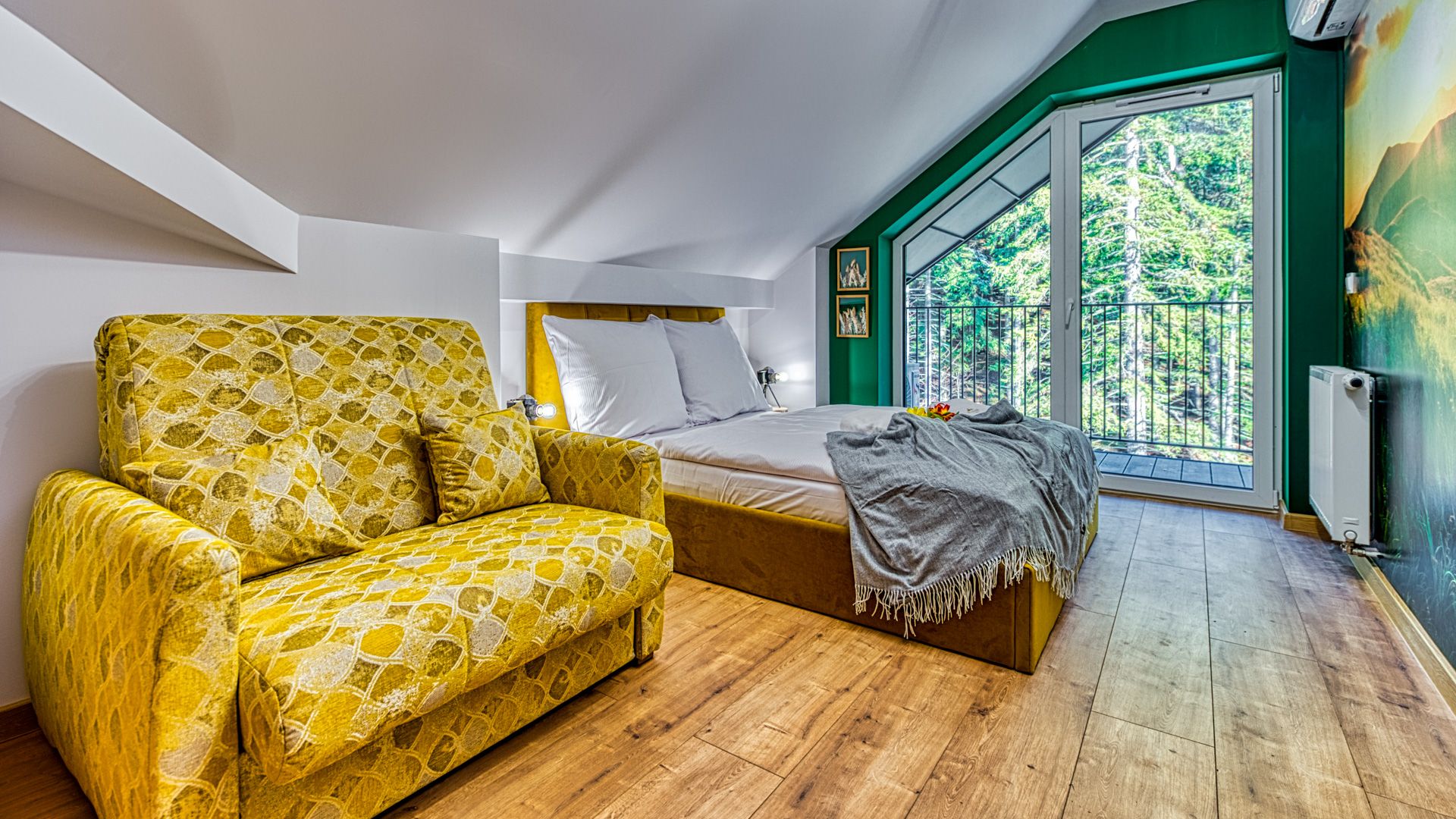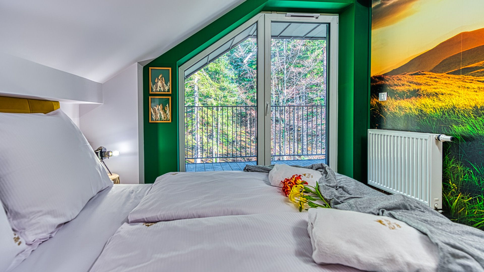 Otwierając drzwi balkonowe, możesz cieszyć się świeżym powietrzem i widokiem na ogród. To idealne miejsce, aby wypić poranną kawę lub delektować się romantyczną kolacją przy zachodzie słońca.