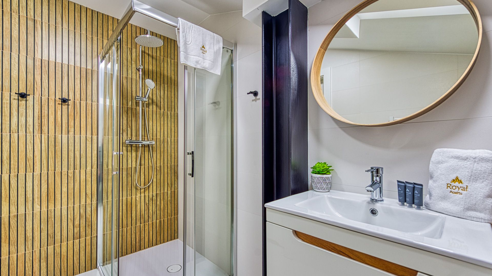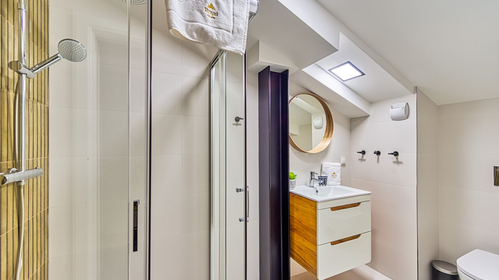 Łazienka apartamentu jest elegancka i wyposażona w prysznic, umywalkę i toaletę. Wszystkie niezbędne ręczniki i przybory toaletowe są dostępne na miejscu, aby zapewnić wygodę i komfort podczas pobytu.