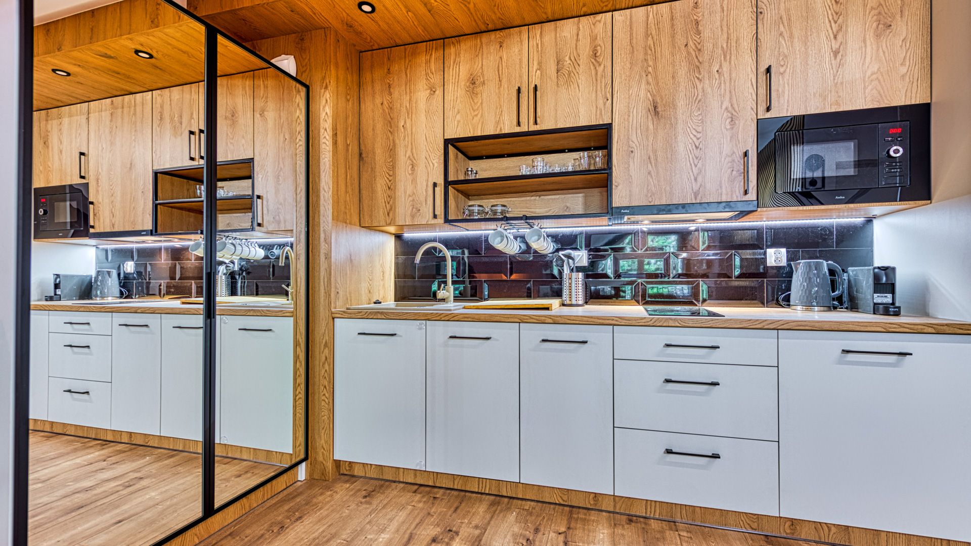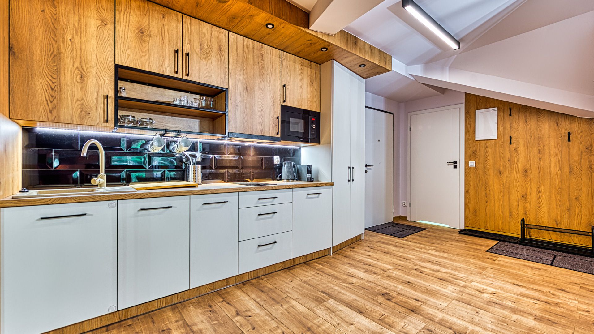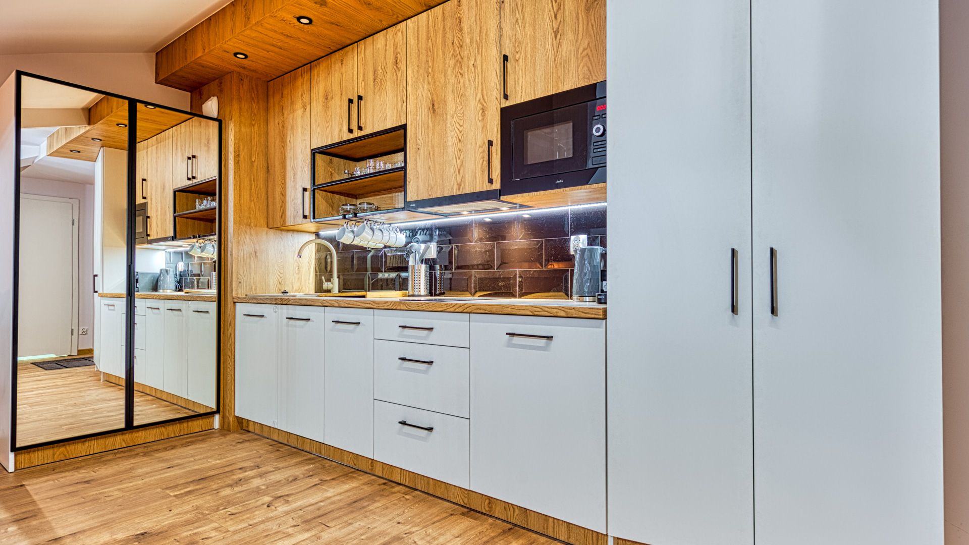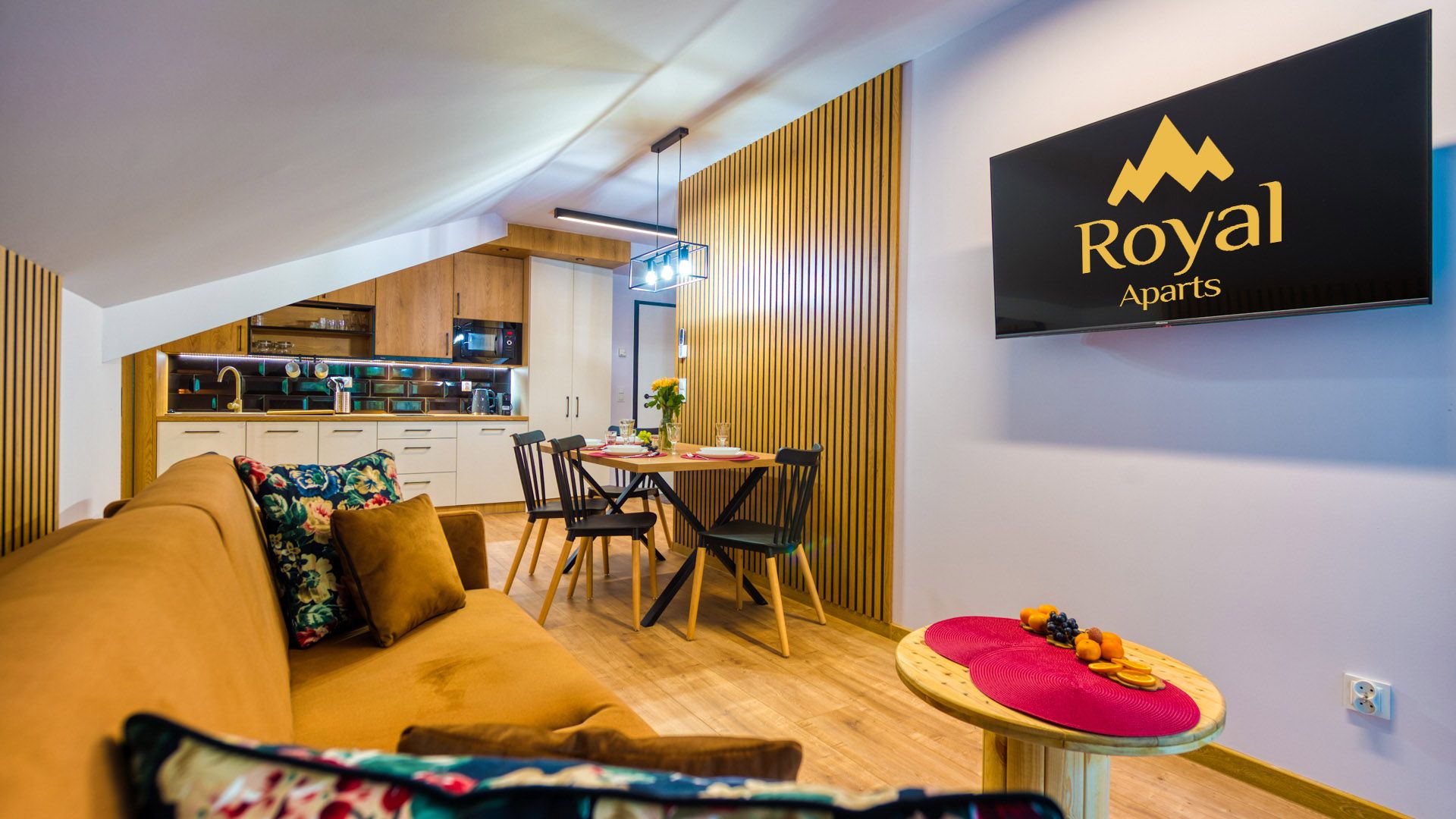 Po wejściu do apartamentu zostaniesz powitany przez przestronny salon z aneksem kuchennym. Salon został urządzony w nowoczesnym stylu z wygodną sofą, idealną do relaksu i spędzania czasu w towarzystwie. Telewizor z płaskim ekranem oraz dostęp do Wi-Fi zapewnią rozrywkę i łączność podczas pobytu.