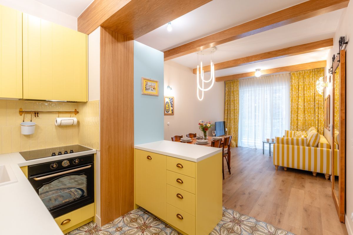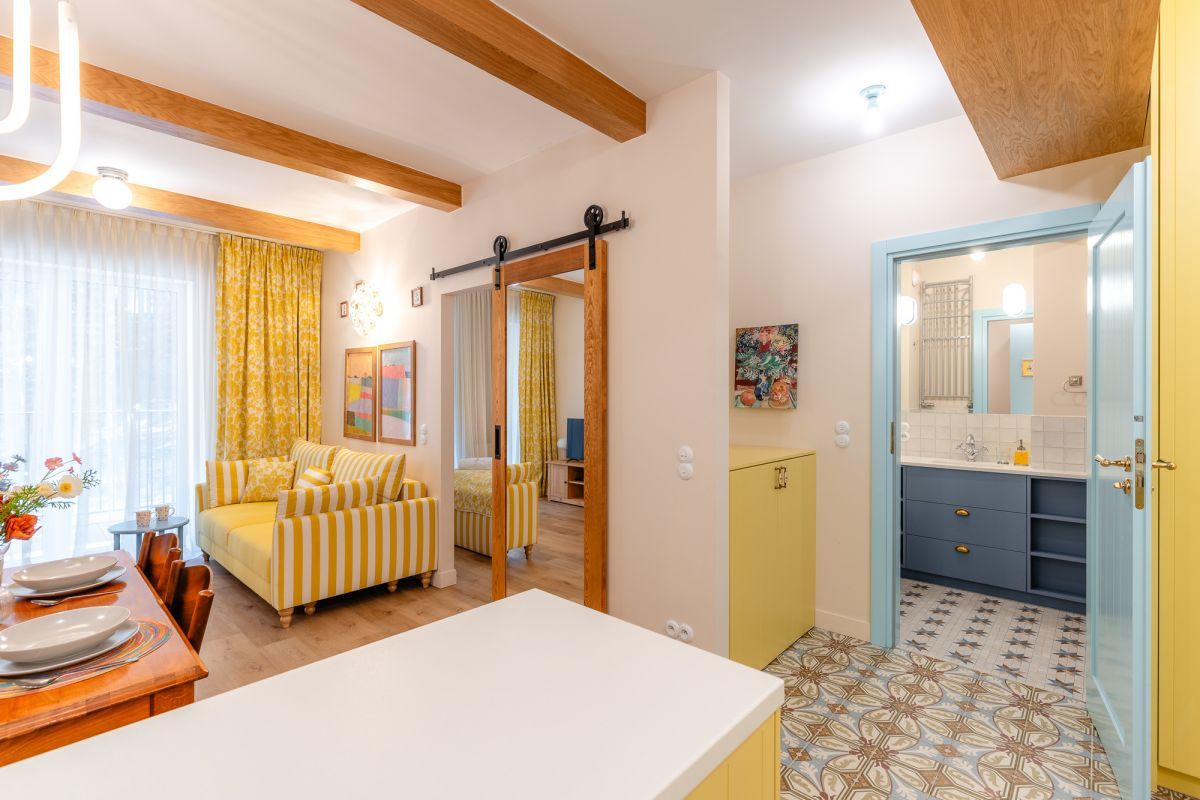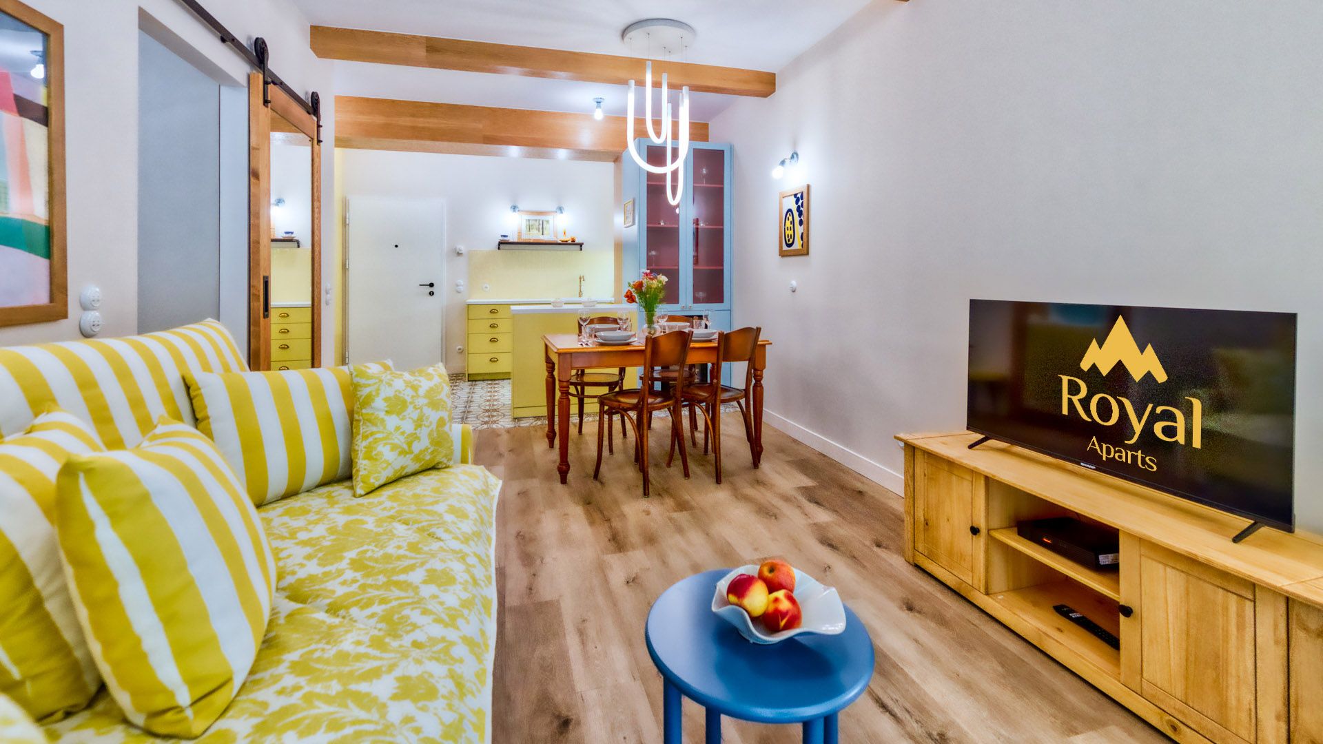 Po wejściu do apartamentu zostaniesz powitany przez przestronny salon z aneksem kuchennym. Salon został urządzony w nowoczesnym stylu z wygodną sofą, idealną do relaksu i spędzania czasu w towarzystwie. Telewizor z płaskim ekranem oraz dostęp do Wi-Fi zapewnią rozrywkę i łączność podczas pobytu.