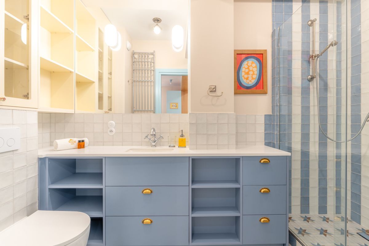 Łazienka apartamentu jest elegancka i wyposażona w prysznic, umywalkę i toaletę. Wszystkie niezbędne ręczniki i przybory toaletowe są dostępne na miejscu, aby zapewnić wygodę i komfort podczas pobytu.