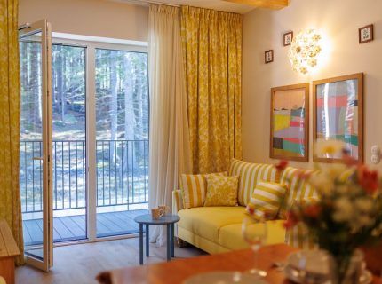 Otwierając drzwi balkonowe, możesz cieszyć się świeżym powietrzem i widokiem na las. To idealne miejsce, aby wypić poranną kawę lub delektować się romantyczną kolacją przy zachodzie słońca.