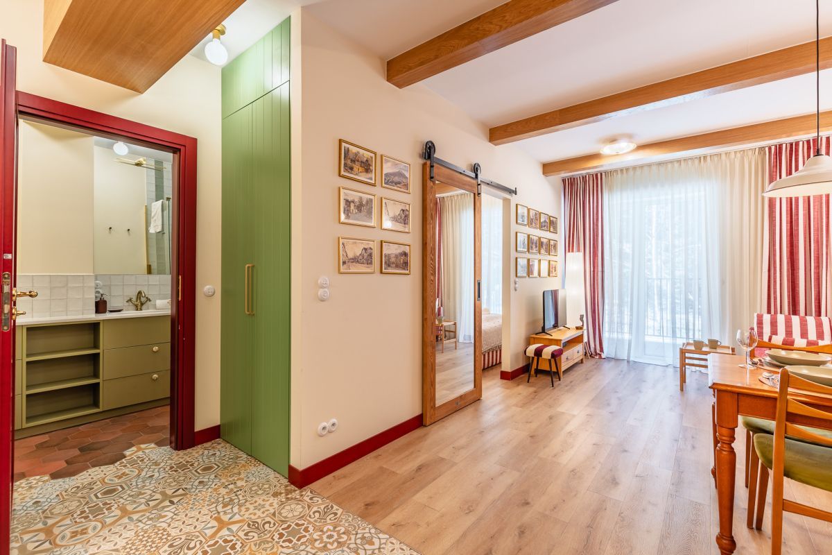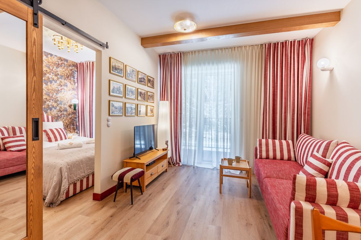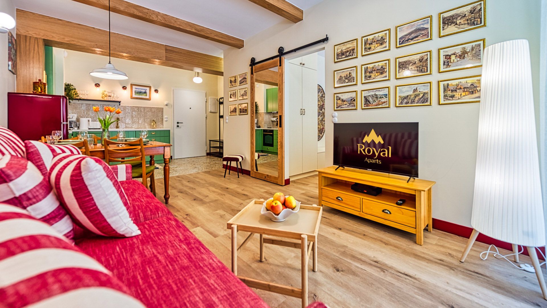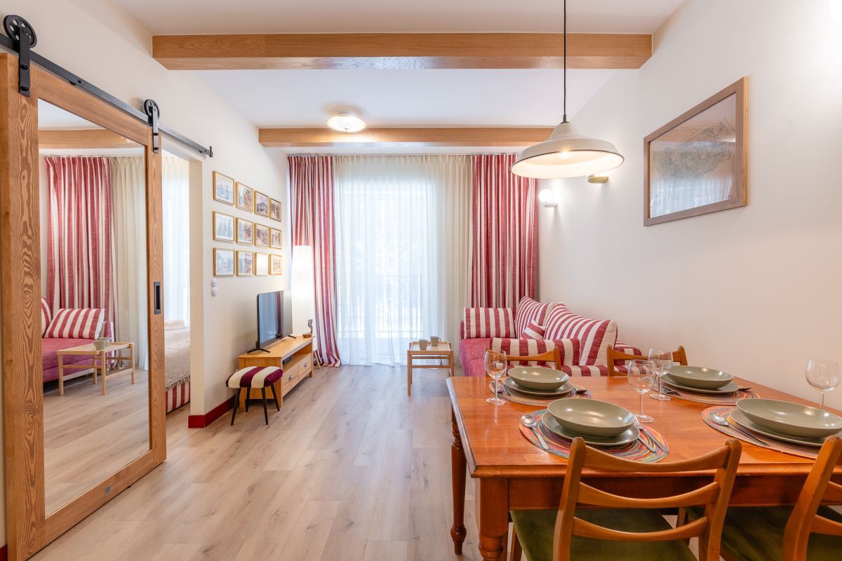 Po wejściu do apartamentu zostaniesz powitany przez przestronny salon z aneksem kuchennym. Salon został urządzony w nowoczesnym stylu z wygodną sofą, idealną do relaksu i spędzania czasu w towarzystwie. Telewizor z płaskim ekranem oraz dostęp do Wi-Fi zapewnią rozrywkę i łączność podczas pobytu.
