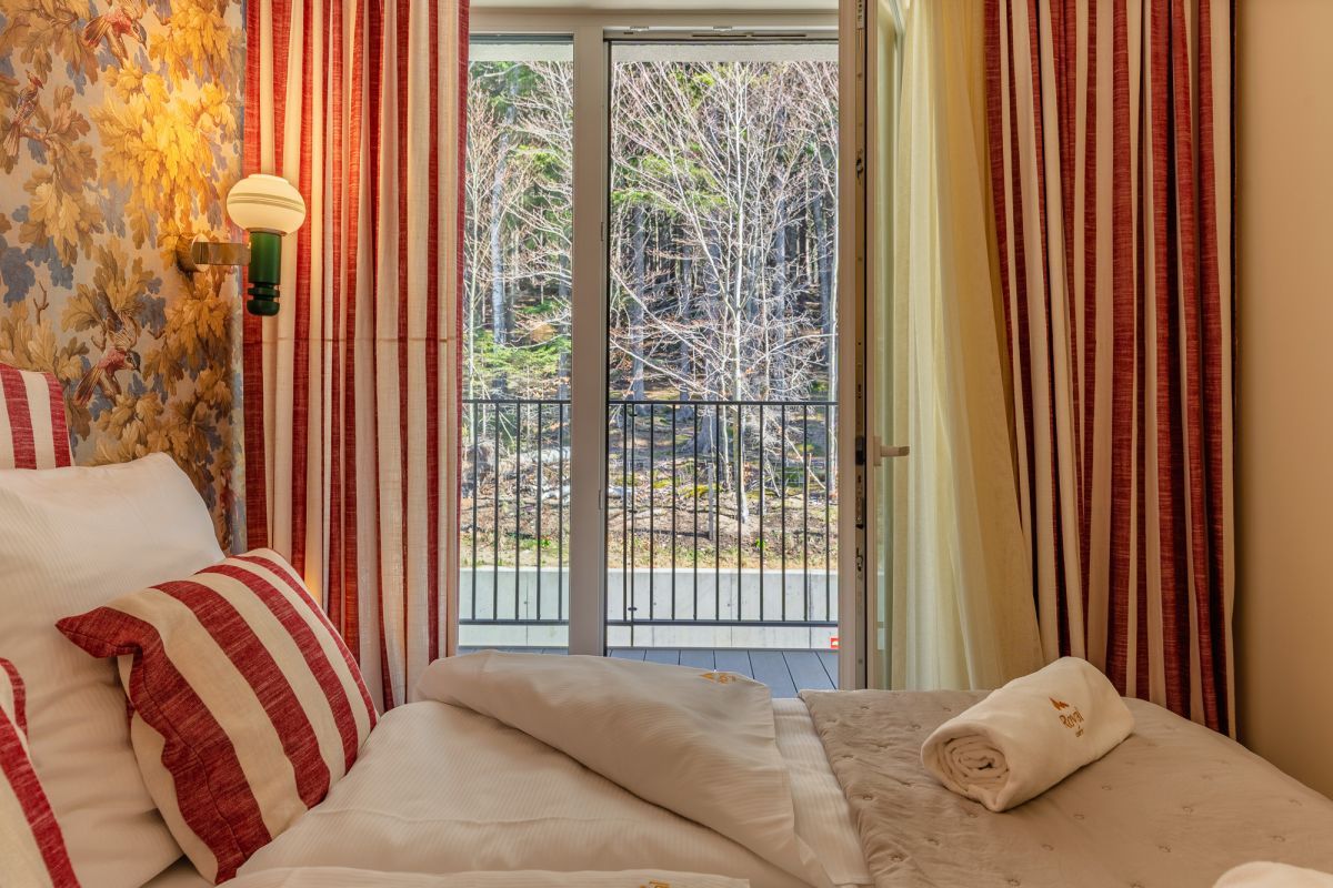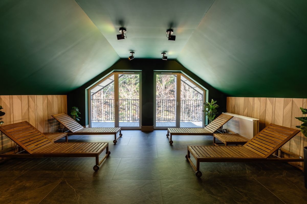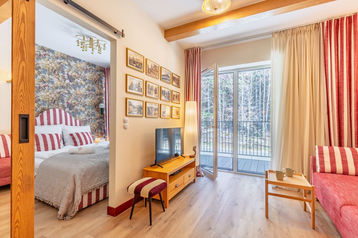 Otwierając drzwi balkonowe, możesz cieszyć się świeżym powietrzem i widokiem na las. To idealne miejsce, aby wypić poranną kawę lub delektować się romantyczną kolacją przy zachodzie słońca.