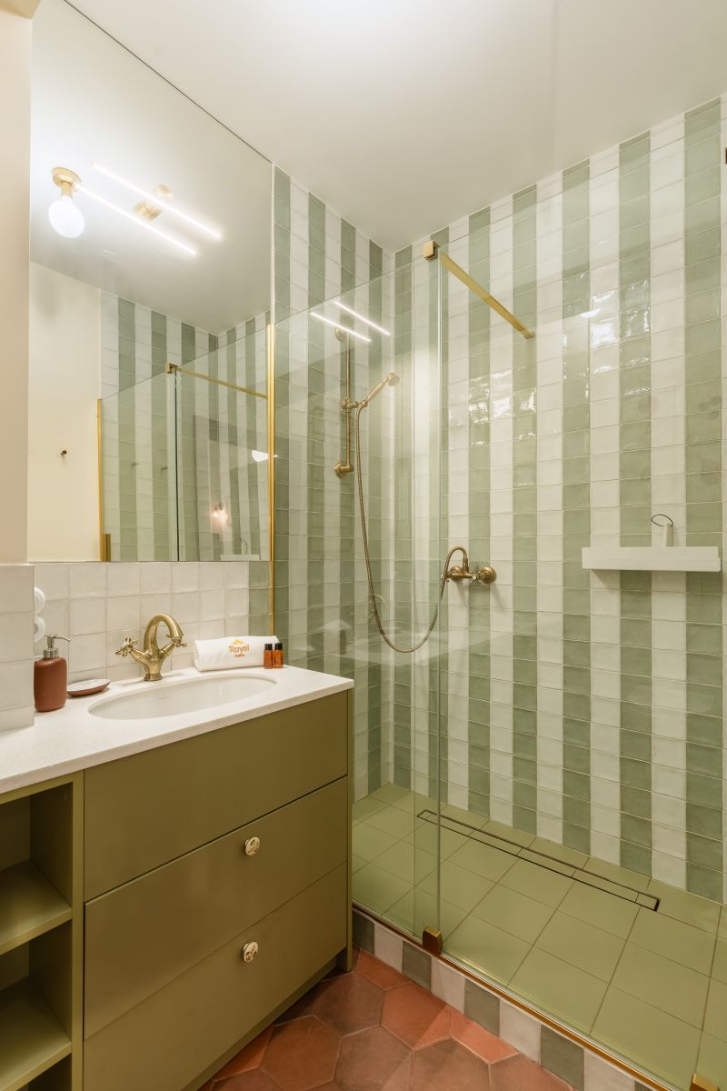 Łazienka apartamentu jest elegancka i wyposażona w prysznic, umywalkę i toaletę. Wszystkie niezbędne ręczniki i przybory toaletowe są dostępne na miejscu, aby zapewnić wygodę i komfort podczas pobytu.