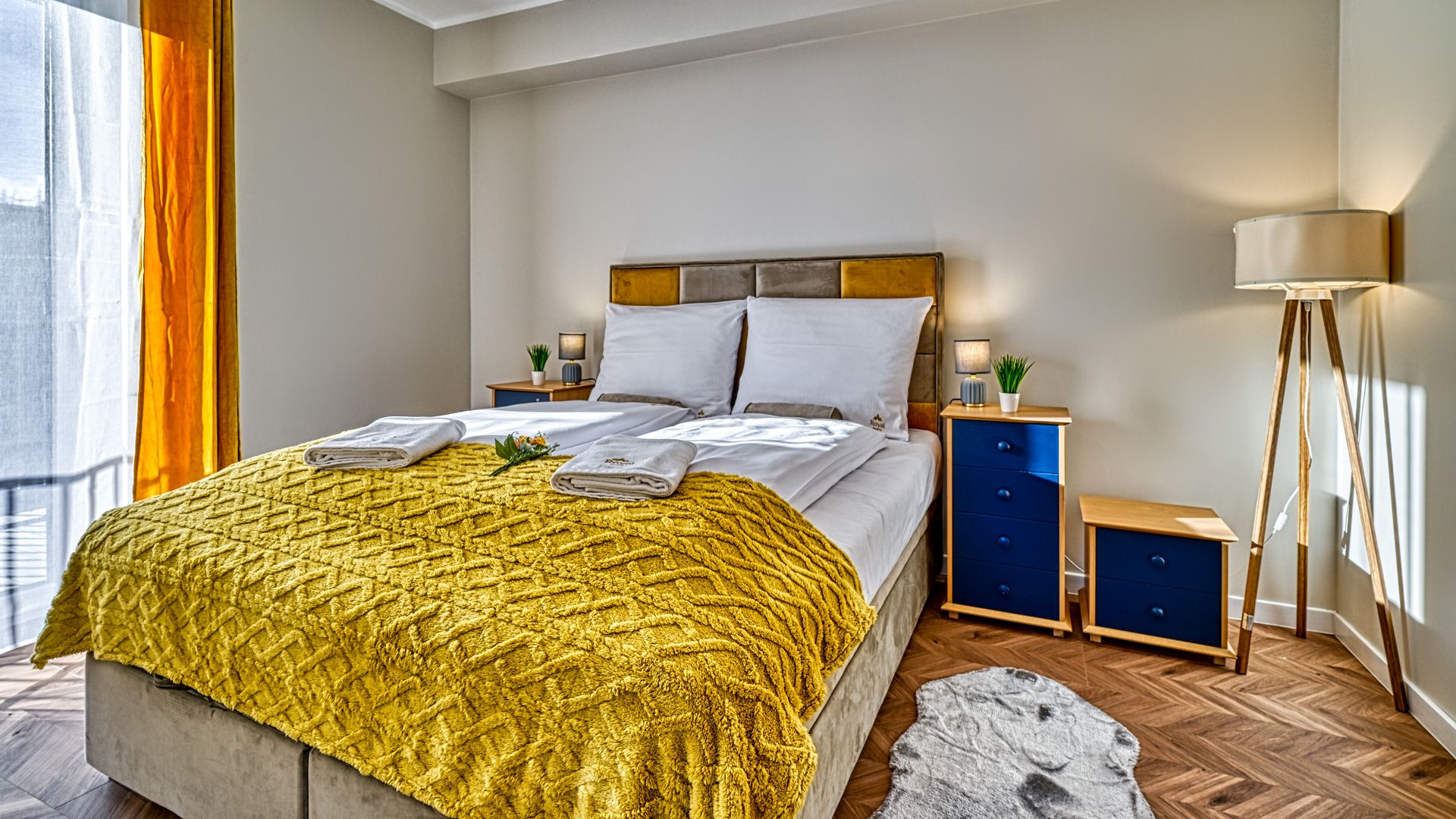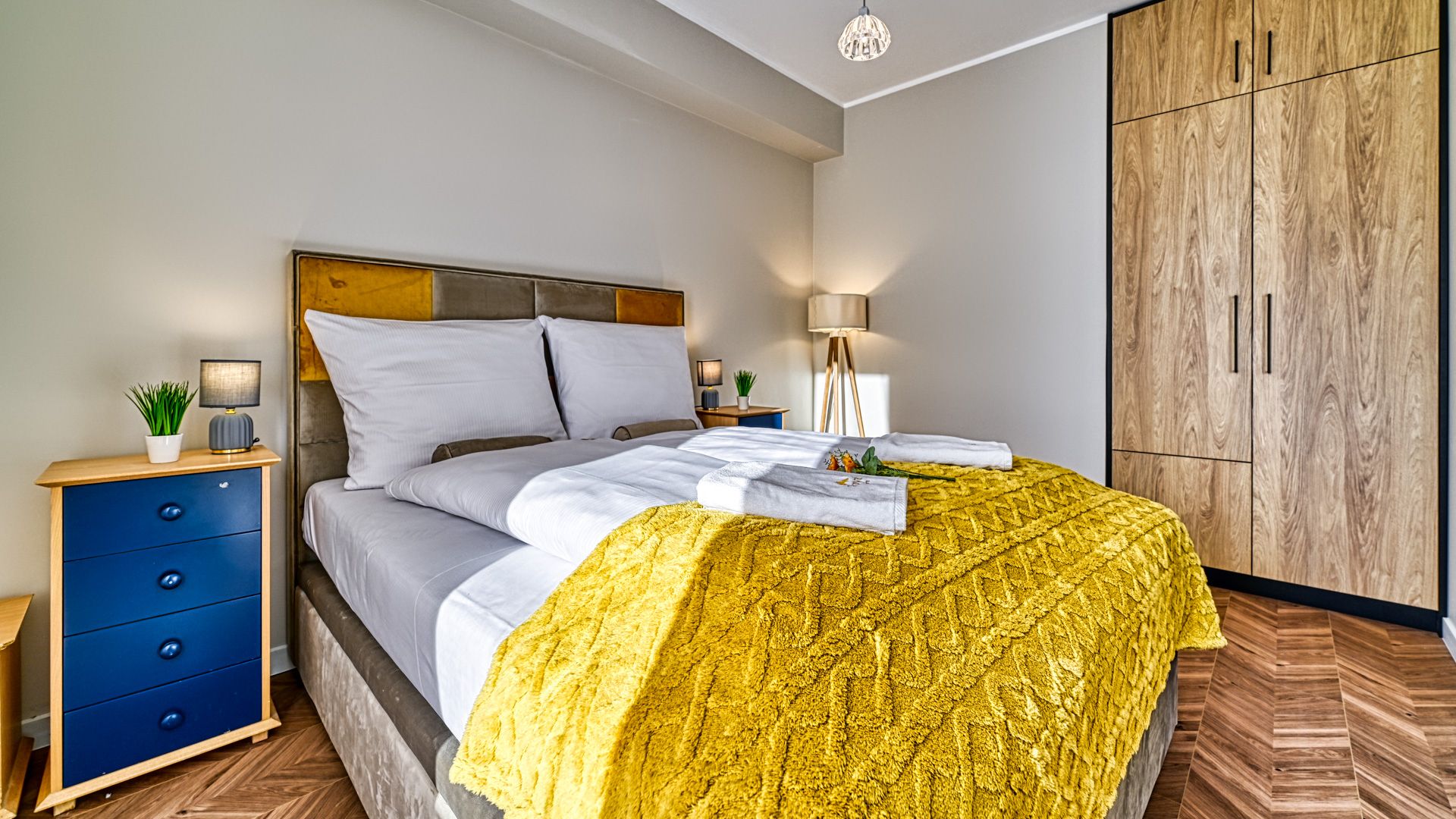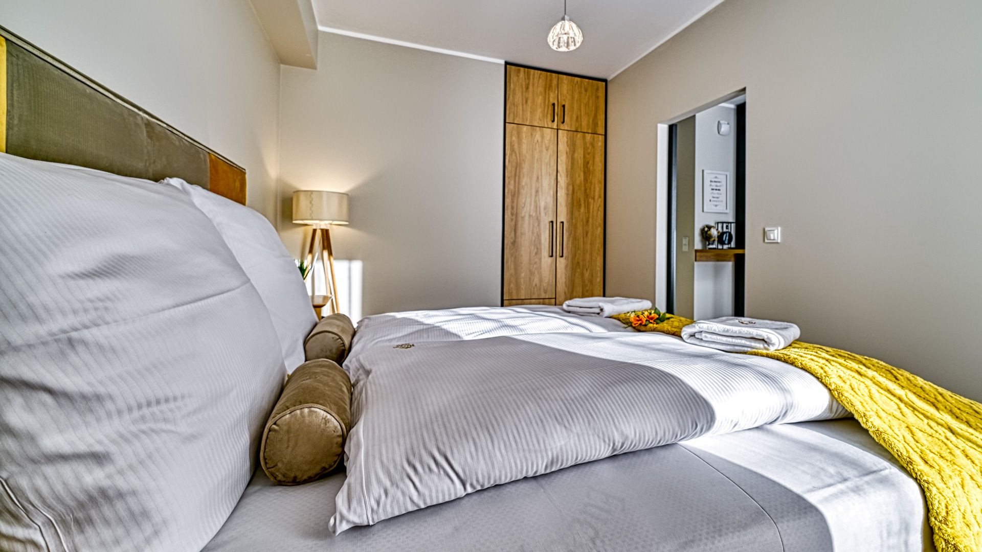Apartament posiada dwie przytulne sypialnie. W pierwszej z nich znajduje się duże łóżko małżeńskie oraz pojemna szafa, która umożliwi wygodne przechowywanie ubrań i rzeczy osobistych. Druga sypialnia została wyposażona w sofę, fotel oraz biurko, co czyni ją idealnym miejscem zarówno do relaksu, jak i do pracy.