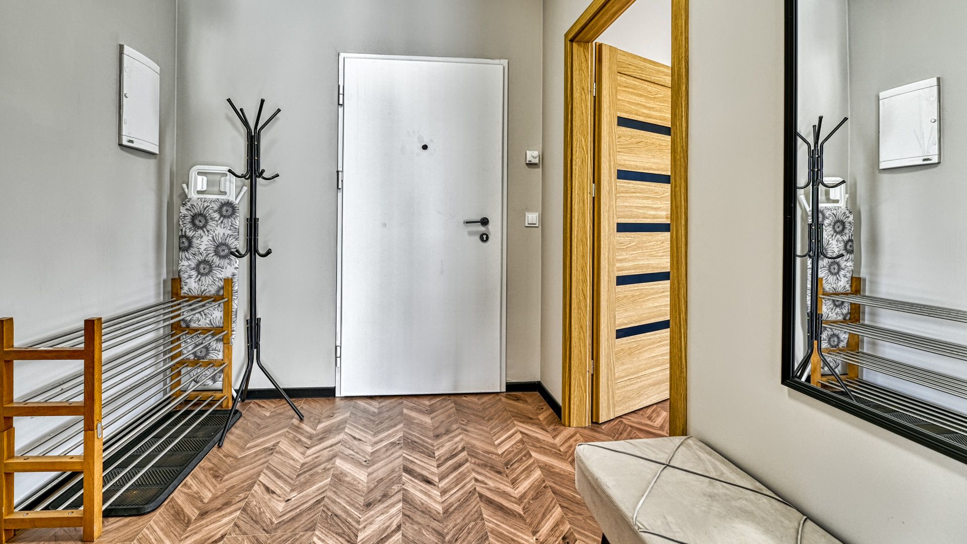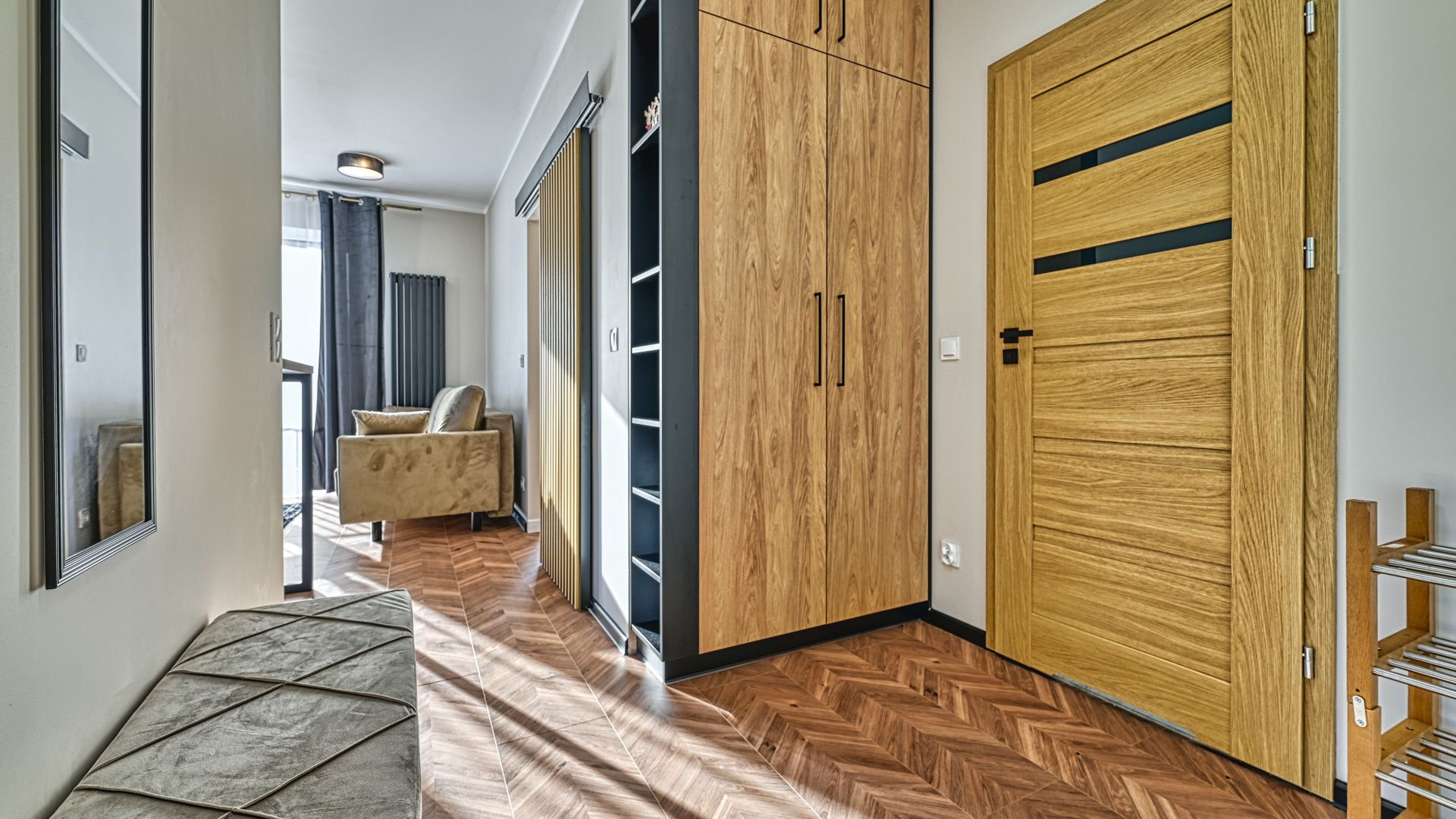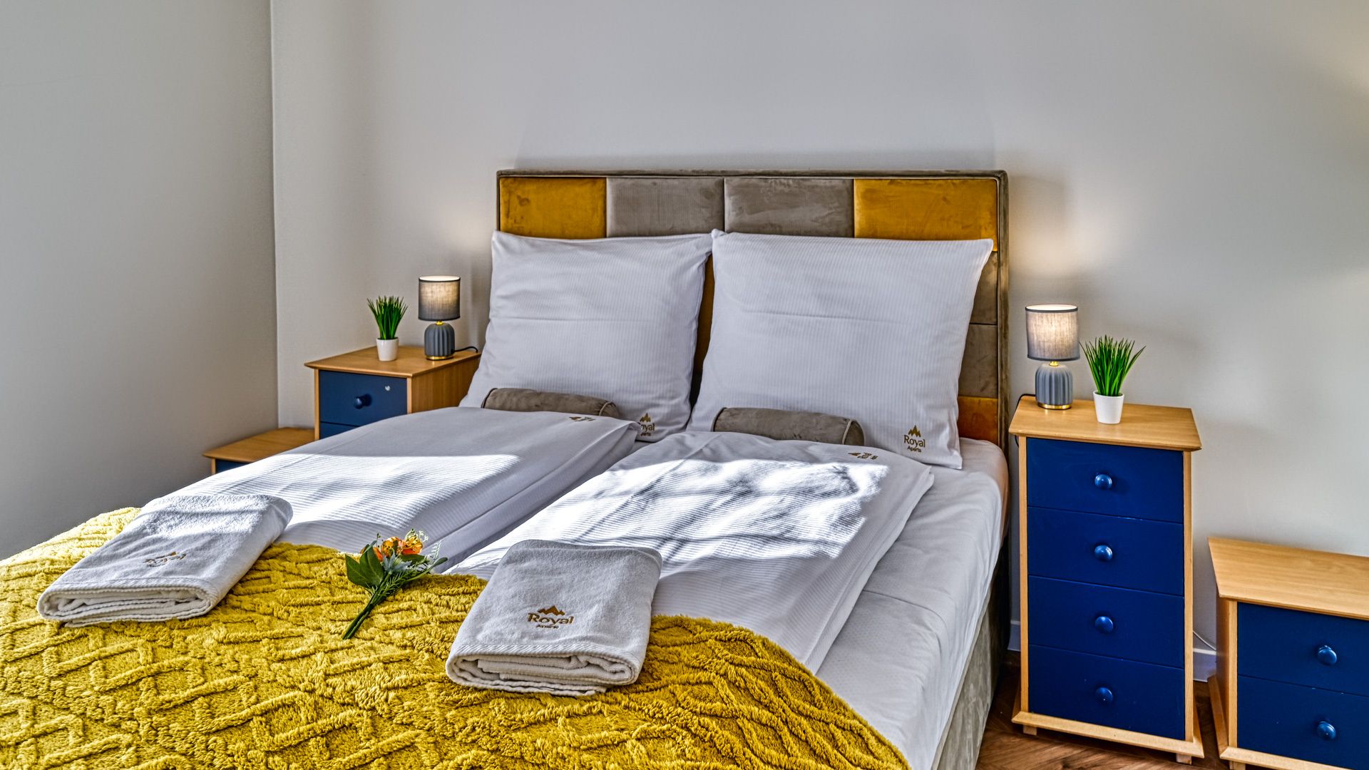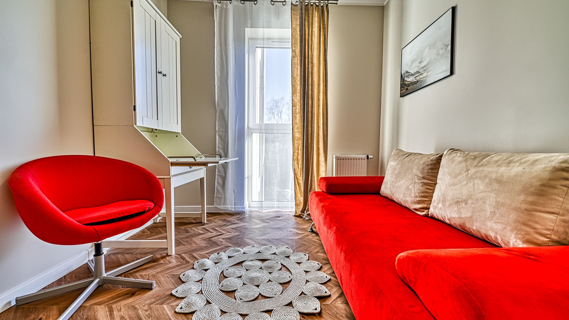 Apartament posiada dwie przytulne sypialnie. W pierwszej z nich znajduje się duże łóżko małżeńskie oraz pojemna szafa, która umożliwi wygodne przechowywanie ubrań i rzeczy osobistych. Druga sypialnia została wyposażona w sofę, fotel oraz biurko, co czyni ją idealnym miejscem zarówno do relaksu, jak i do pracy.