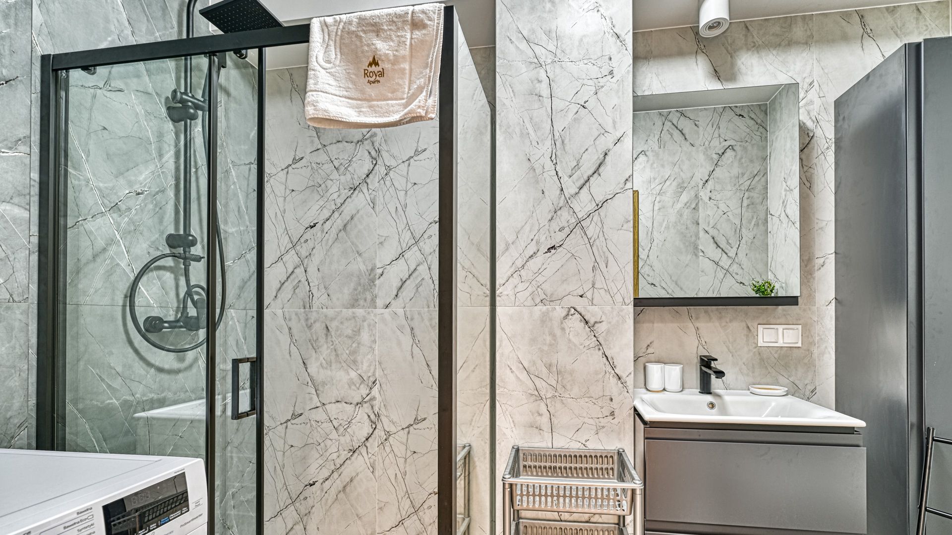 Łazienka apartamentu jest elegancka i wyposażona w prysznic, umywalkę i toaletę. Wszystkie niezbędne ręczniki i przybory toaletowe są dostępne na miejscu, aby zapewnić wygodę i komfort podczas pobytu.