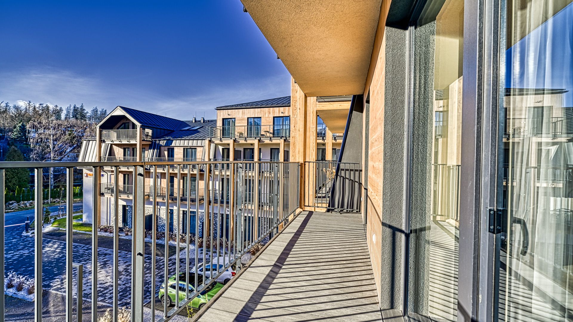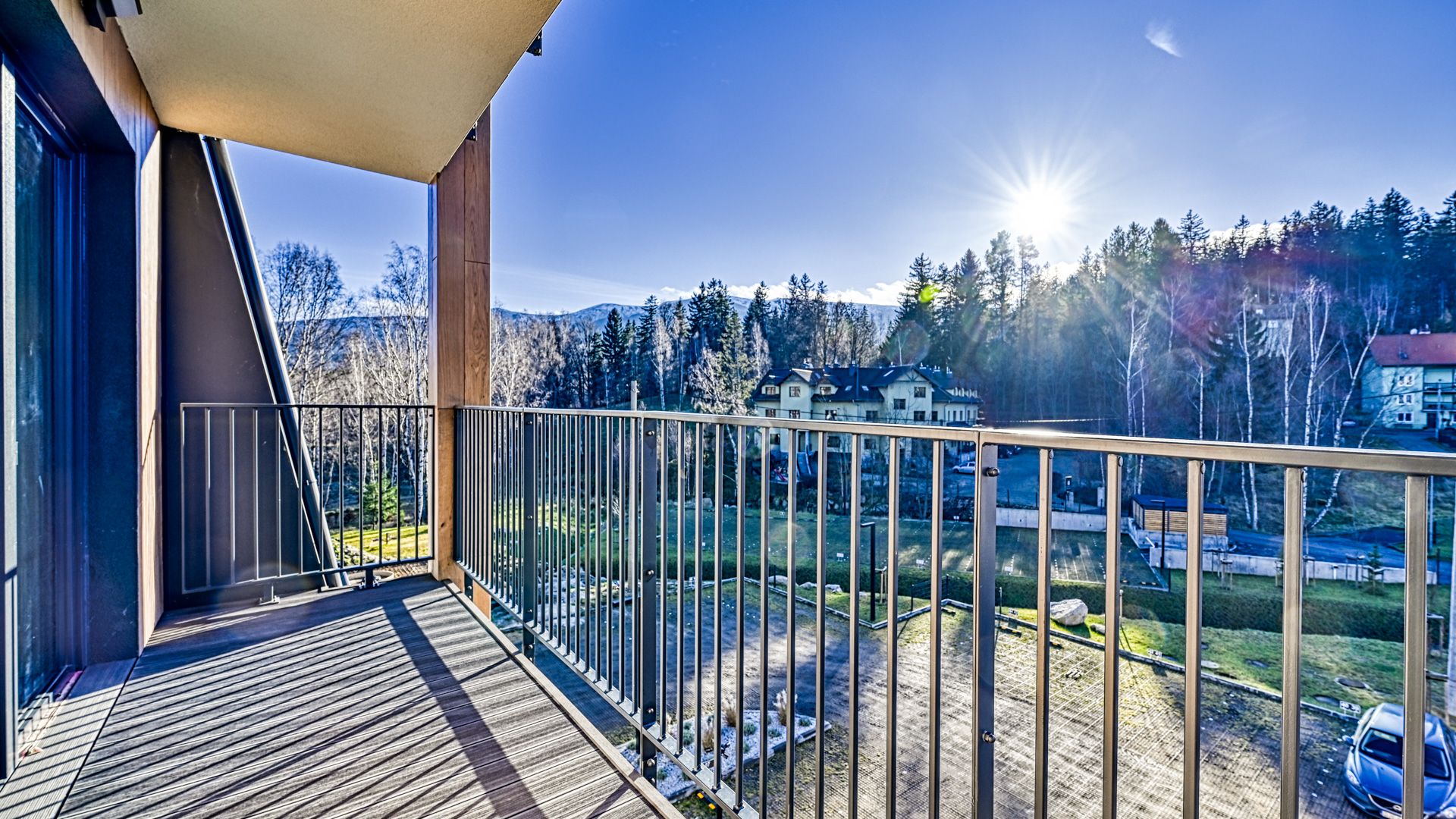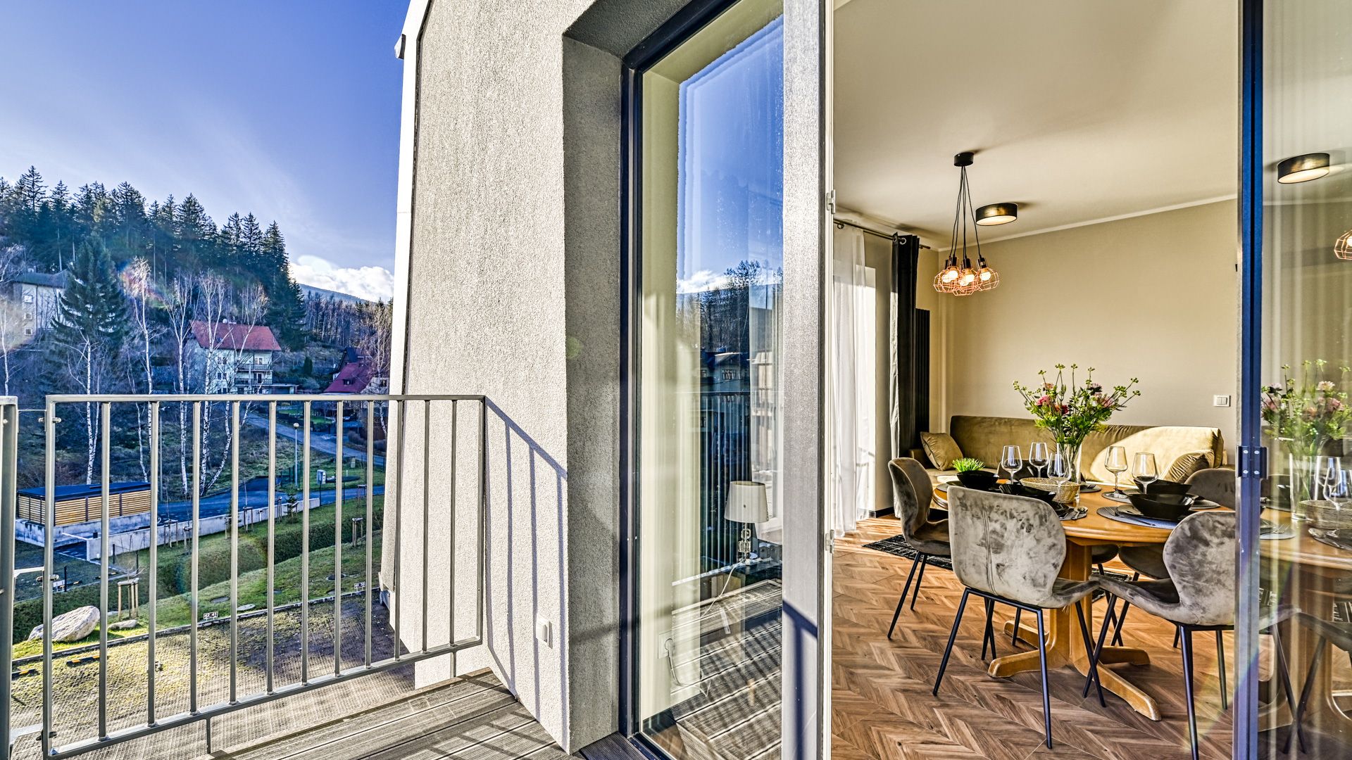 Otwierając drzwi balkonowe, możesz cieszyć się świeżym powietrzem i widokiem na górski krajobraz. To idealne miejsce, aby wypić poranną kawę lub delektować się romantyczną kolacją przy zachodzie słońca.