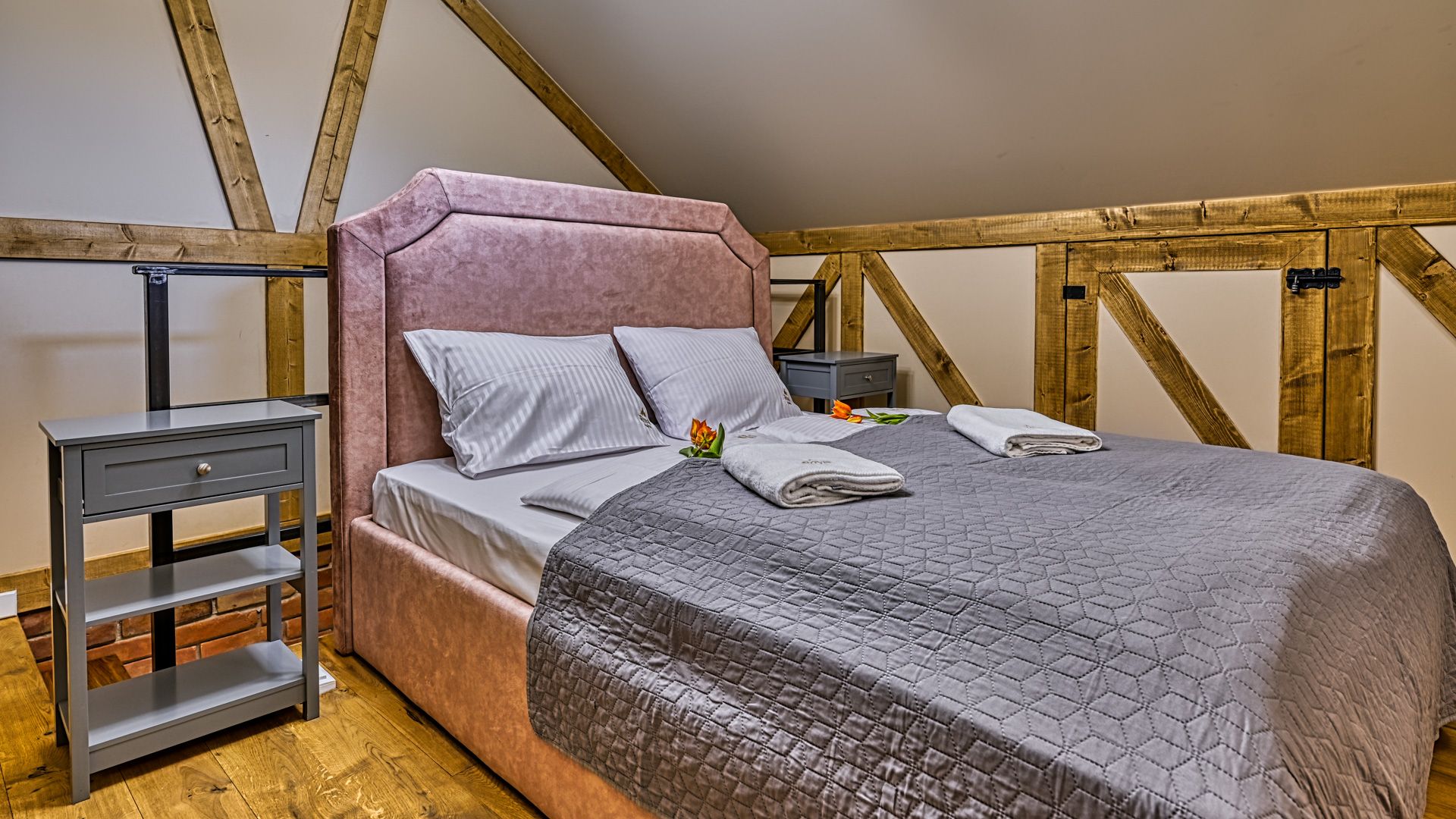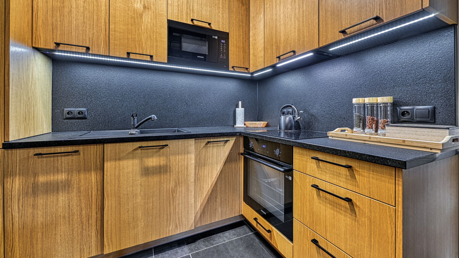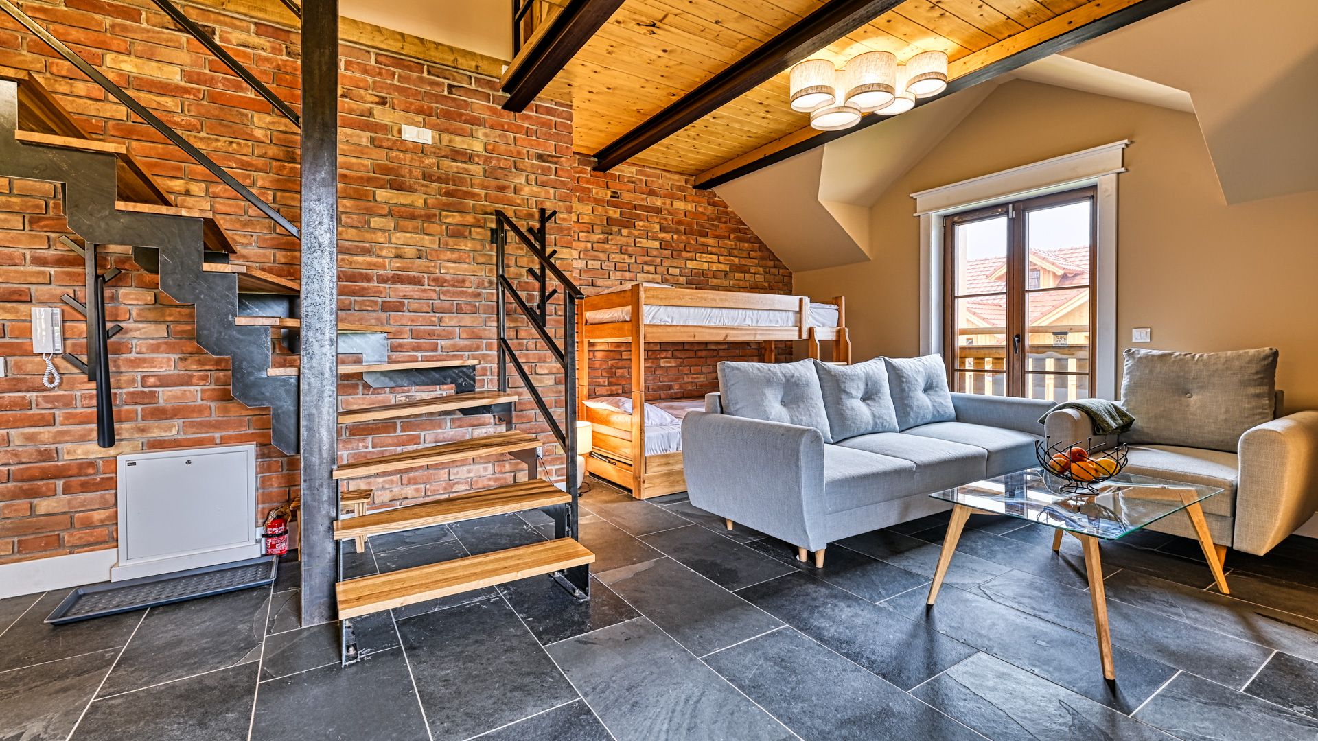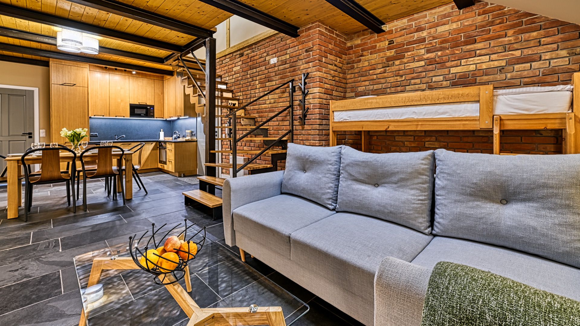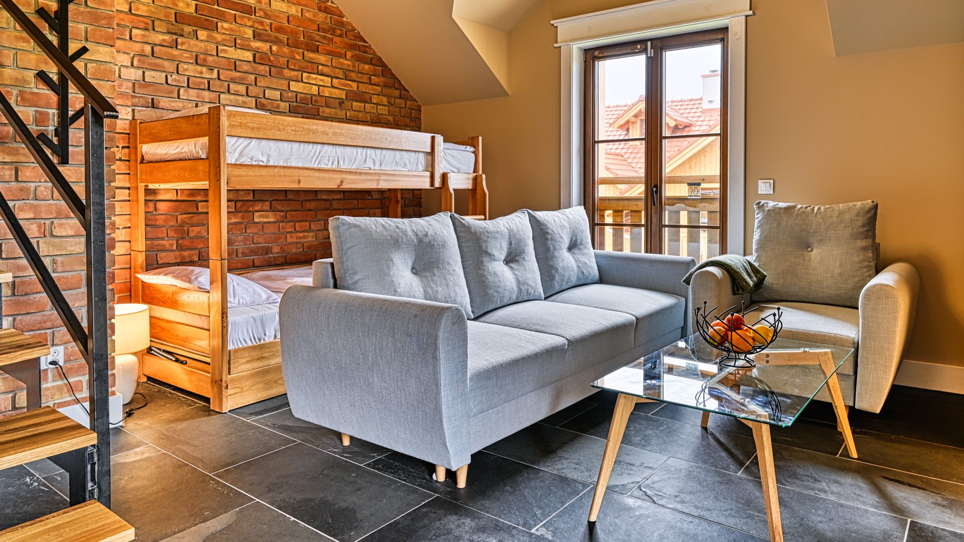 Apartament składa się z przestronnego salonu z rozkładaną sofą, piętrowym łóżkiem i aneksem kuchennym, gdzie znajdziesz wszystkie niezbędne urządzenia i sprzęty do gotowania m.in. czajnik, zmywarkę, ekspres do kawy, płytę grzewczą, lodówkę oraz piekarnik z mikrofalą. W oddzielnej sypialni znajduje się wygodne łóżko małżeńskie, zapewniające spokojny sen po dniu pełnym aktywności. Dodatkowe miejsce do spania zagwarantuje rozkładany fotel.