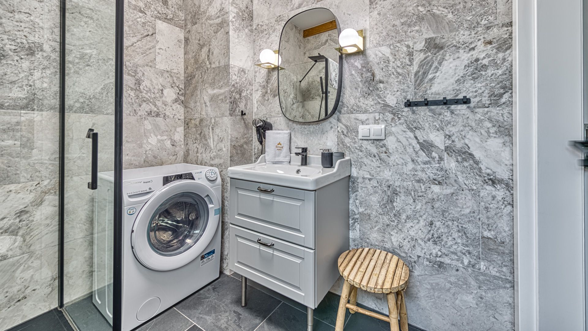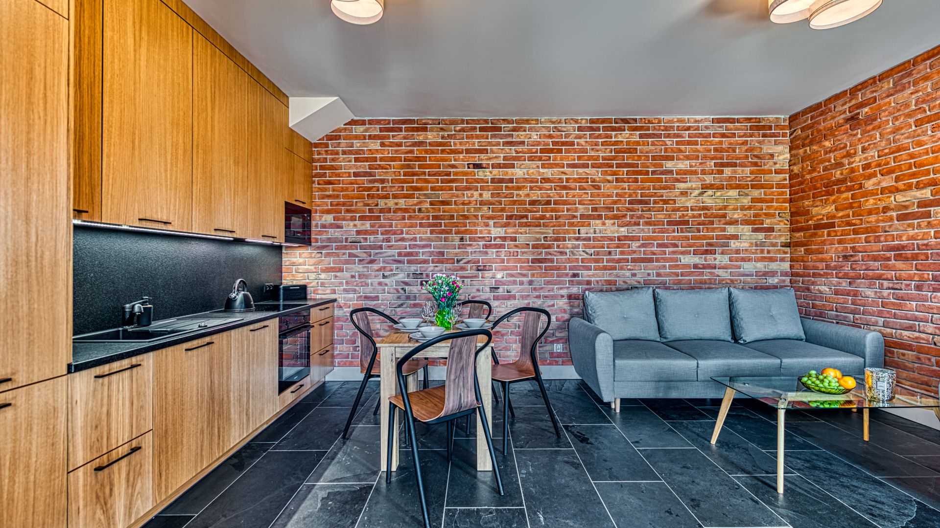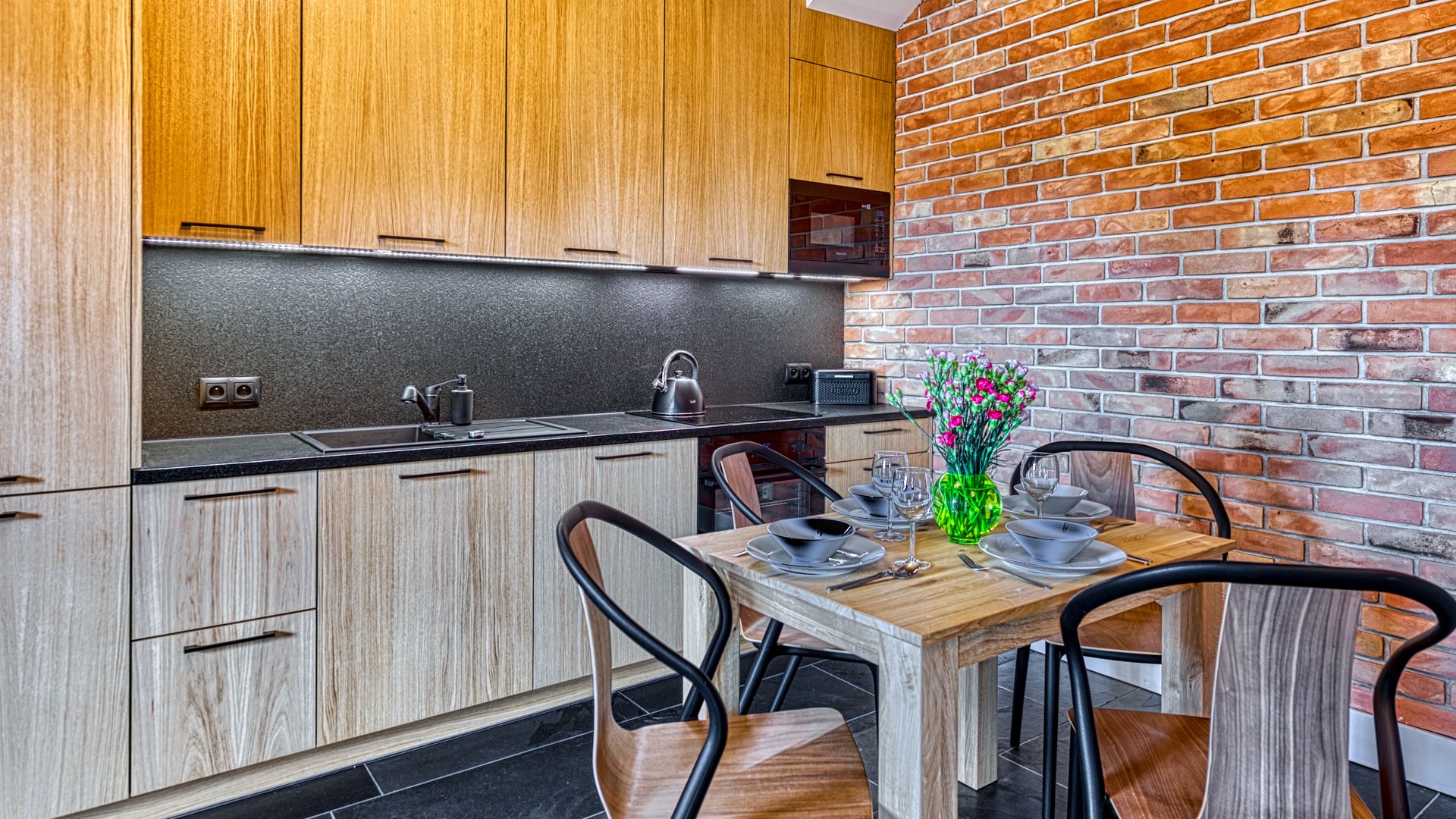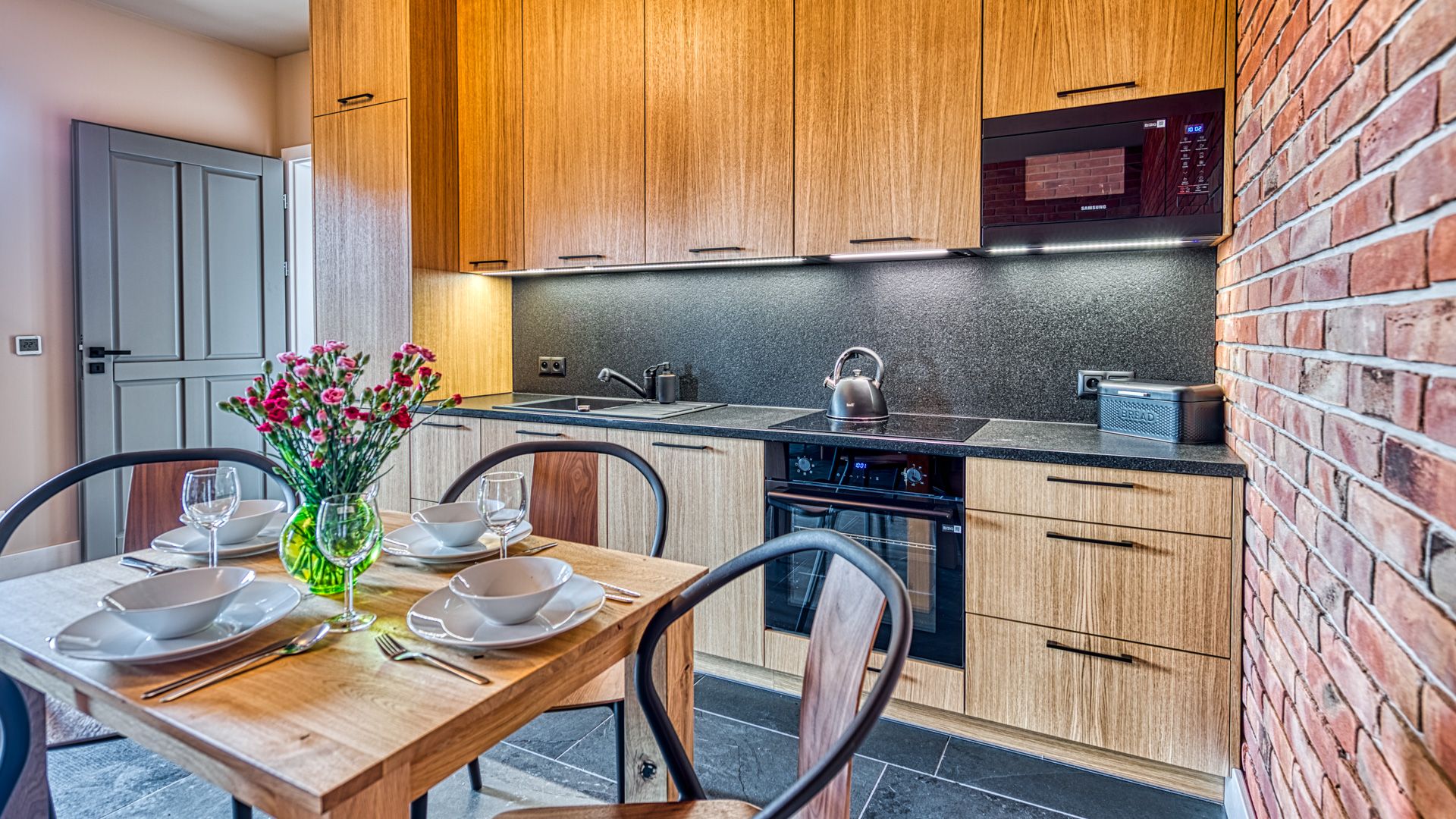 Sam aneks kuchenny posiada bogate wyposażenie, które pozwoli na przygotowanie pysznych posiłków. W jego skład wchodzą m.in. czajnik, talerze i sztućce, płyta kuchenna, lodówka, ekspres do kawy, opiekacz, mikrofalówka, zmywarka, piekarnik. W ładnie urządzonej łazience mieści się prysznic, toaleta, pralka, umywalka i lustro. W lokalu znajduje się także duży, płaski telewizor oraz bezpłatny internet WiFi.