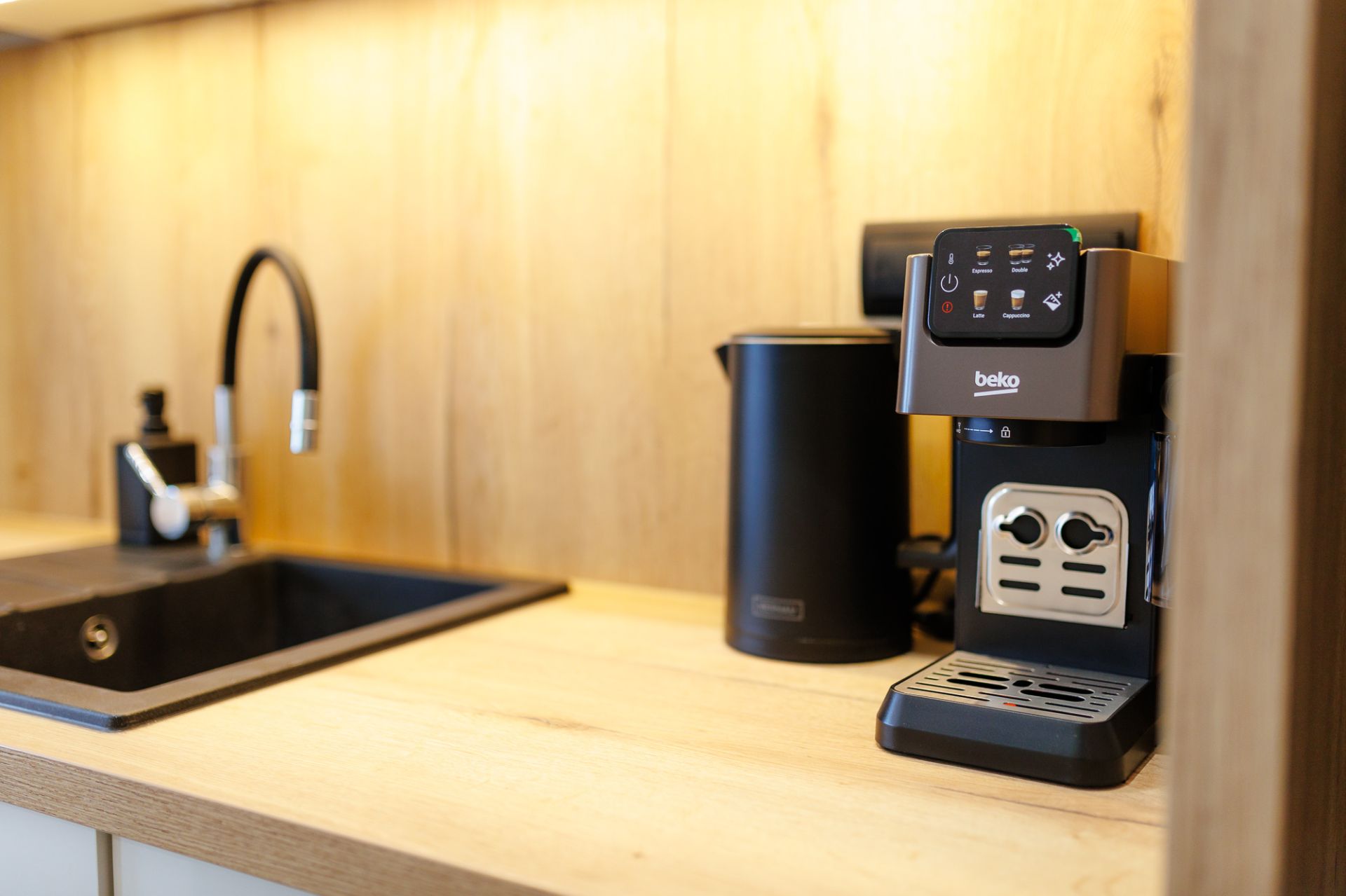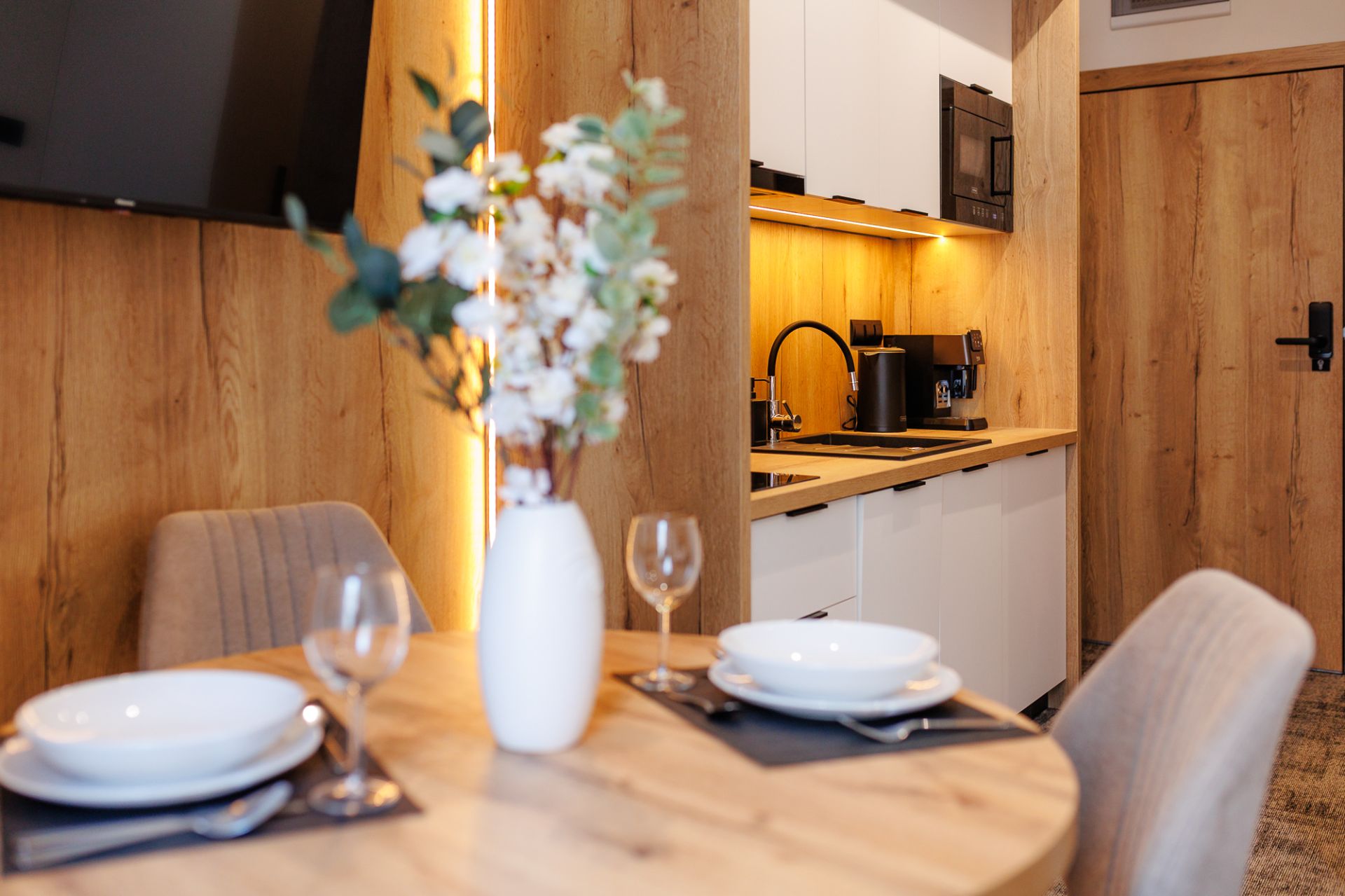 Salon został wyposażony w telewizor, a w pełni wyposażony aneks kuchenny pozwala na przygotowanie domowych posiłków. Obszerna szafa zapewnia dużo miejsca na przechowywanie rzeczy, gwarantując wygodę podczas dłuższego pobytu.