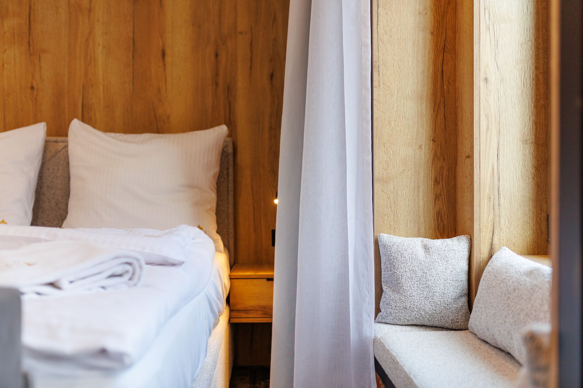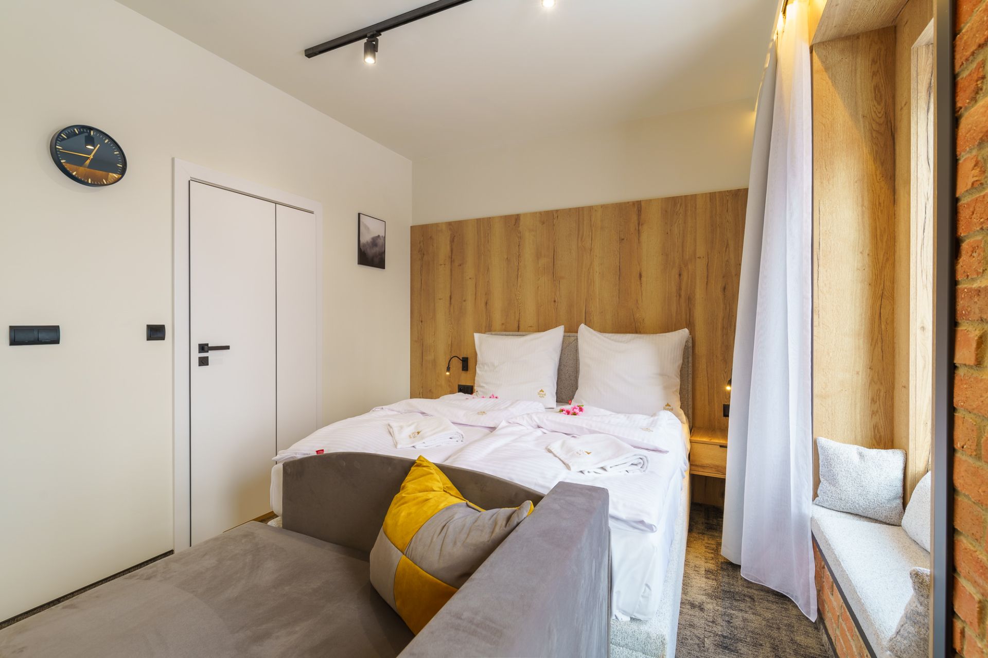 W przestrzeni apartamentu znajdują się część sypialniana z dużym, dwuosobowym łóżkiem oraz dodatkową dostawką, która stanowi komfortowe miejsce do spania dla trzeciego gościa. Połączenie sypialni z salonem zapewnia otwartą i przyjazną atmosferę, sprzyjającą wspólnemu spędzaniu czasu.
