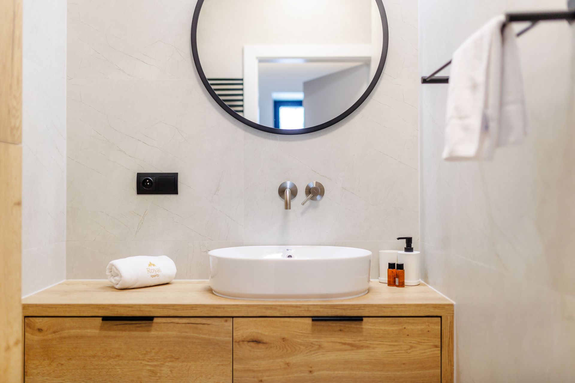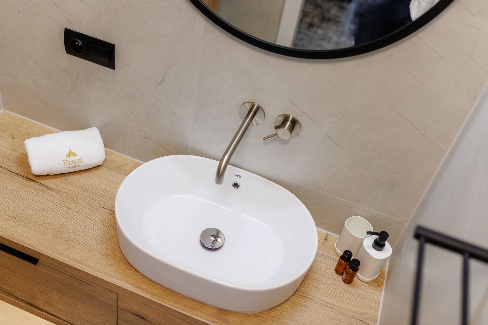 Elegancka łazienka z wysokiej jakości armaturą i przestronnym prysznicem gwarantuje wygodę i komfort podczas pobytu.