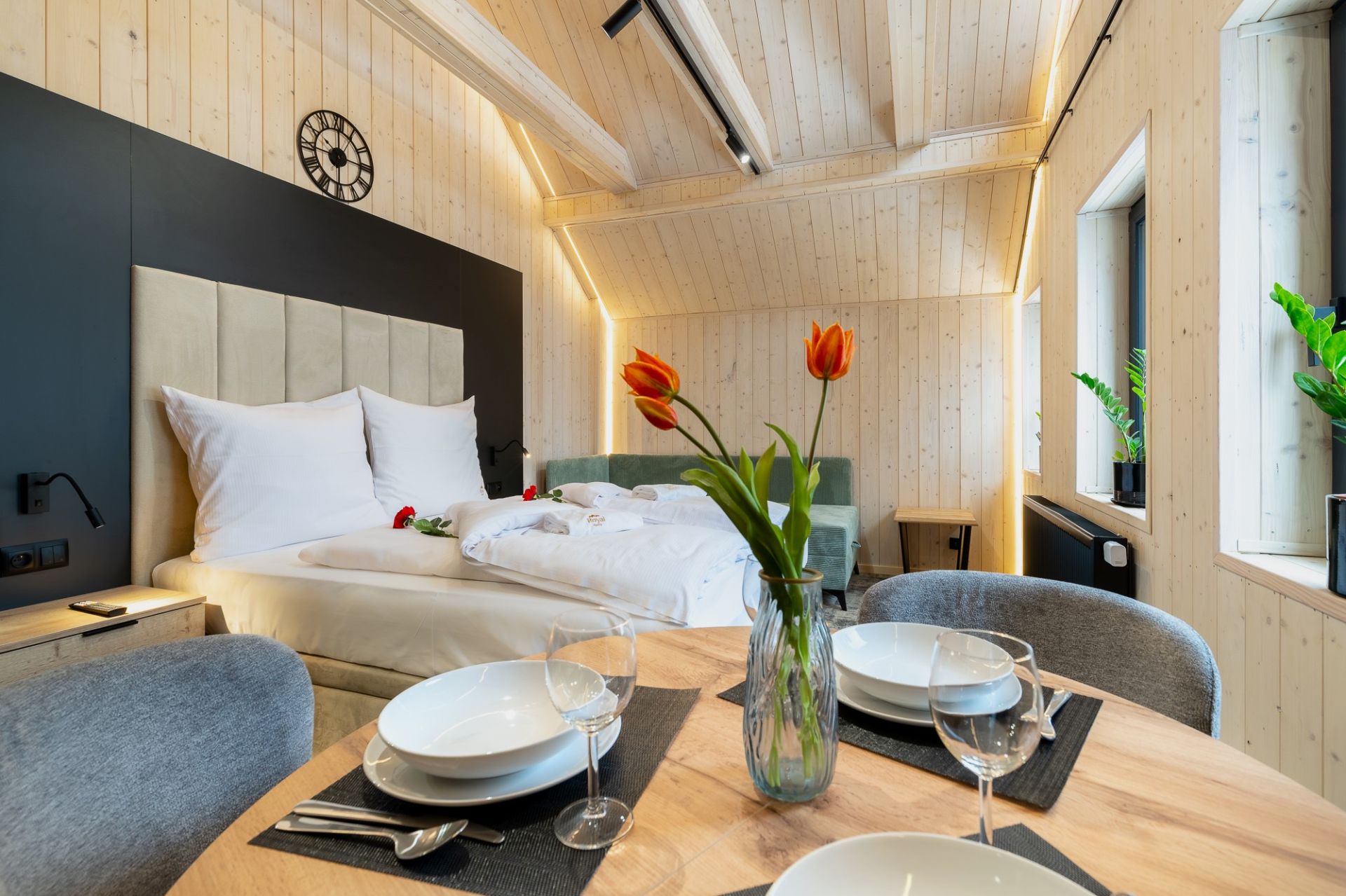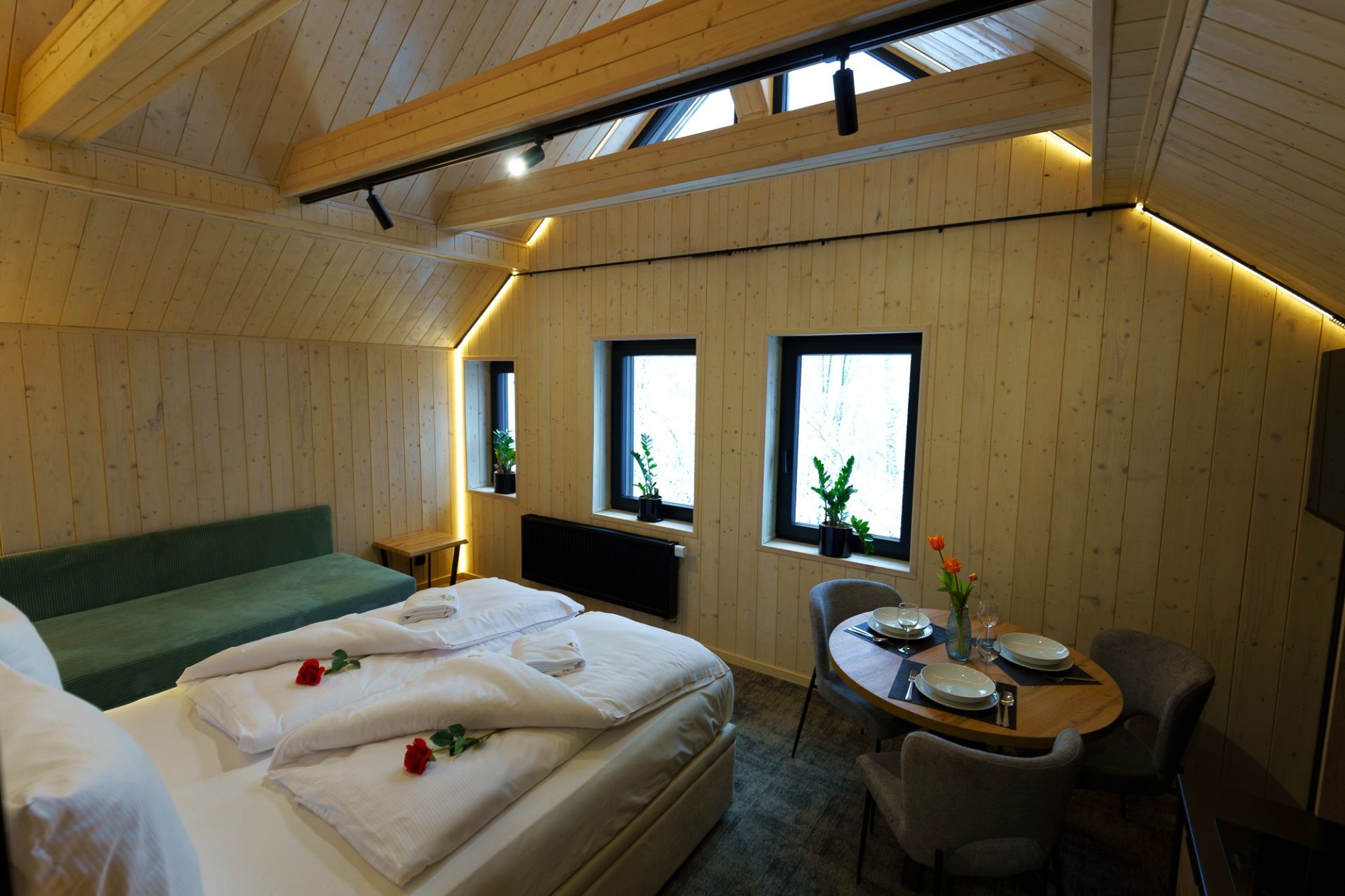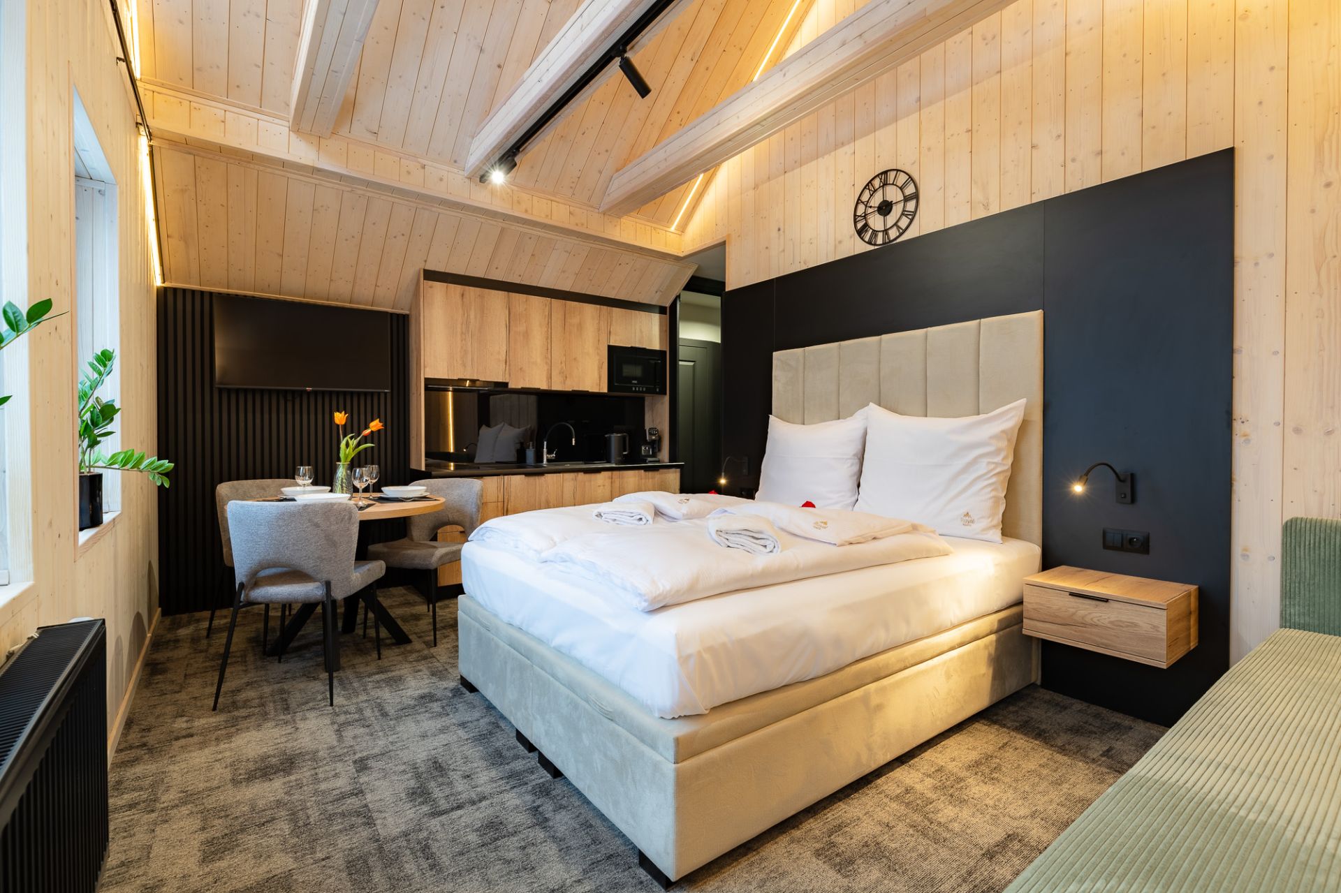 W przestrzeni apartamentu znajdują się część sypialniana z dużym, dwuosobowym łóżkiem oraz dodatkową dostawką, która stanowi komfortowe miejsce do spania dla trzeciego gościa. Połączenie sypialni z salonem zapewnia otwartą i przyjazną atmosferę, sprzyjającą wspólnemu spędzaniu czasu.