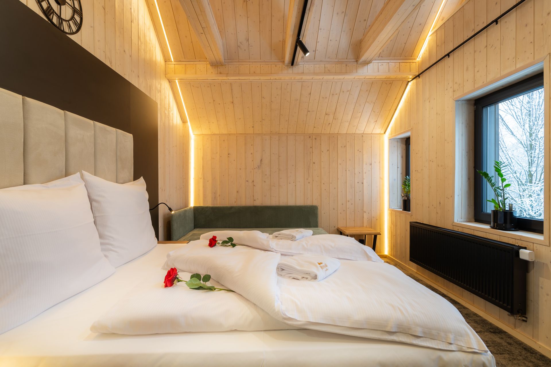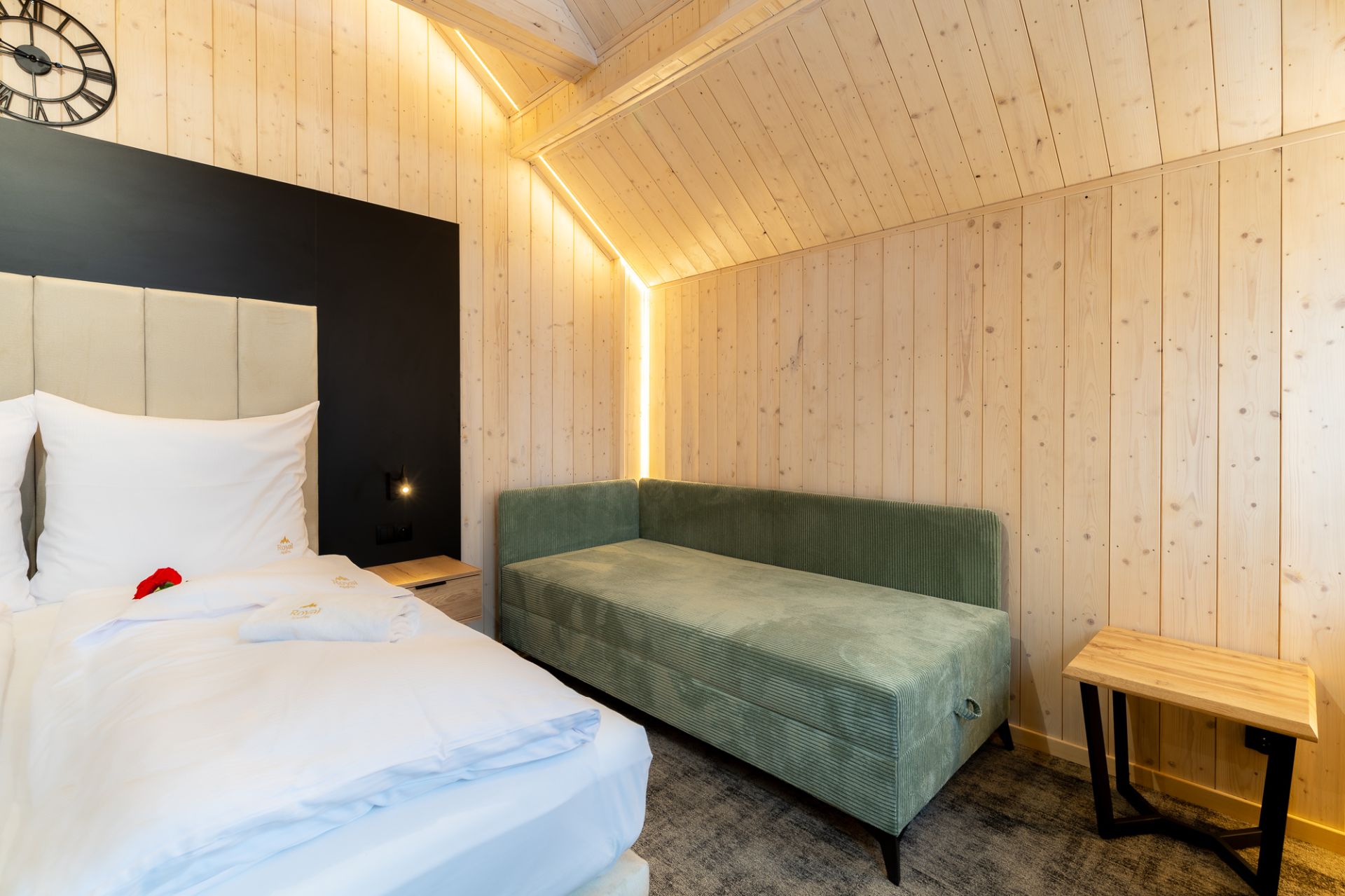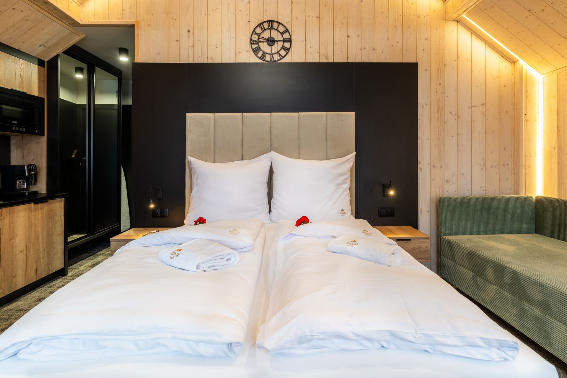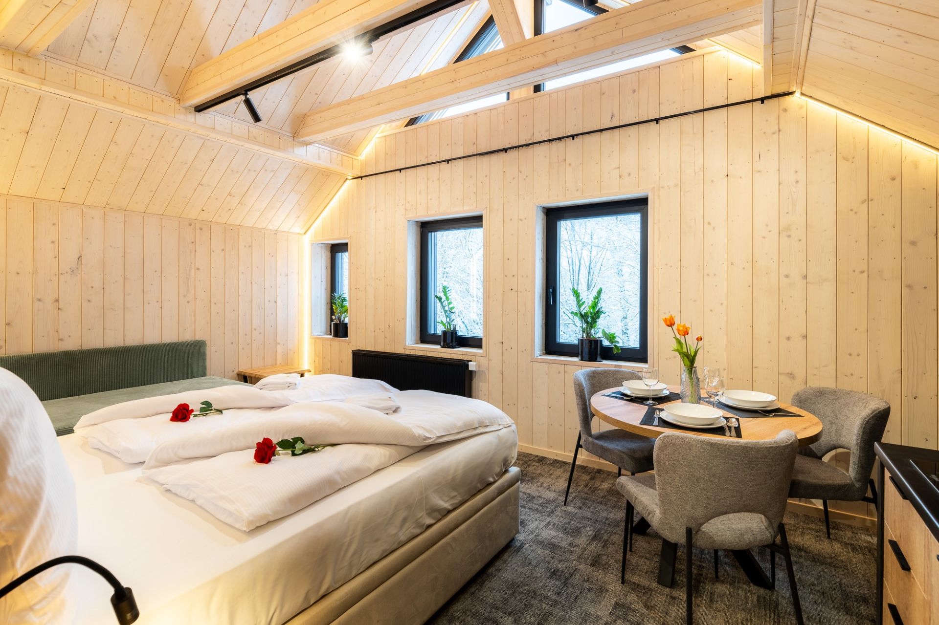 W przestrzeni apartamentu znajdują się część sypialniana z dużym, dwuosobowym łóżkiem oraz dodatkową dostawką, która stanowi komfortowe miejsce do spania dla trzeciego gościa. Połączenie sypialni z salonem zapewnia otwartą i przyjazną atmosferę, sprzyjającą wspólnemu spędzaniu czasu.