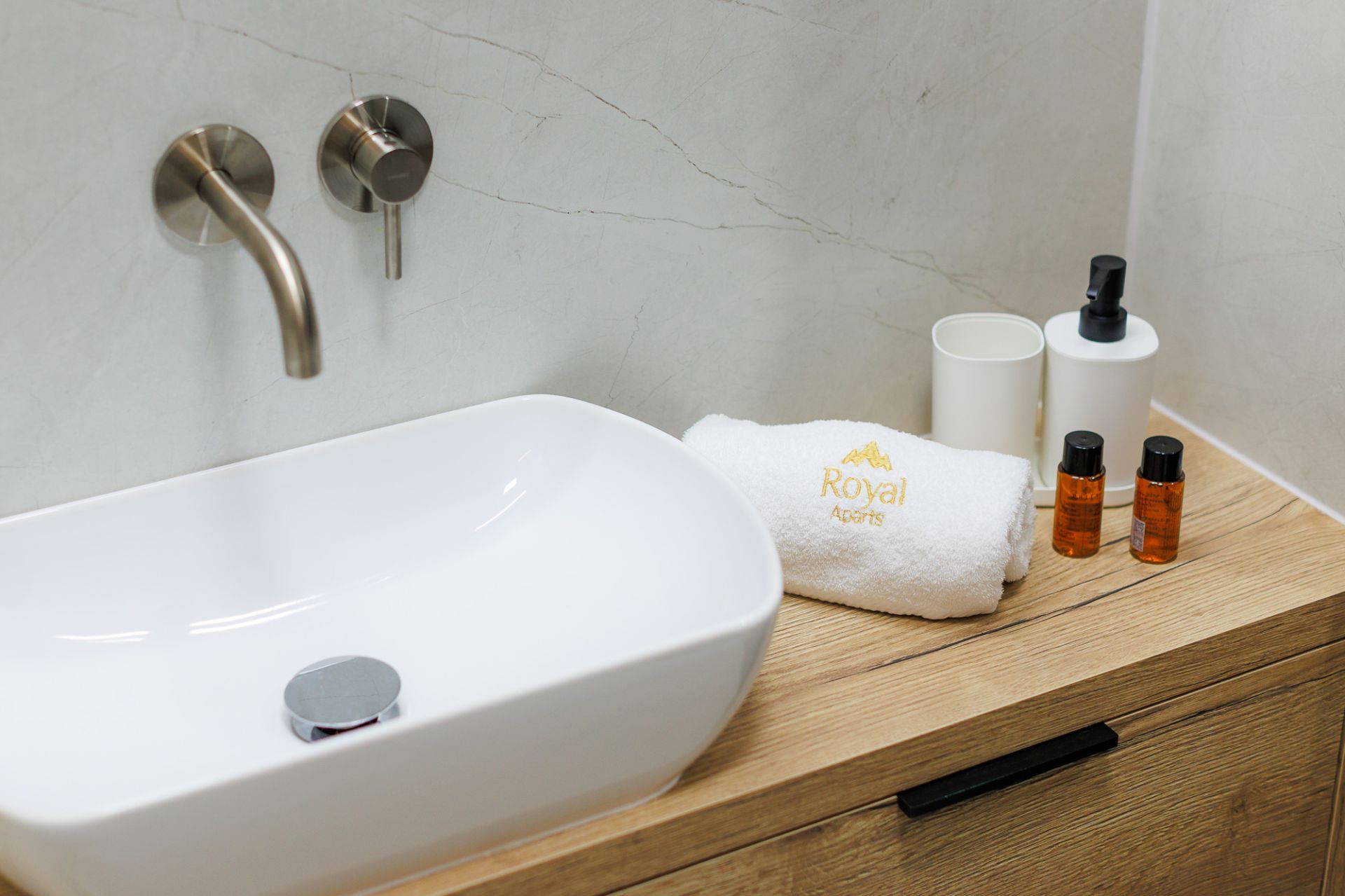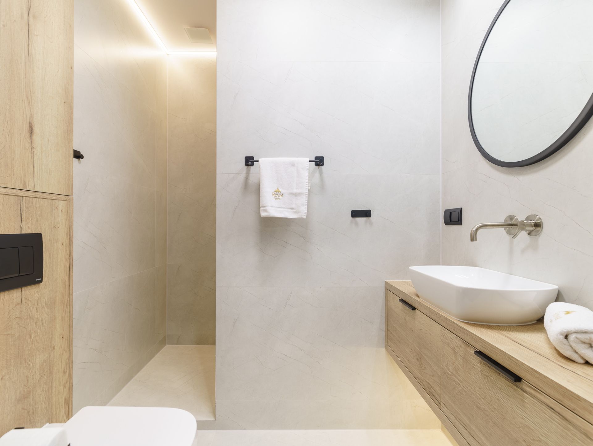 Elegancka łazienka z wysokiej jakości armaturą i przestronnym prysznicem gwarantuje wygodę i komfort podczas pobytu.