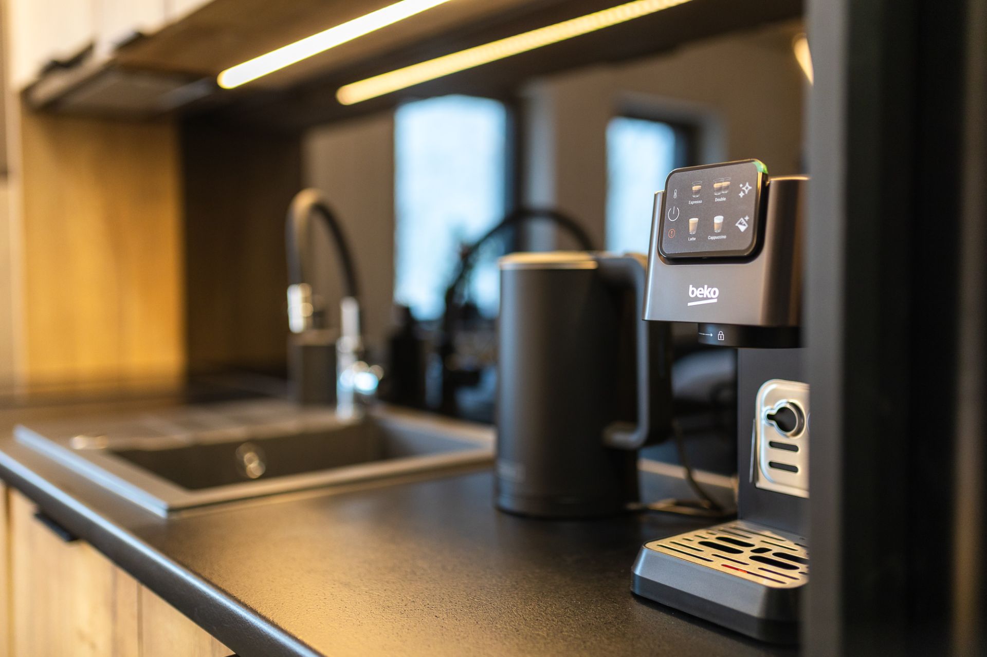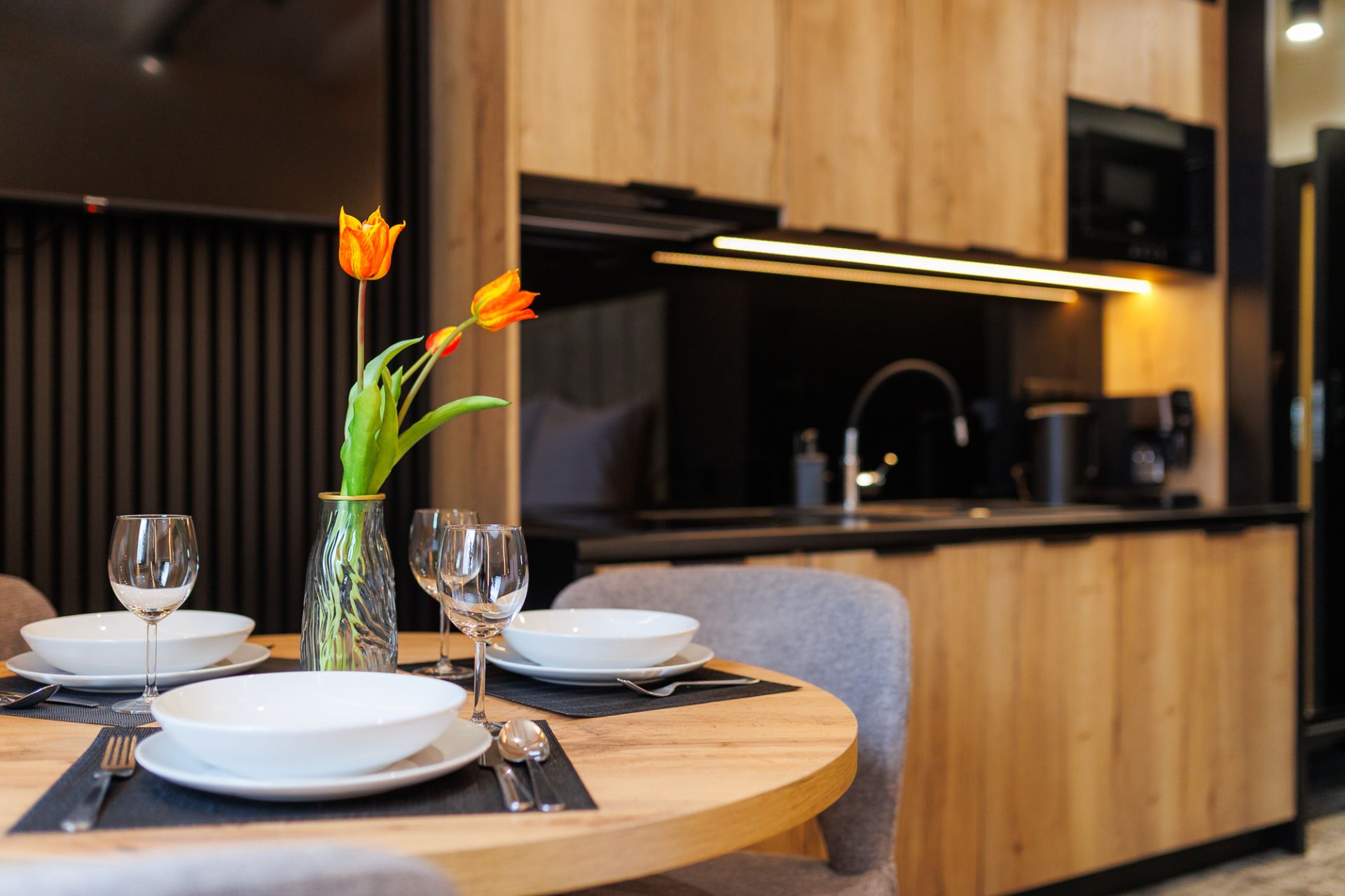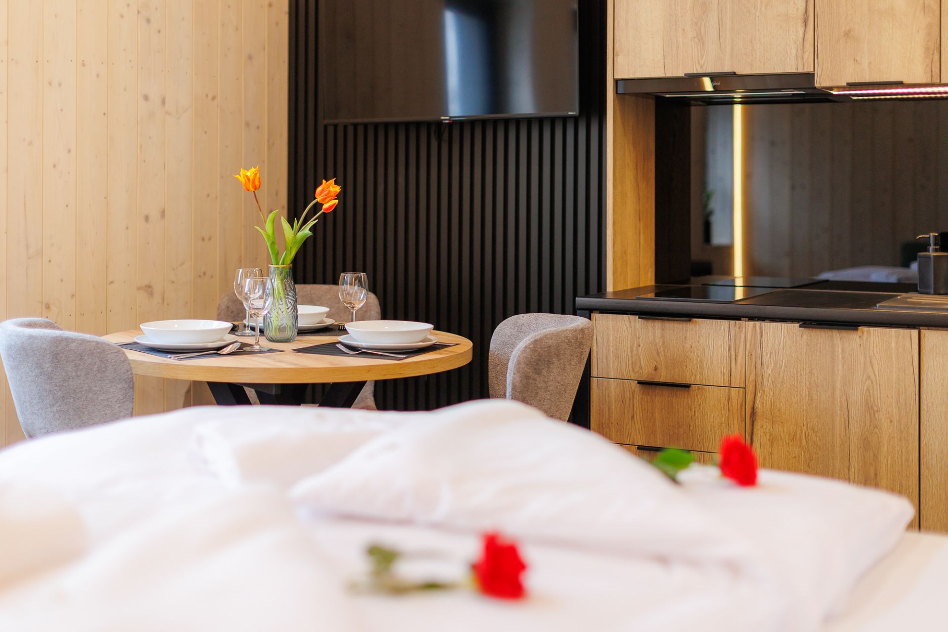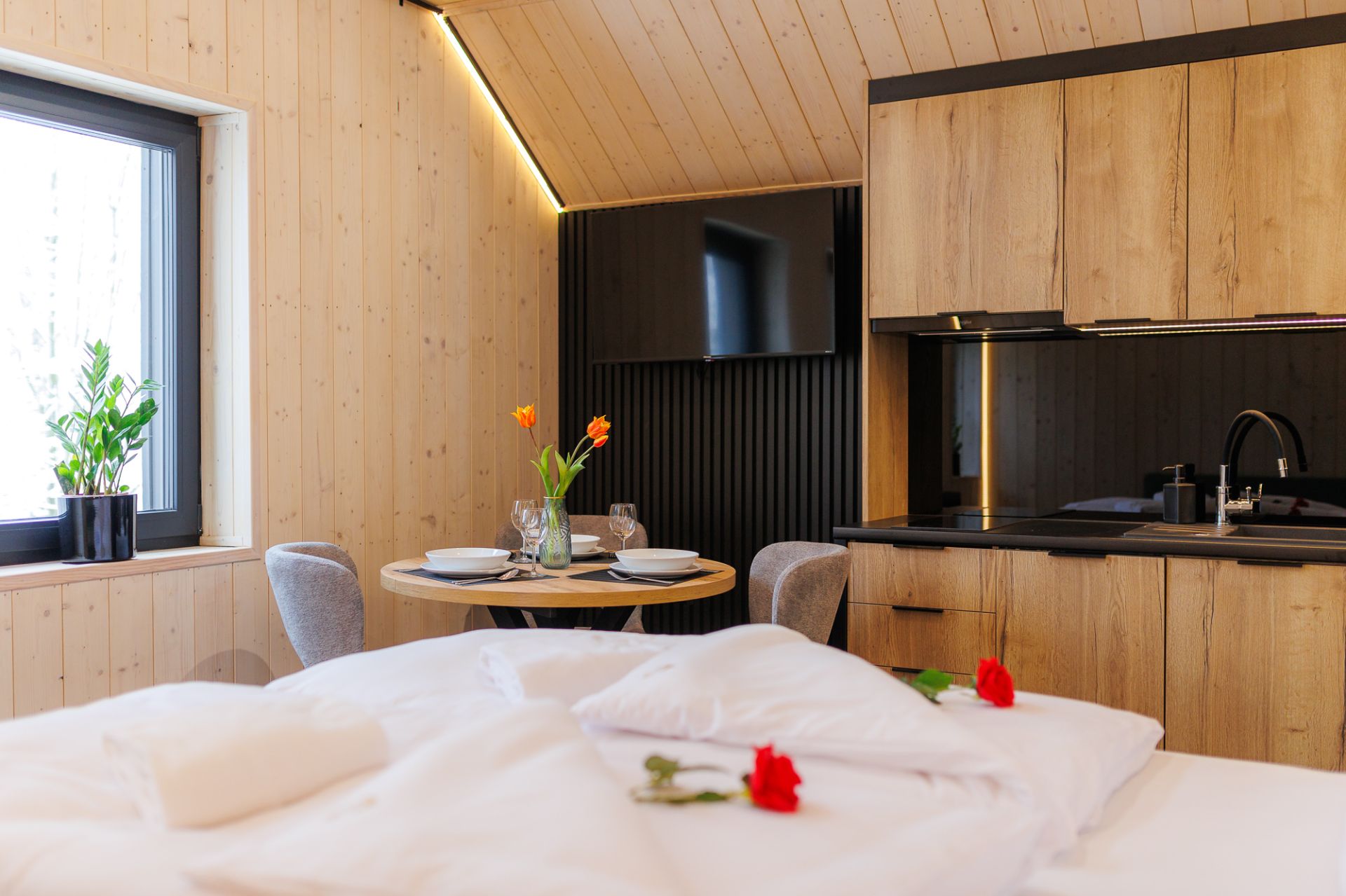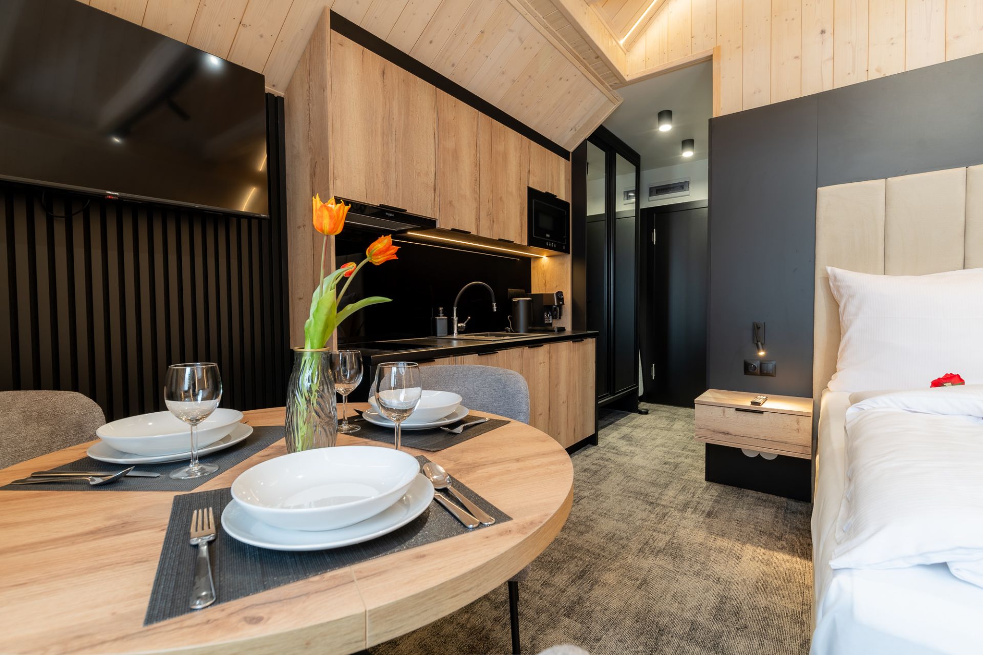 Salon został wyposażony w telewizor, a w pełni wyposażony aneks kuchenny pozwala na przygotowanie domowych posiłków. Obszerna szafa zapewnia dużo miejsca na przechowywanie rzeczy, gwarantując wygodę podczas dłuższego pobytu.