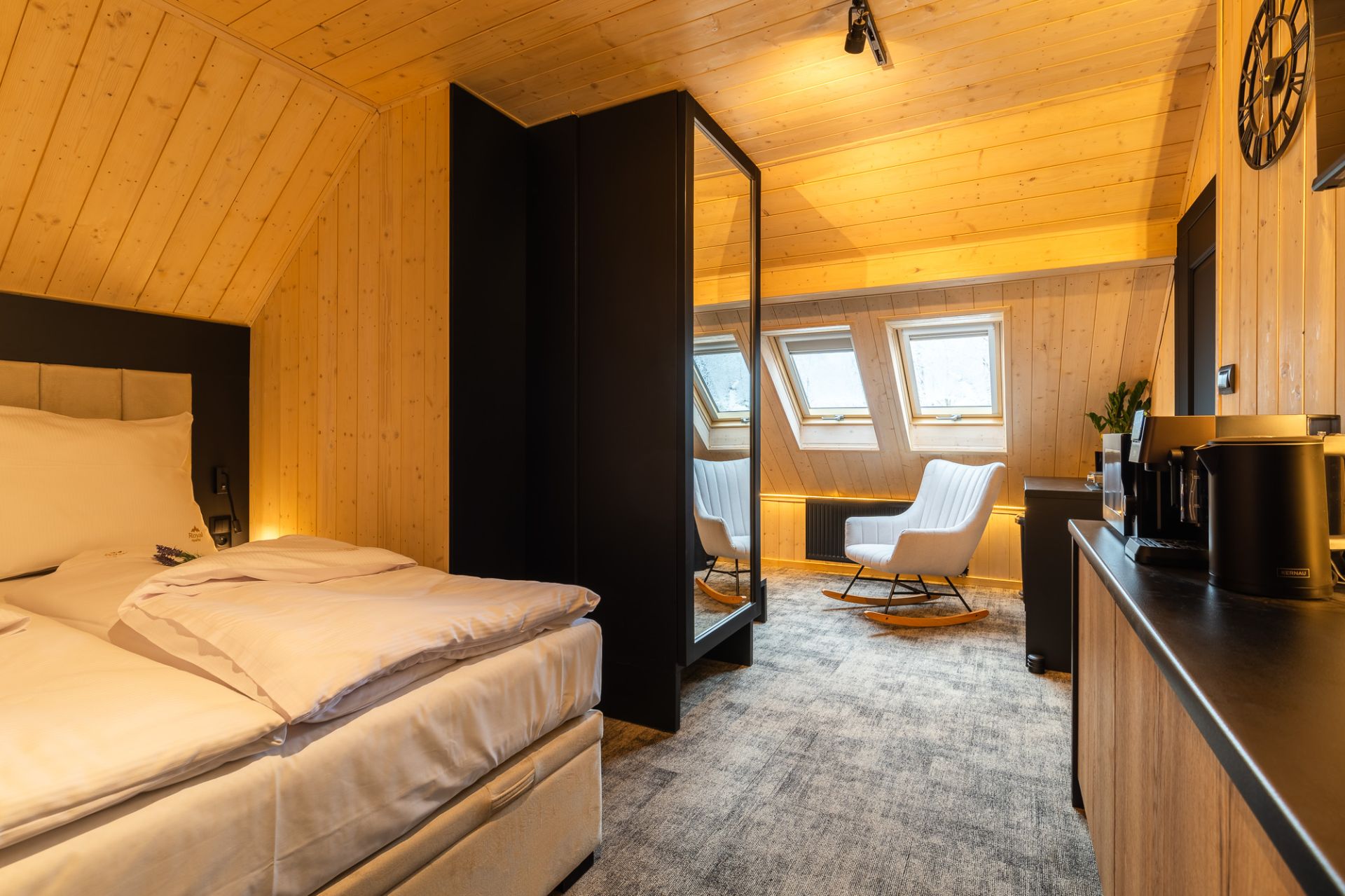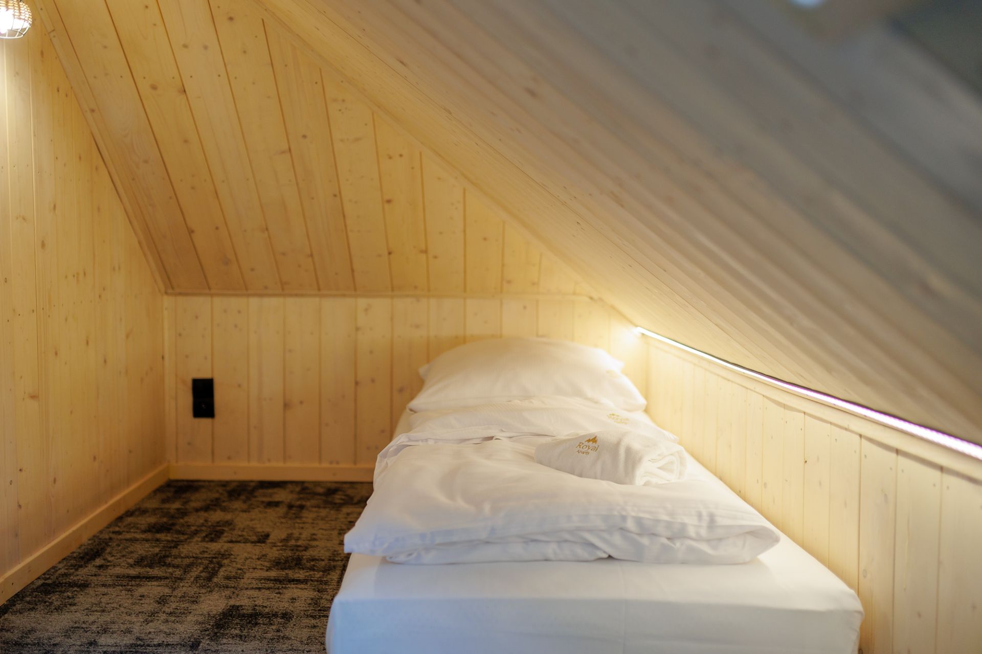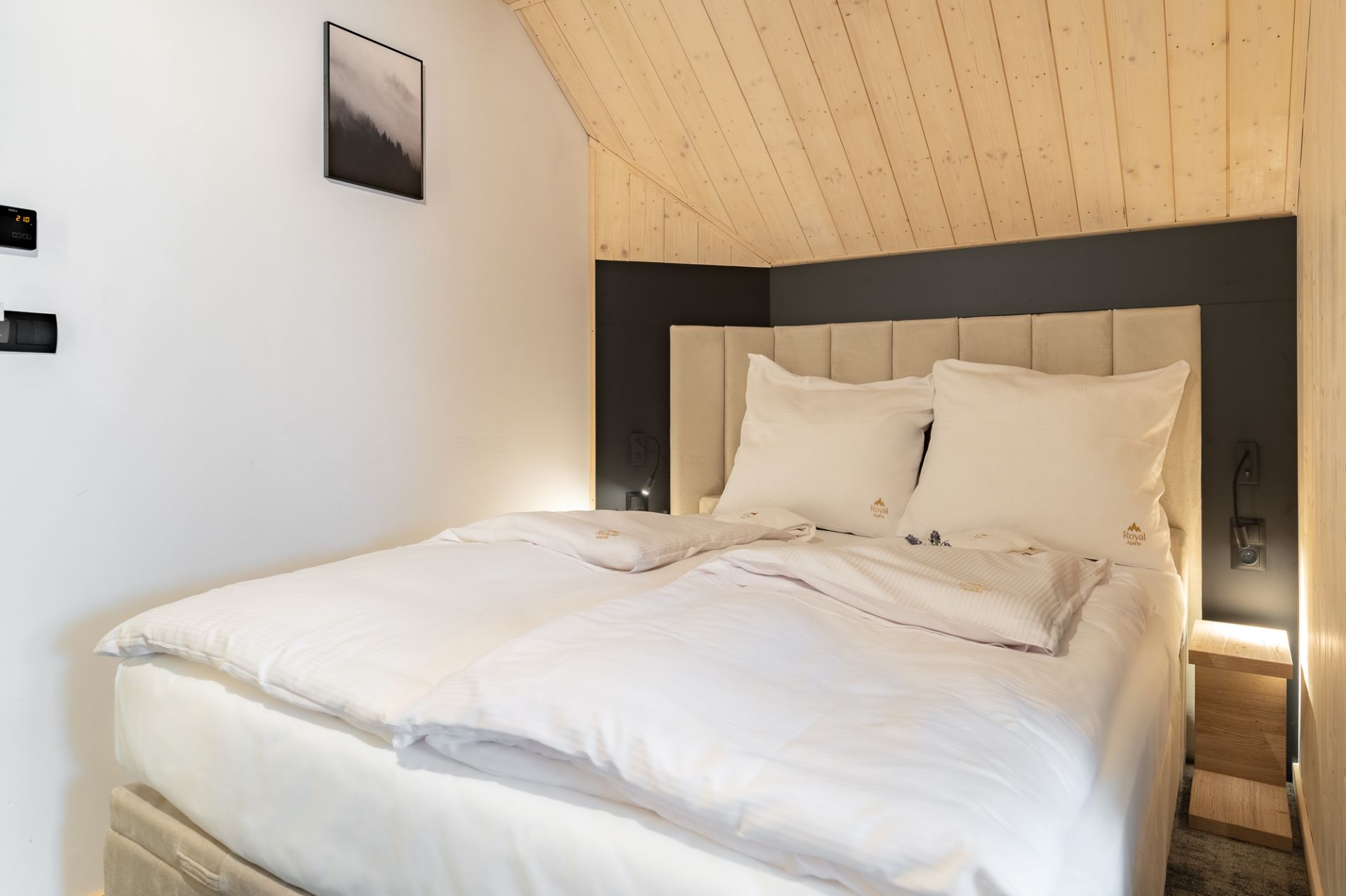 W przestrzeni apartamentu znajdują się część sypialniana z dużym, dwuosobowym łóżkiem, fotelem oraz dodatkową dostawką, która stanowi komfortowe miejsce do spania dla trzeciego gościa. Połączenie sypialni z salonem zapewnia otwartą i przyjazną atmosferę, sprzyjającą wspólnemu spędzaniu czasu.