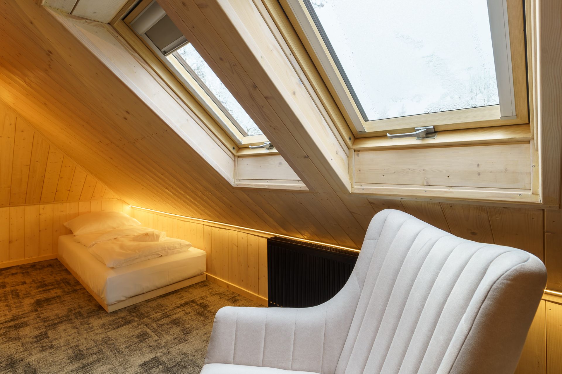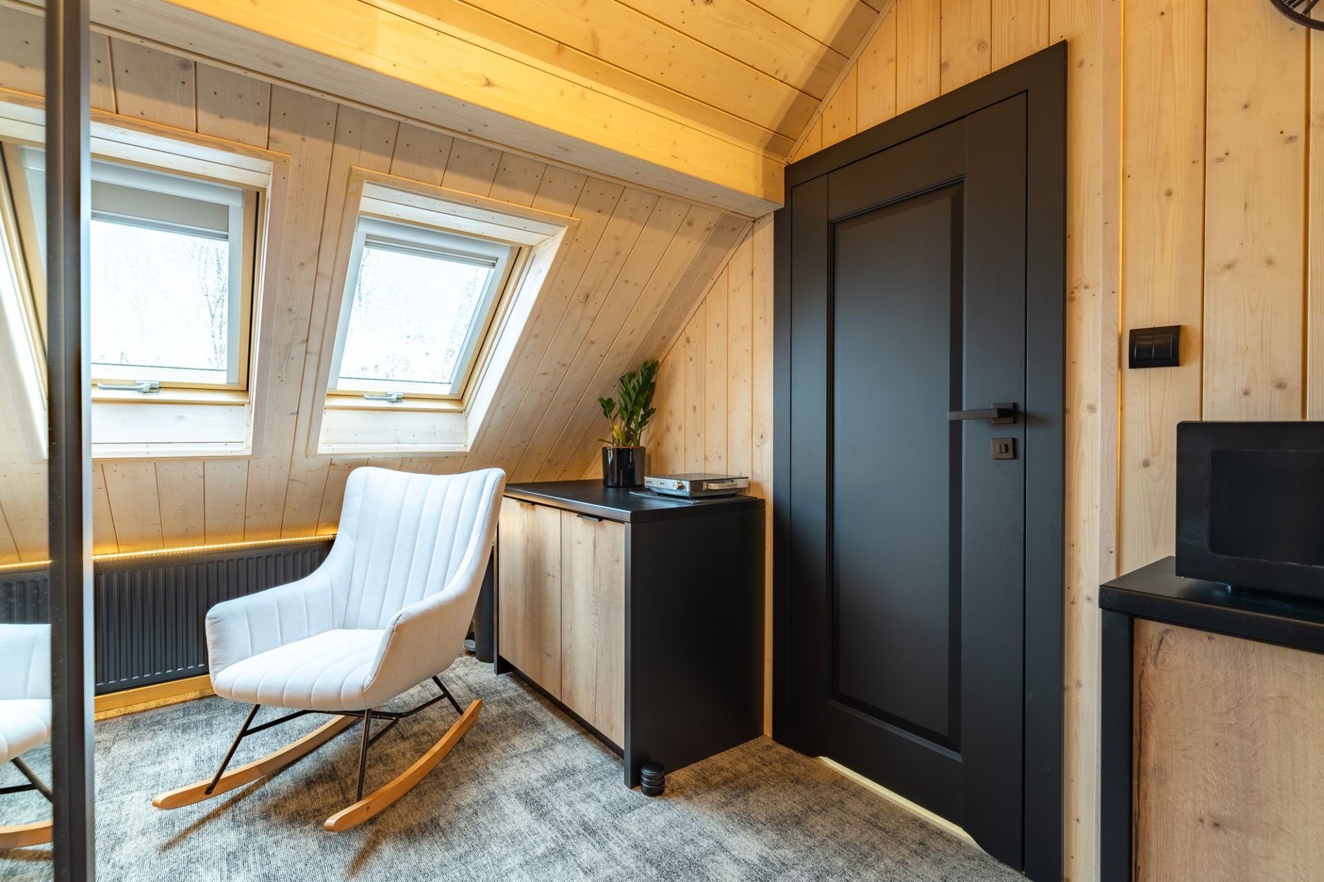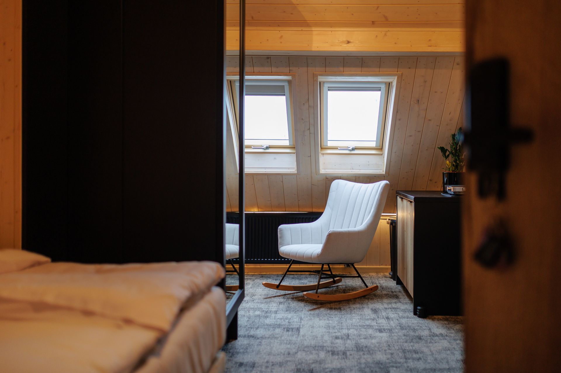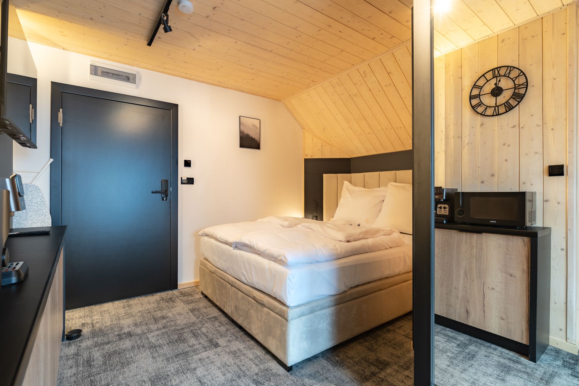 W przestrzeni apartamentu znajdują się część sypialniana z dużym, dwuosobowym łóżkiem, fotelem oraz dodatkową dostawką, która stanowi komfortowe miejsce do spania dla trzeciego gościa. Połączenie sypialni z salonem zapewnia otwartą i przyjazną atmosferę, sprzyjającą wspólnemu spędzaniu czasu.