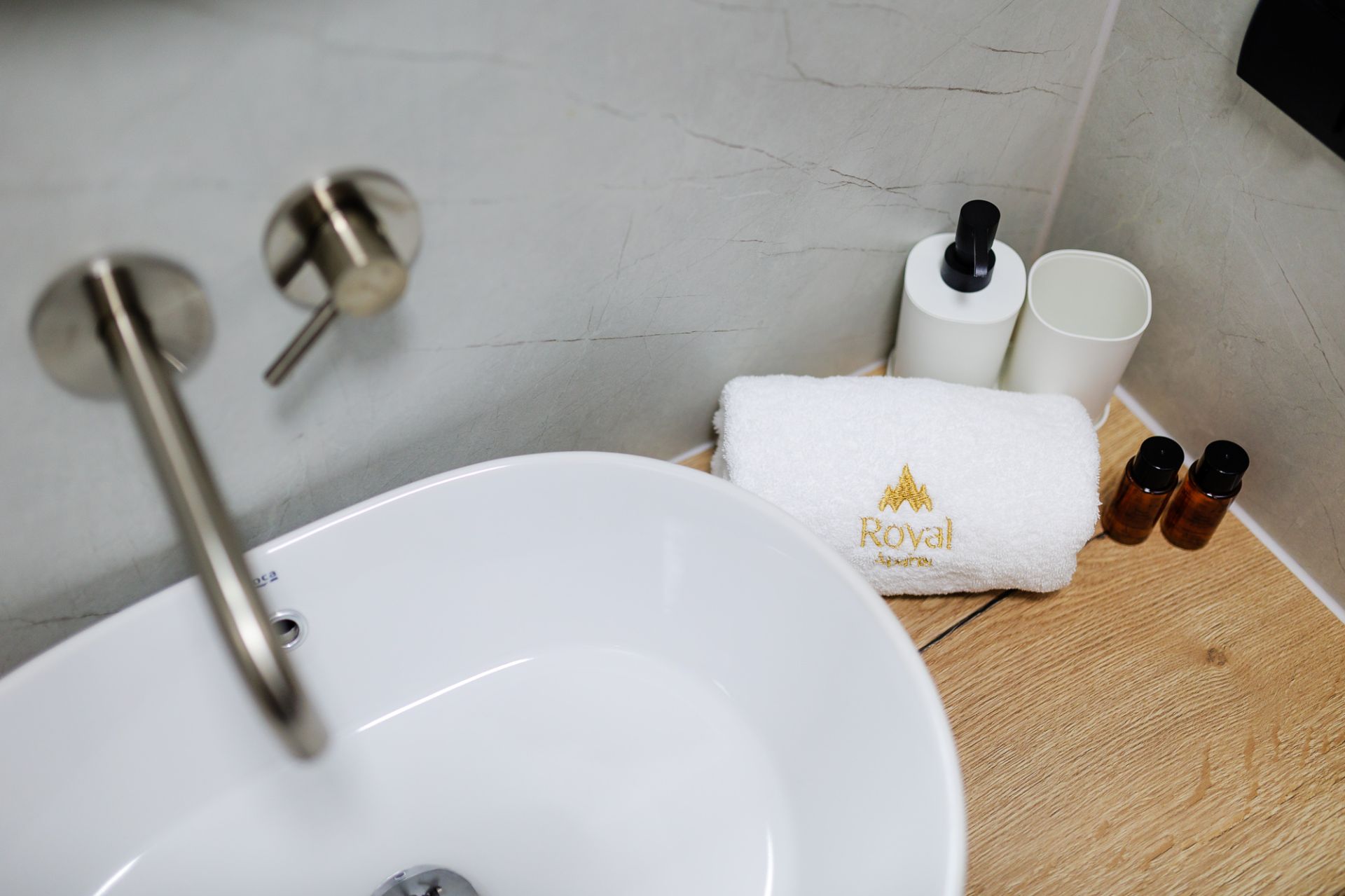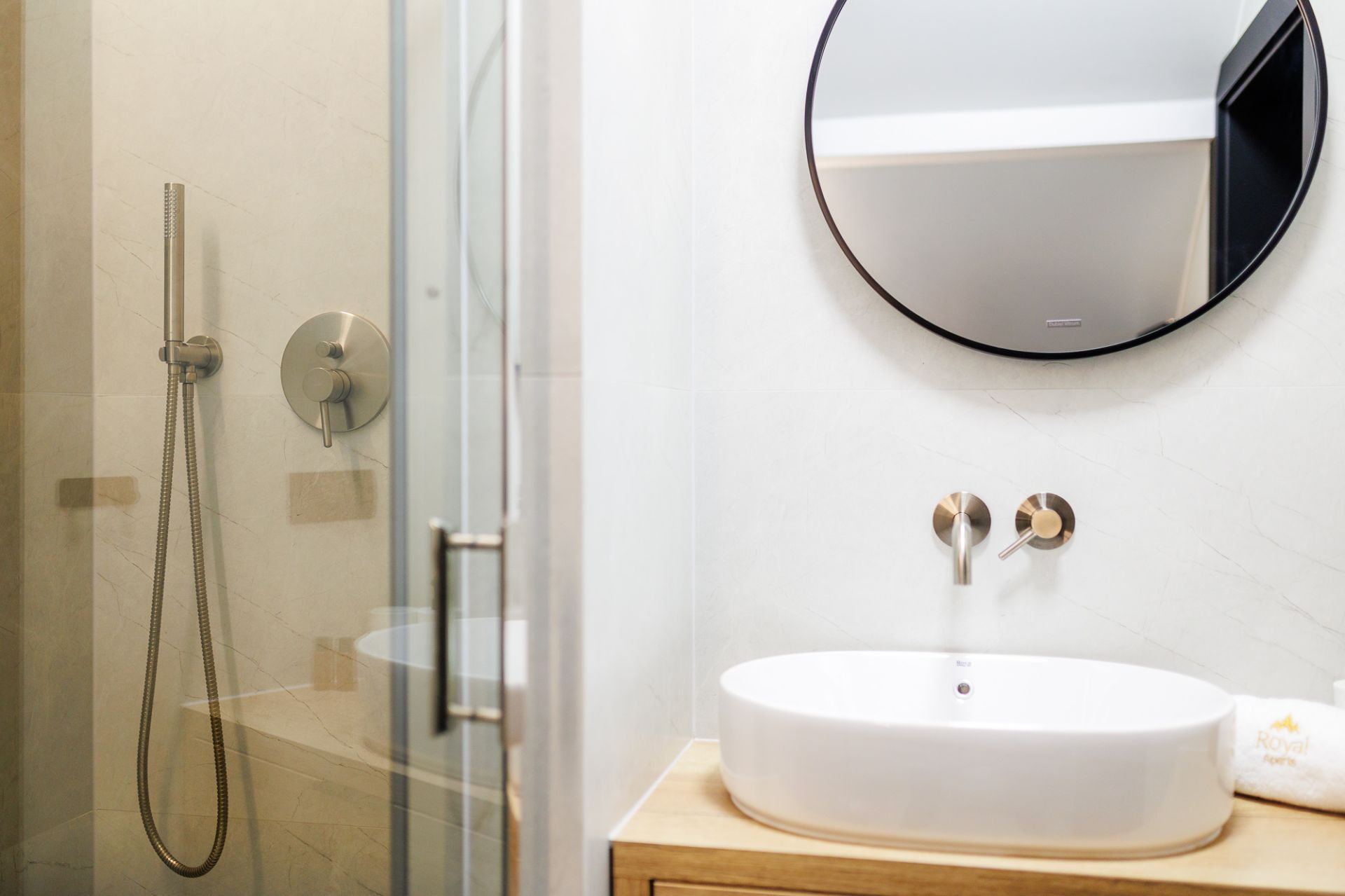 Elegancka łazienka z wysokiej jakości armaturą i przestronnym prysznicem gwarantuje wygodę i komfort podczas pobytu.