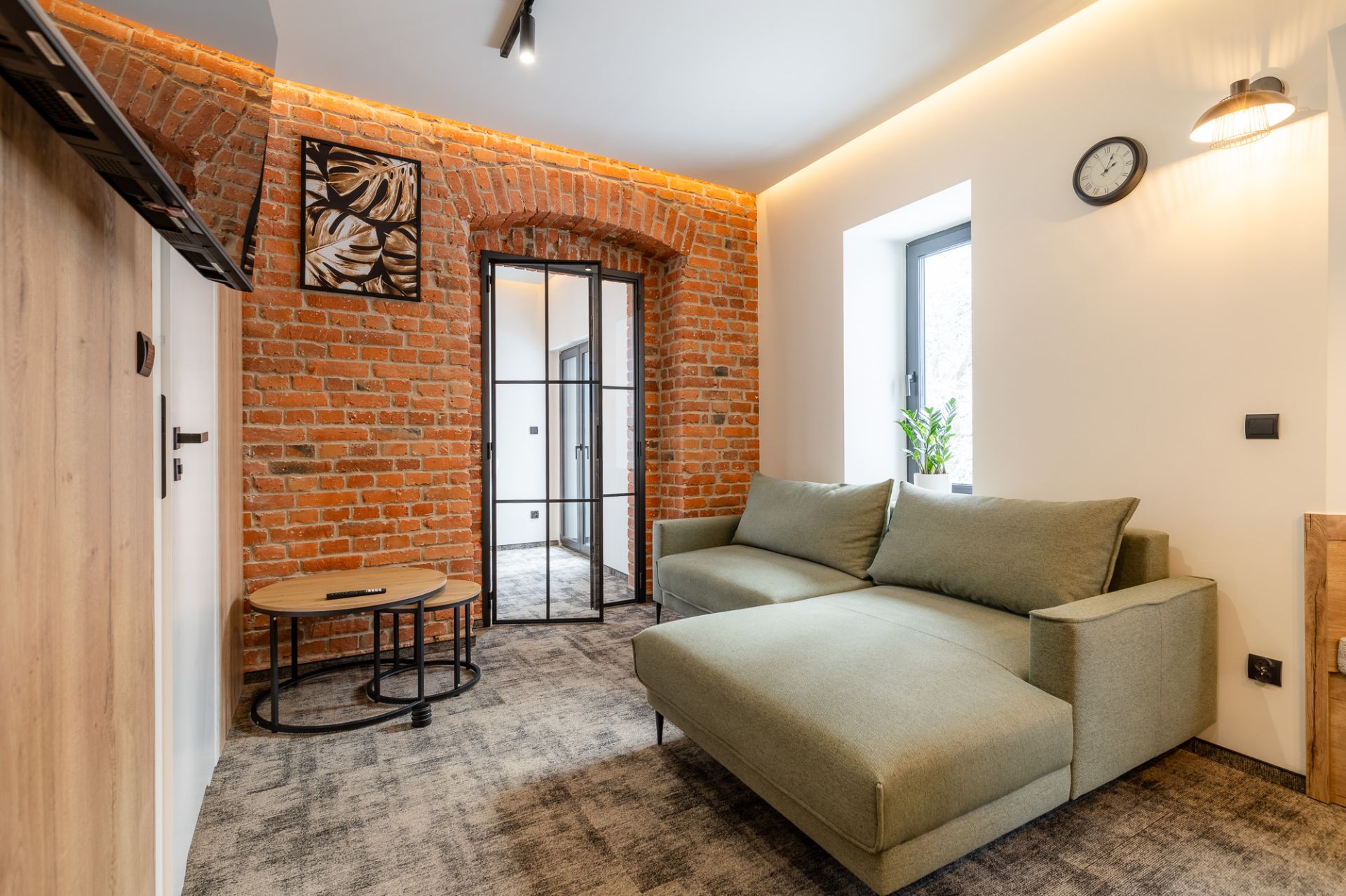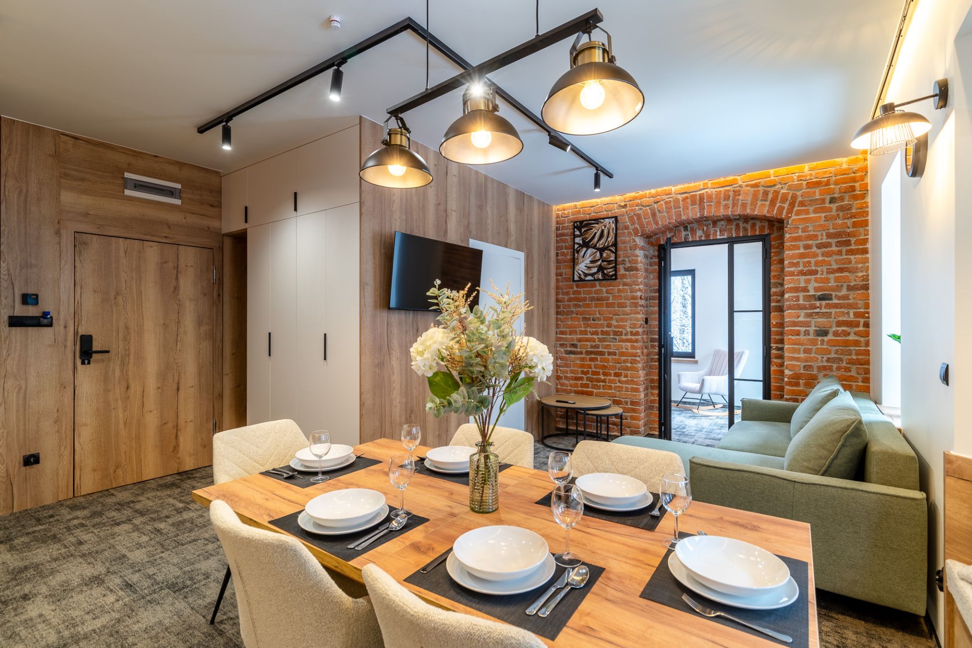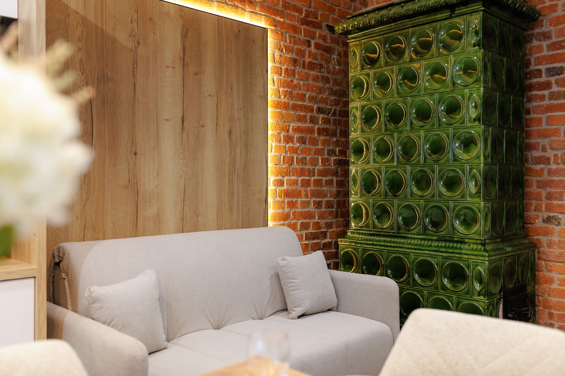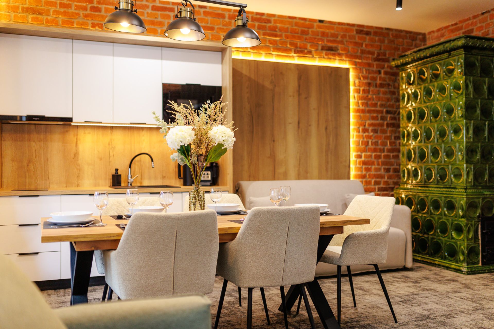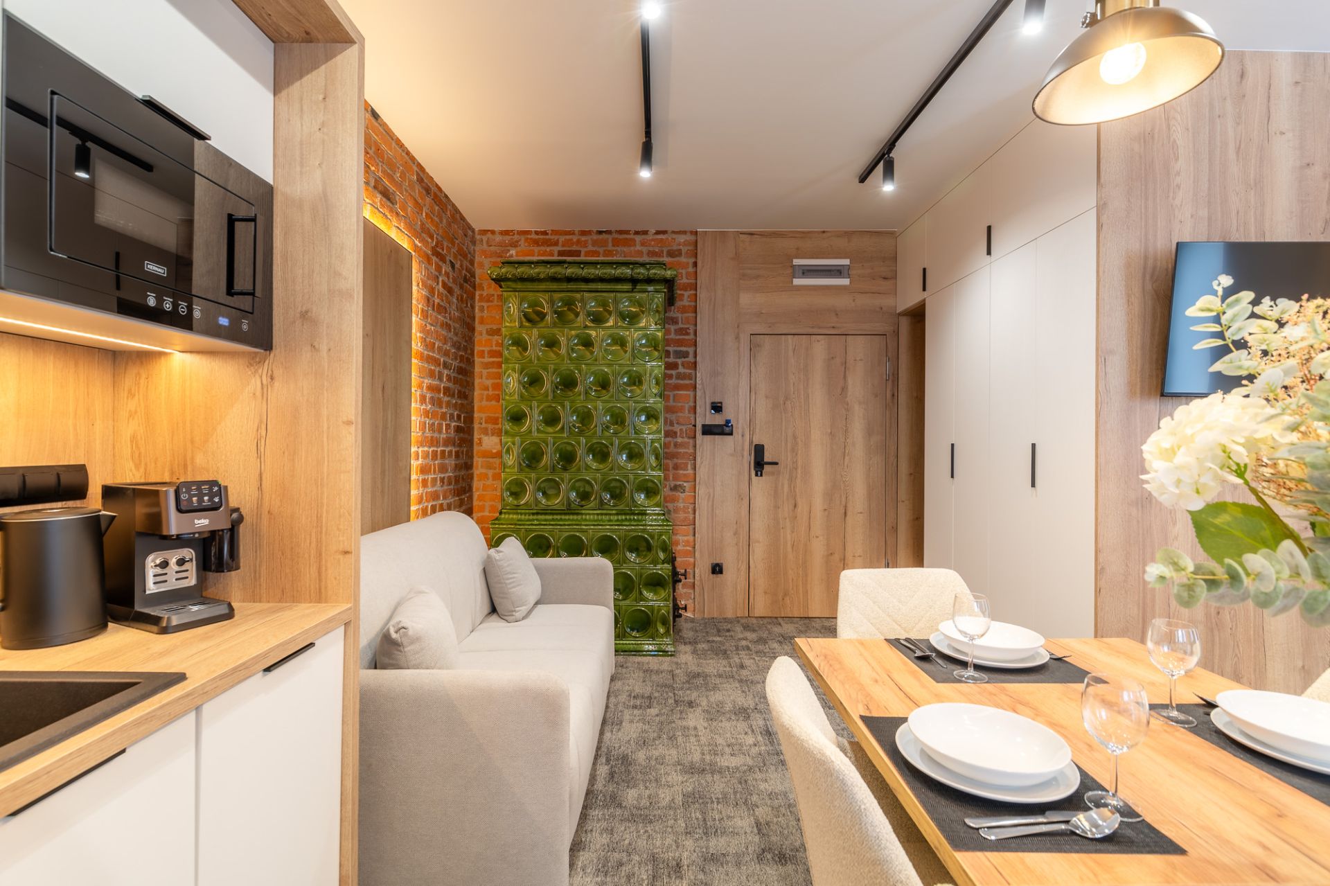 W salonie znajdują się dwie wygodne sofy, które pełnią funkcję miejsc do spania, telewizor zapewniający rozrywkę oraz stylowy, dekoracyjny piec kaflowy, który nadaje wnętrzu wyjątkowy charakter. Aneks kuchenny jest w pełni wyposażony, co umożliwia przygotowanie posiłków w zaciszu apartamentu. Do dyspozycji gości jest także obszerna szafa, która pomieści wszystkie niezbędne rzeczy.