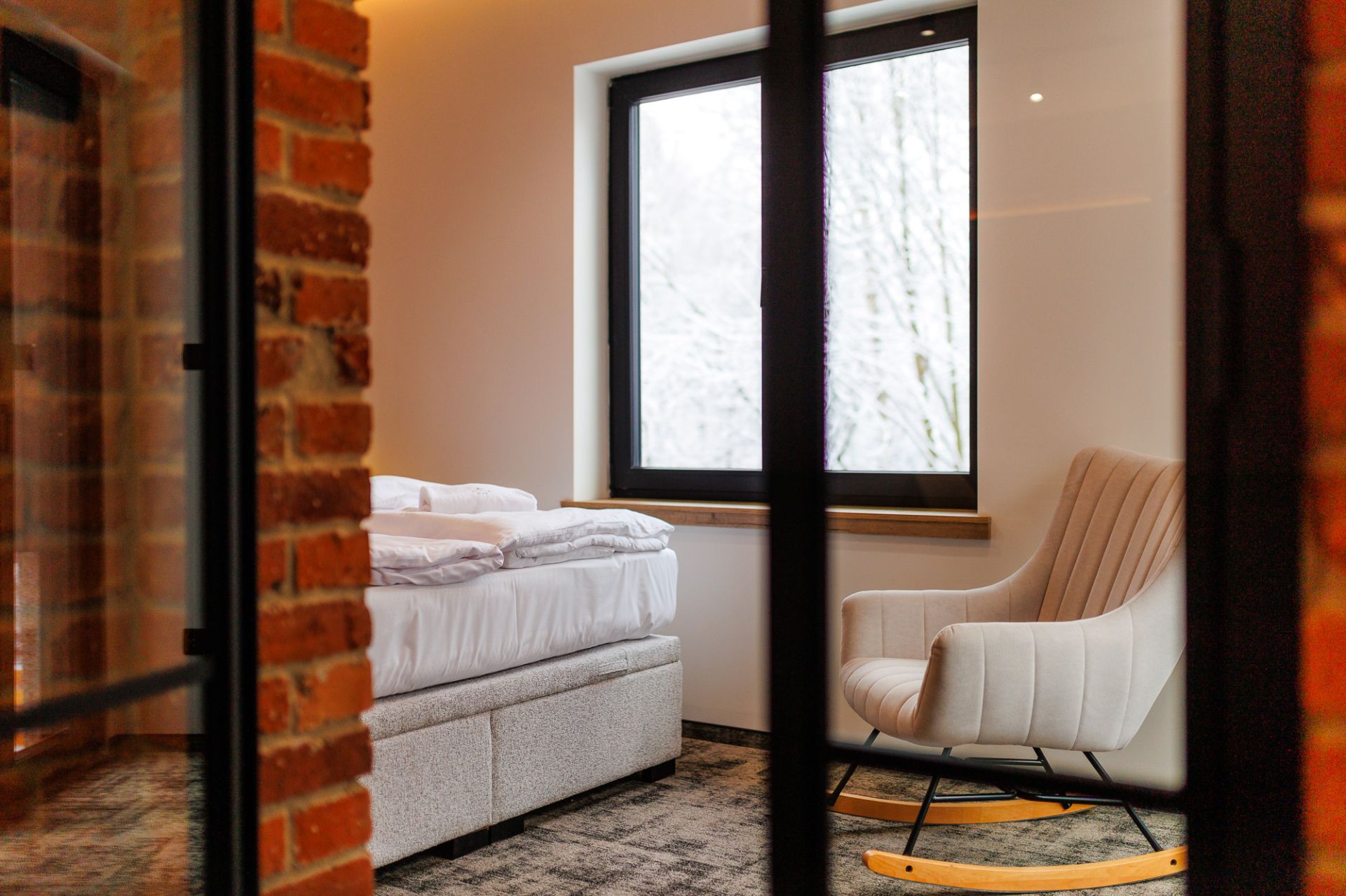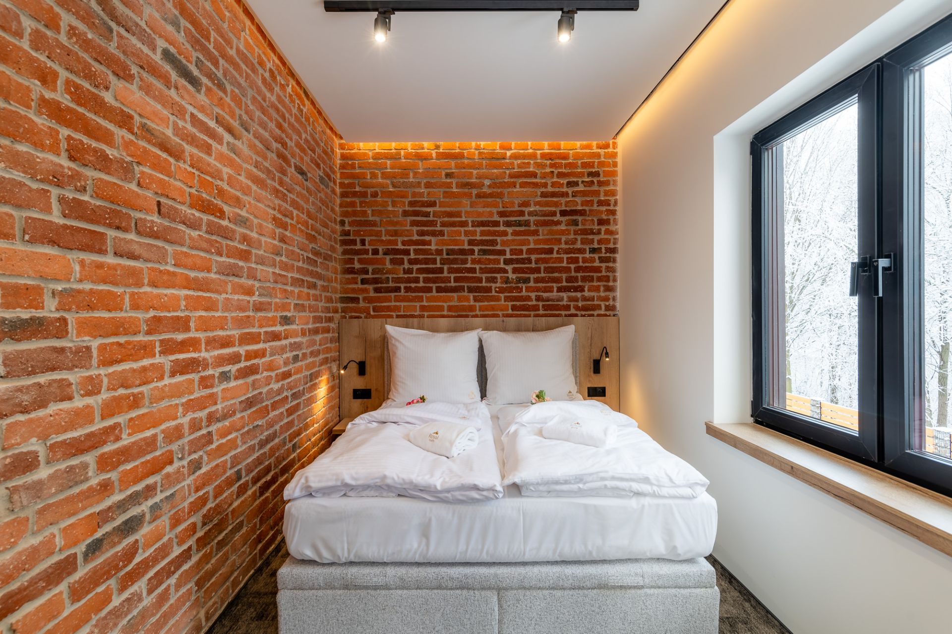 Sypialnia została urządzona z myślą o komforcie – duże, dwuosobowe łóżko gwarantuje spokojny sen, tworząc idealne miejsce do odpoczynku po dniu pełnym atrakcji.