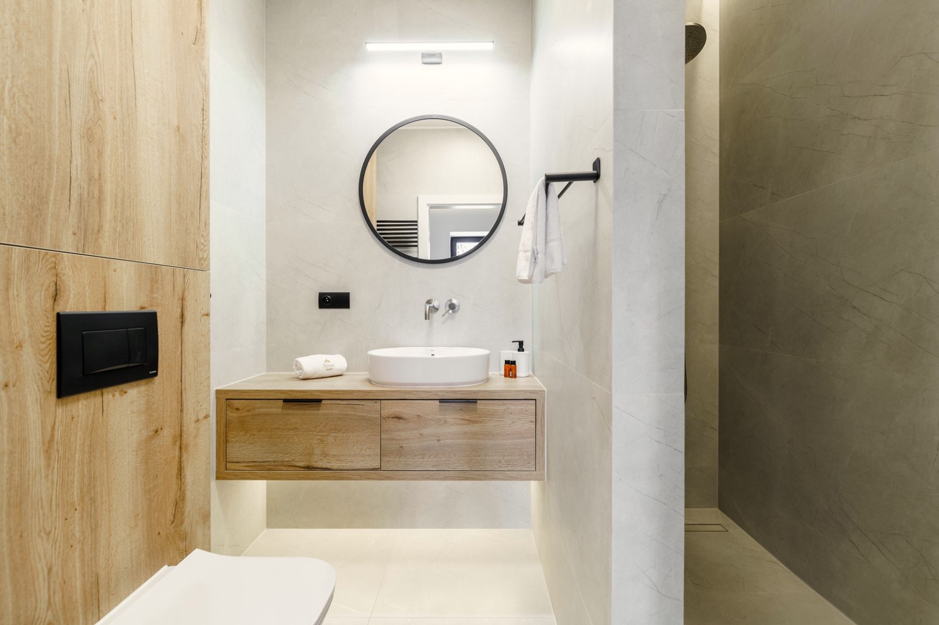 Elegancka łazienka wyposażona w wysokiej jakości armaturę i przestronny prysznic dopełnia poczucia luksusu.