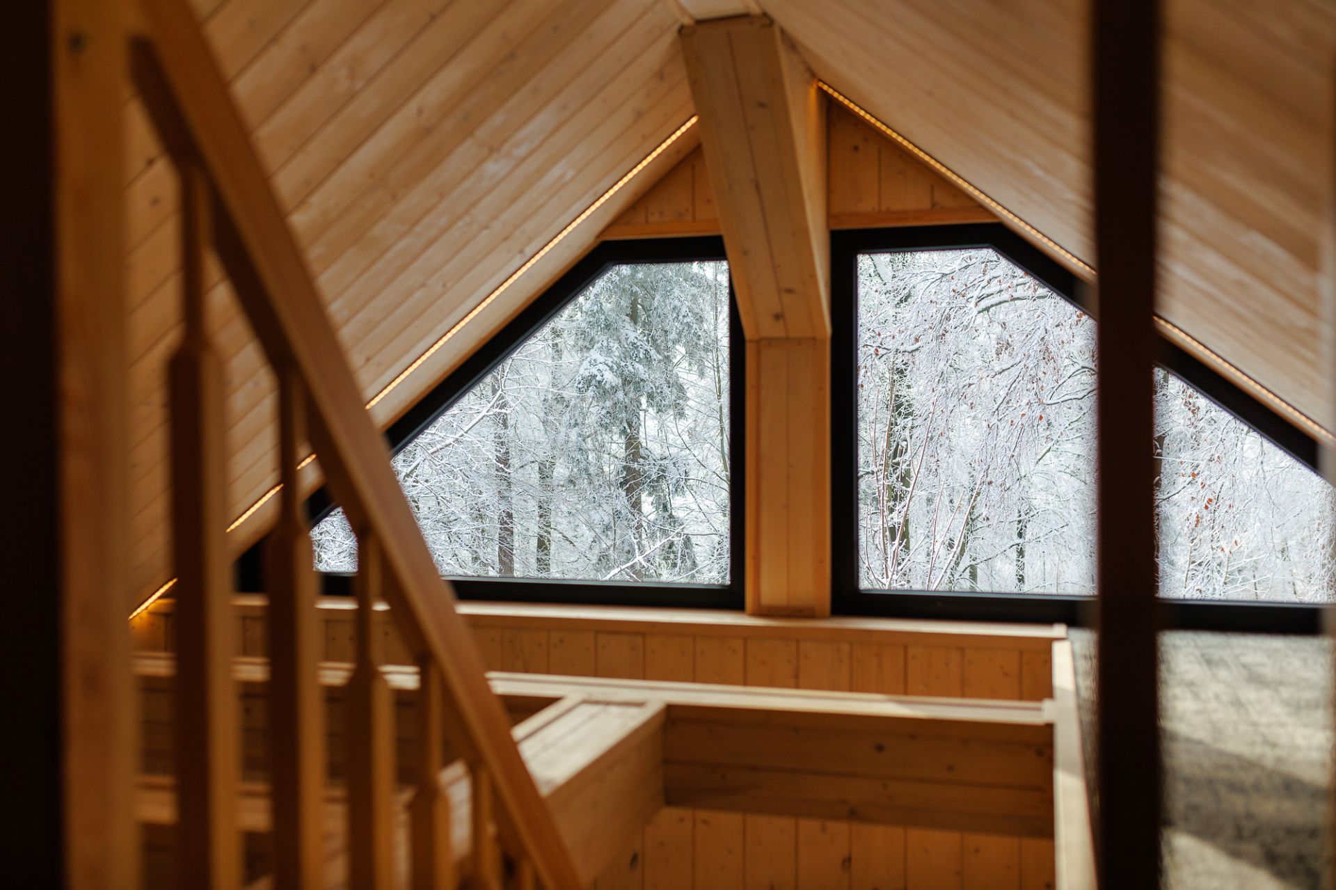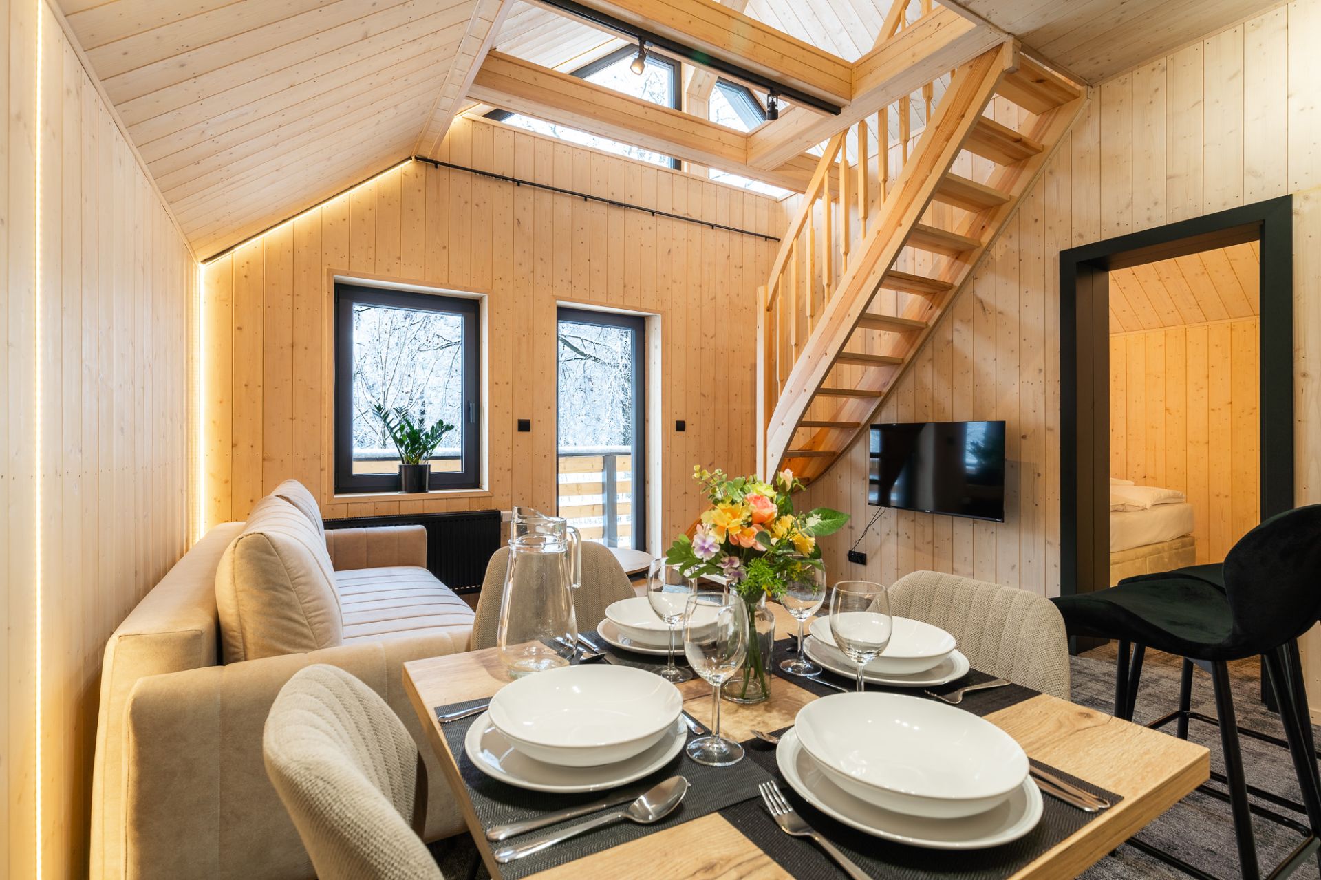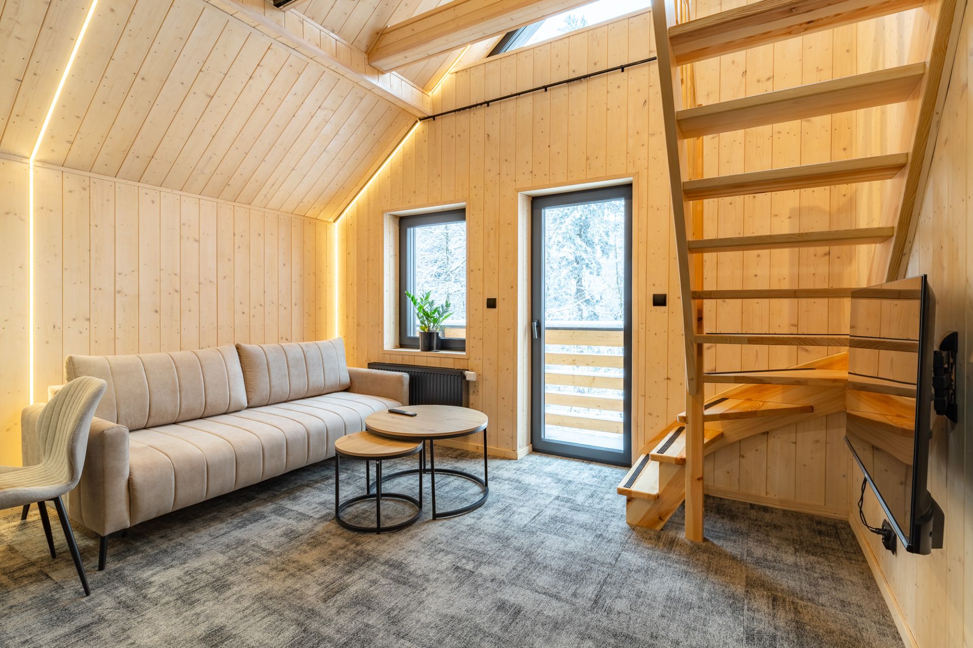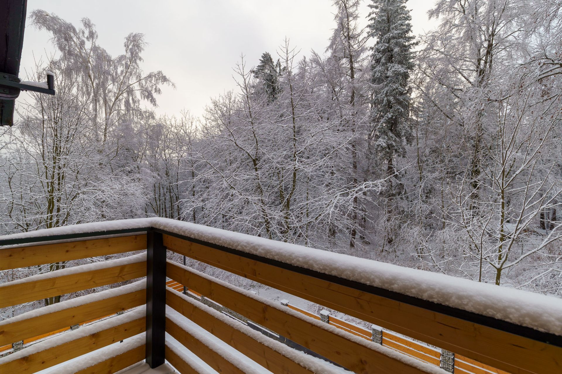 Apartament posiada także balkon z widokiem na las, który jest idealnym miejscem na poranną kawę lub chwilę relaksu na świeżym powietrzu.