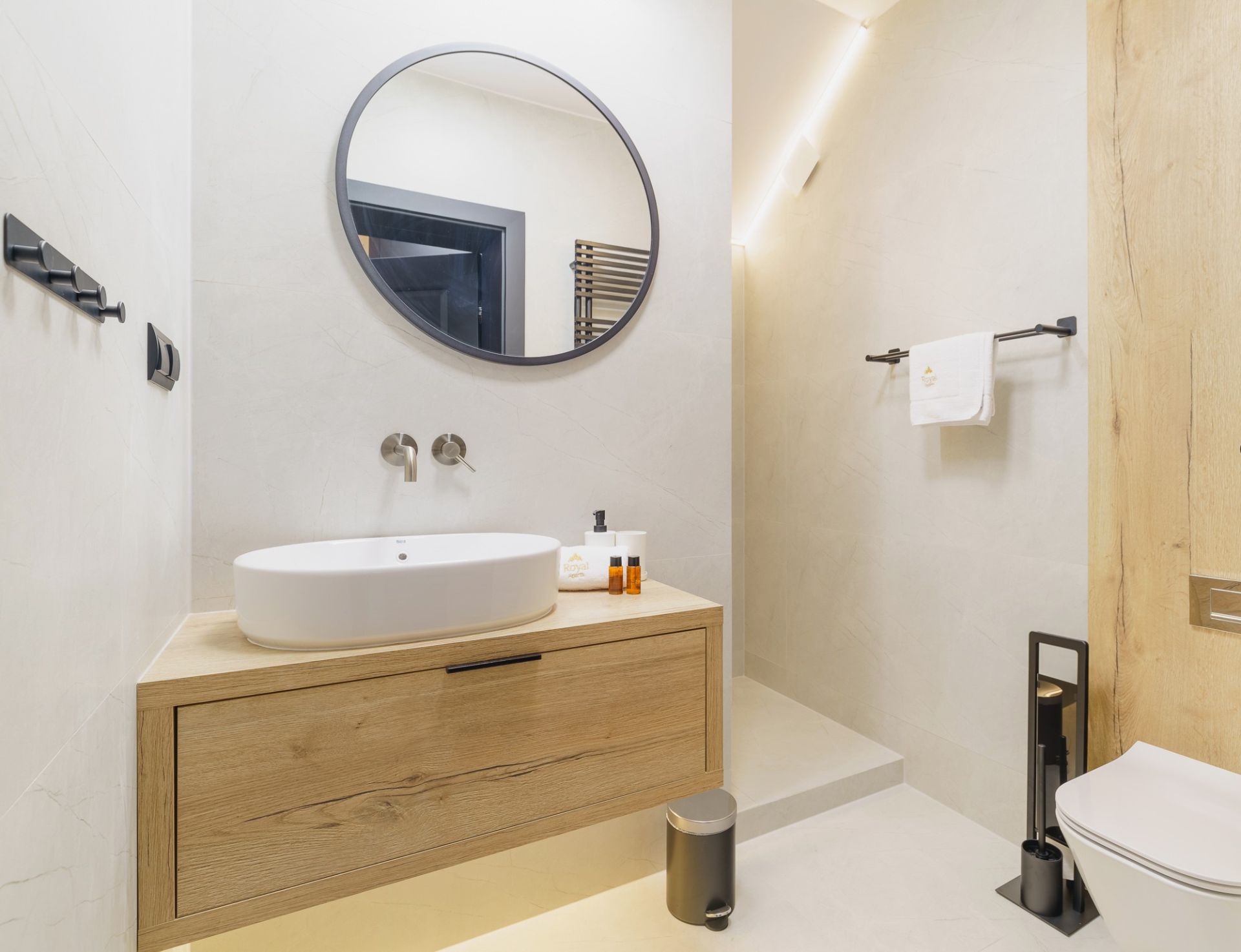 Elegancka łazienka, wyposażona w wysokiej jakości armaturę i przestronny prysznic, dopełnia poczucia wygody i funkcjonalności.