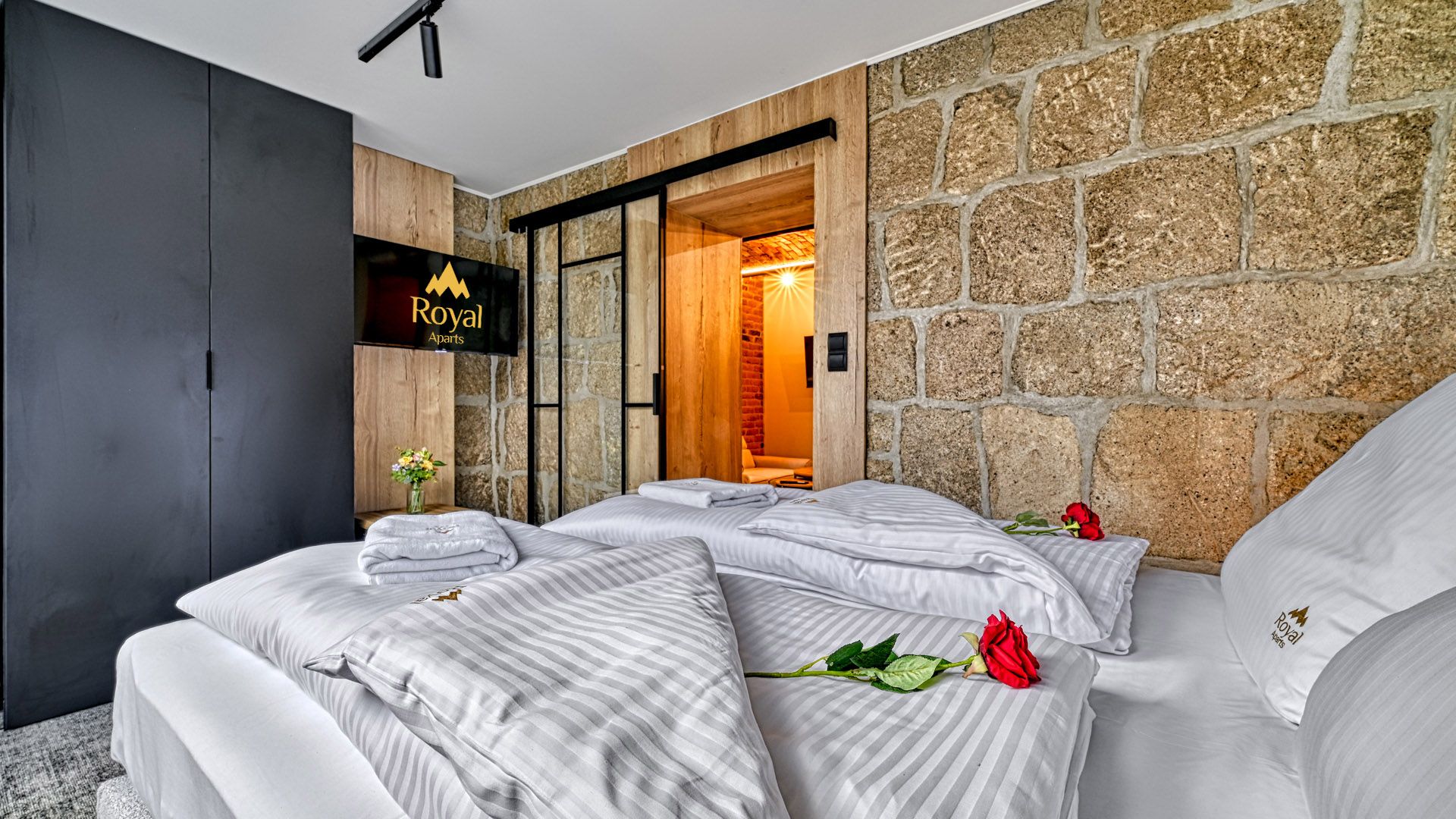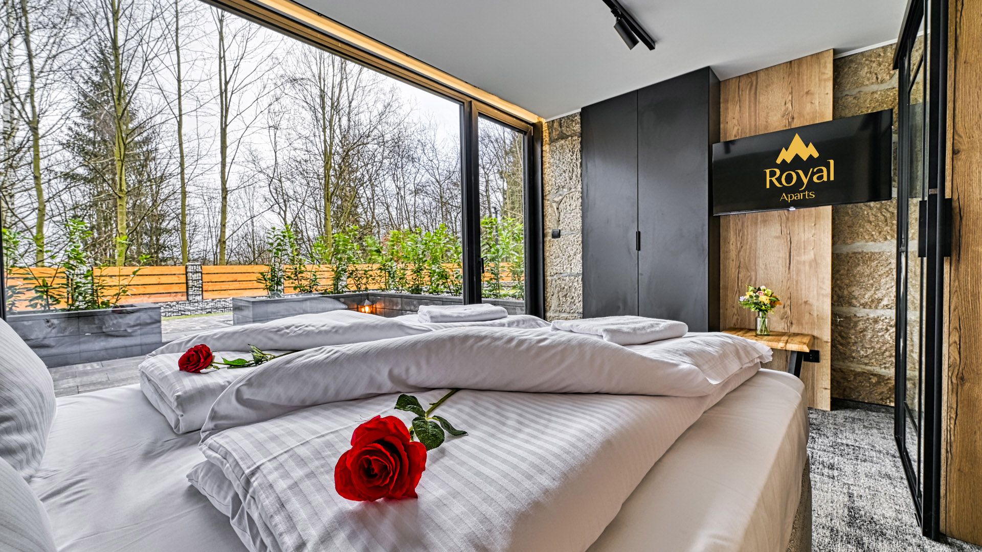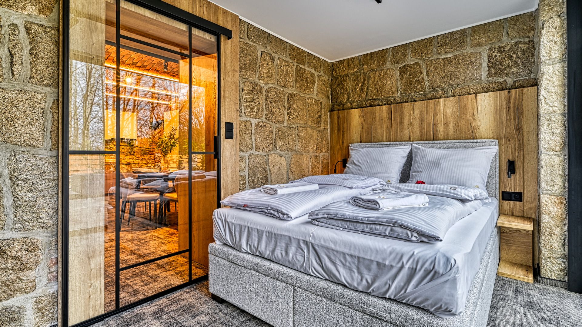 Sypialnia została urządzona z myślą o komforcie – duże, dwuosobowe łóżko gwarantuje spokojny sen, obszerna szafa i telewizor tworzą razem idealne miejsce do odpoczynku po dniu pełnym atrakcji.