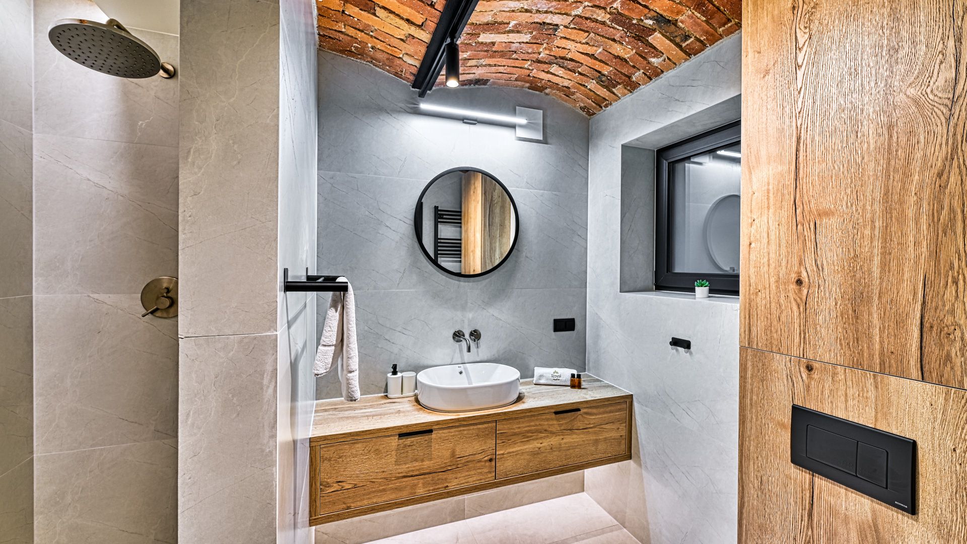 Elegancka łazienka wyposażona w wysokiej jakości armaturę i przestronny prysznic dopełnia poczucia luksusu.
