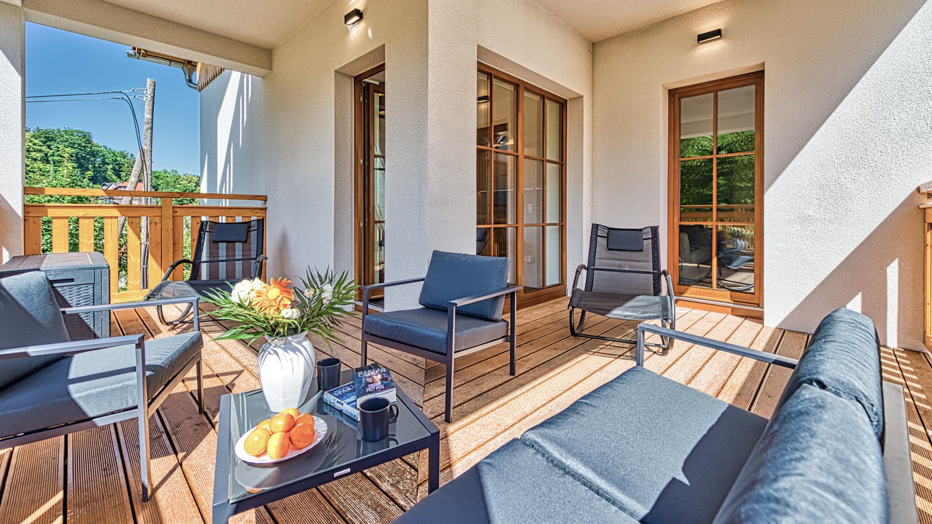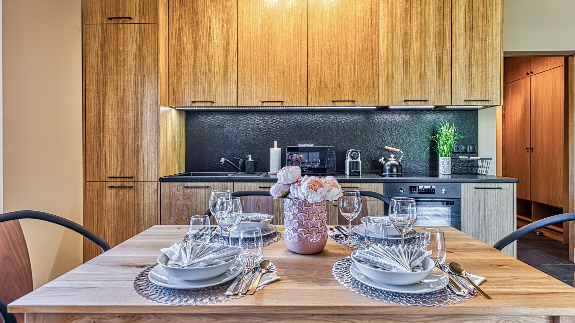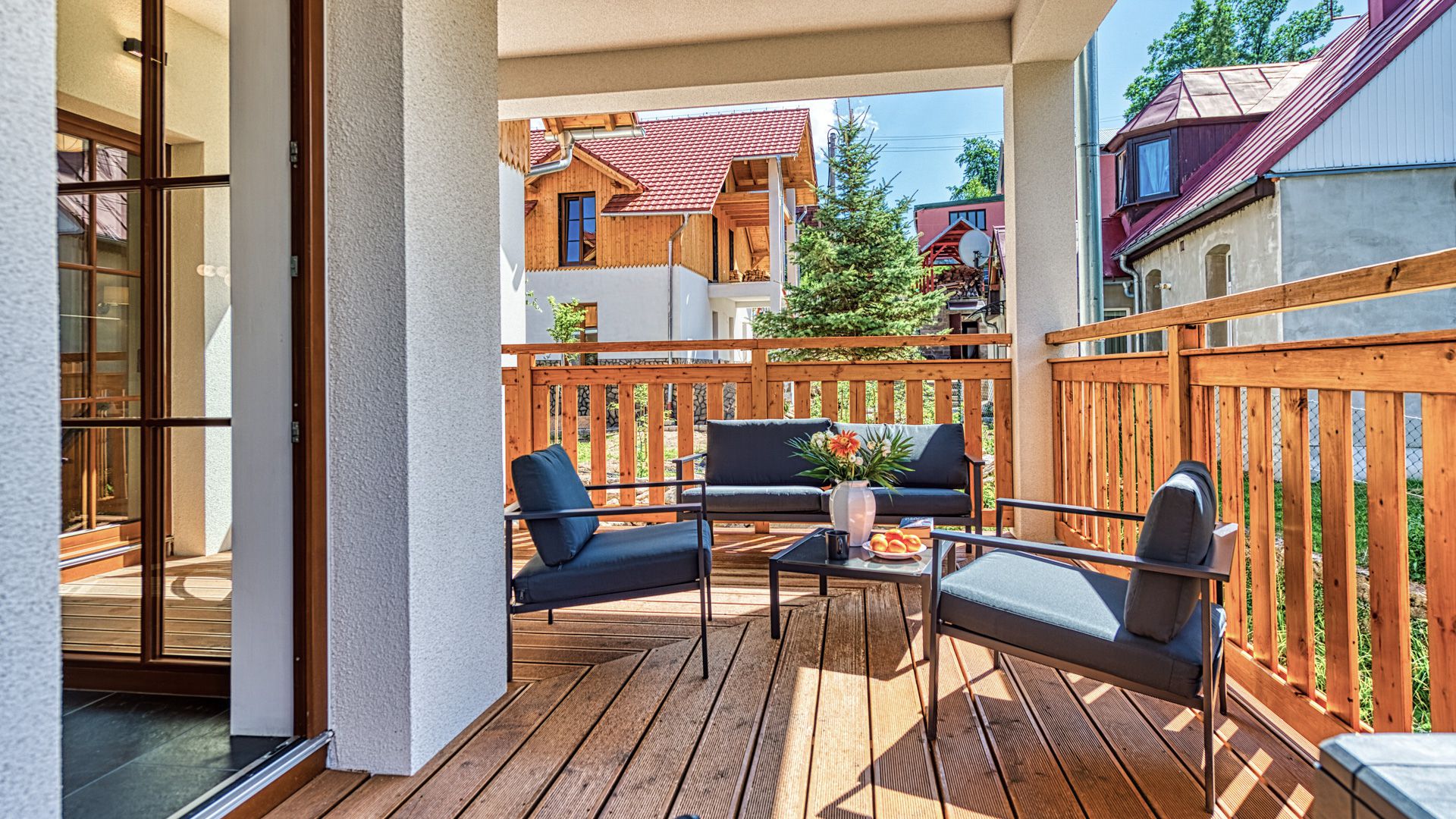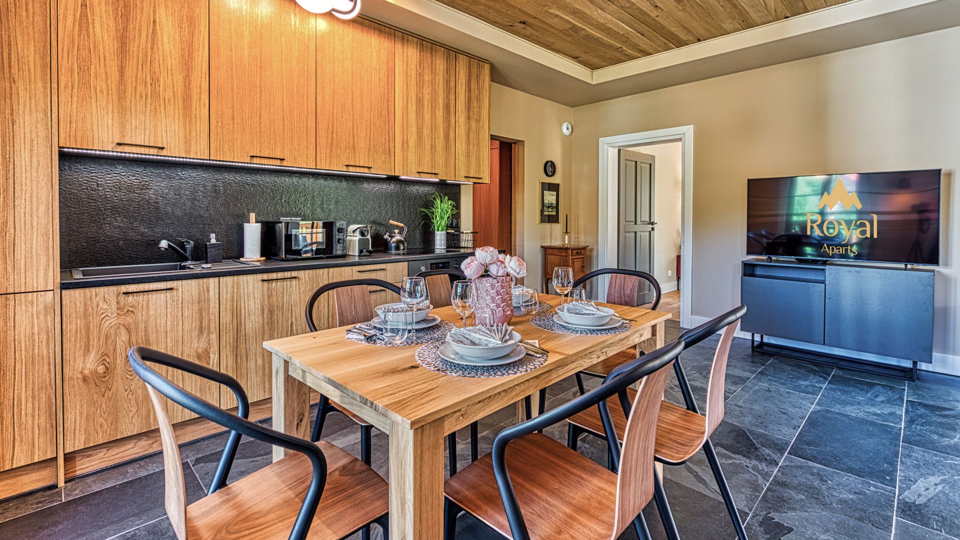 Sam aneks kuchenny posiada bogate wyposażenie, które pozwoli na przygotowanie pysznych posiłków. W jego skład wchodzą m.in. czajnik, talerze i sztućce, płyta kuchenna, lodówka, ekspres do kawy, opiekacz, mikrofalówka, zmywarka, piekarnik. W ładnie urządzonej łazience mieści się prysznic, toaleta, pralka, zlew i lustro. Obszerny balkon pozwoli zachwycić się pięknymi widokami, np. podczas picia porannej kawy. W lokalu znajduje się także duży, płaski telewizor oraz bezpłatny internet WiFi. W budynku wygospodarowany jest schowek na sprzęt sportowy itp.