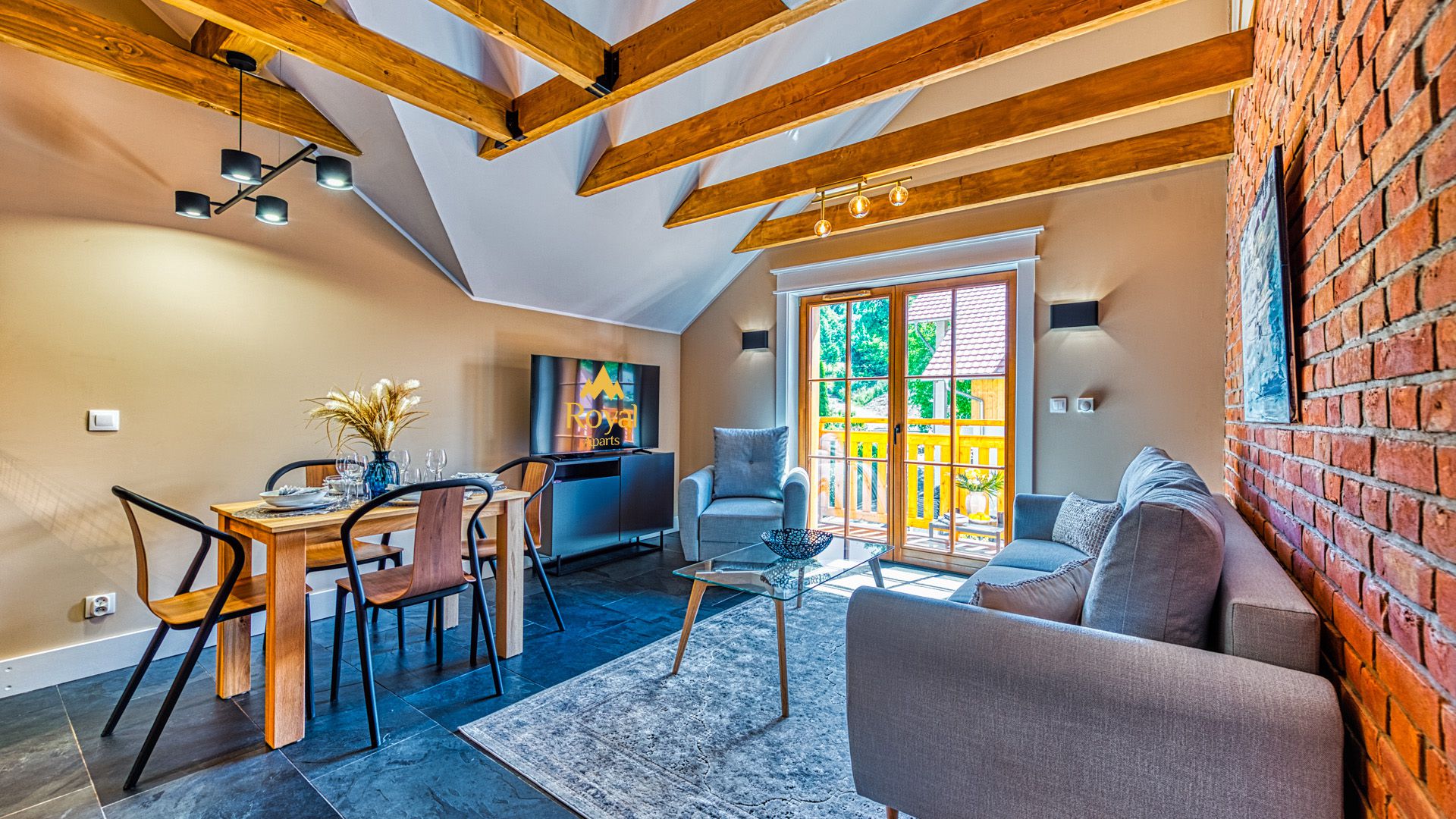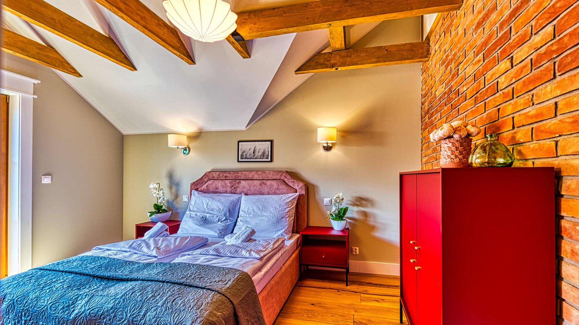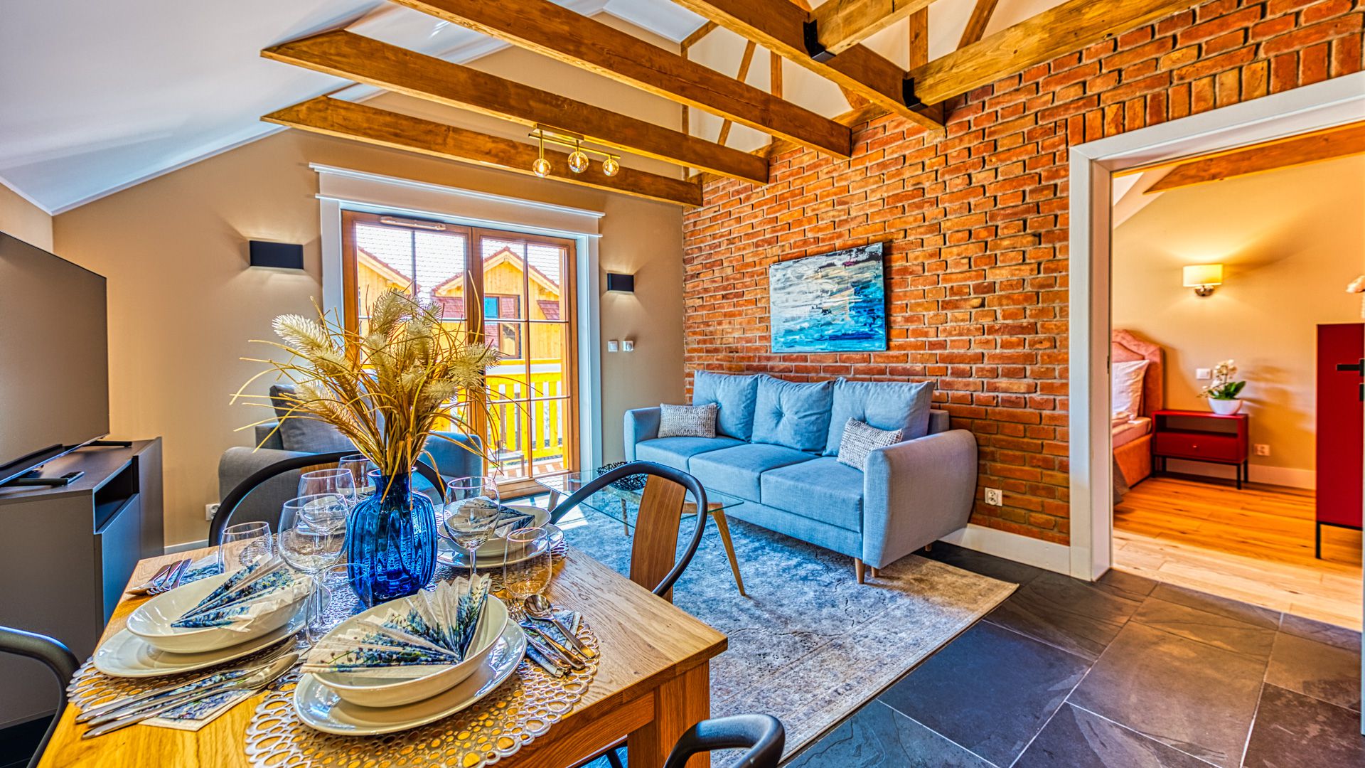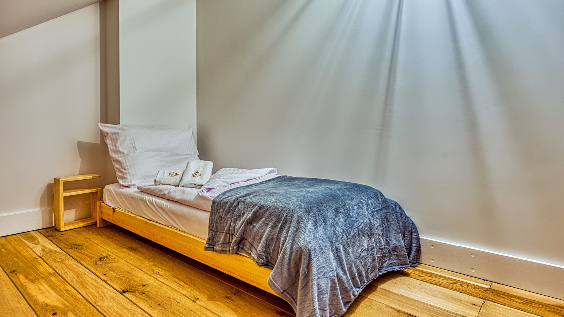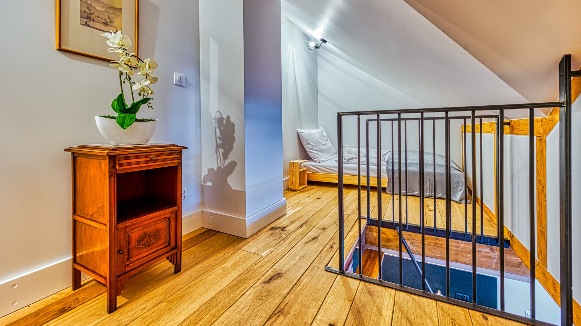 Apartament posiada dwie sypialnie, z których jedna mieści się na piętrze i jest zaopatrzona w dwa pojedyncze łóżka. W dolnej sypialni stoi duże, podwójne łoże oraz szafa. Ponadto w części wypoczynkowej znajduje się dwuosobowa, rozkładana sofa.