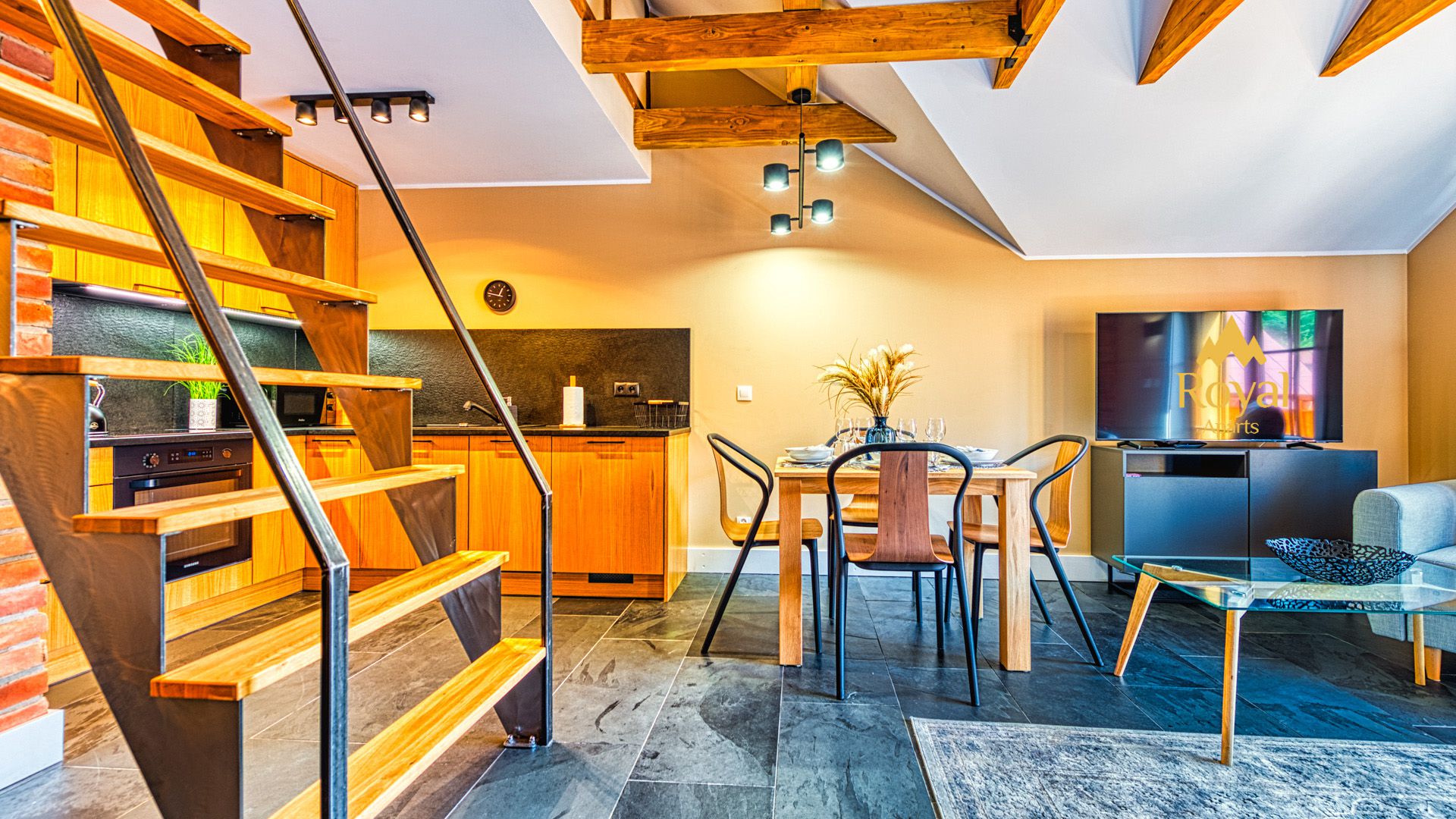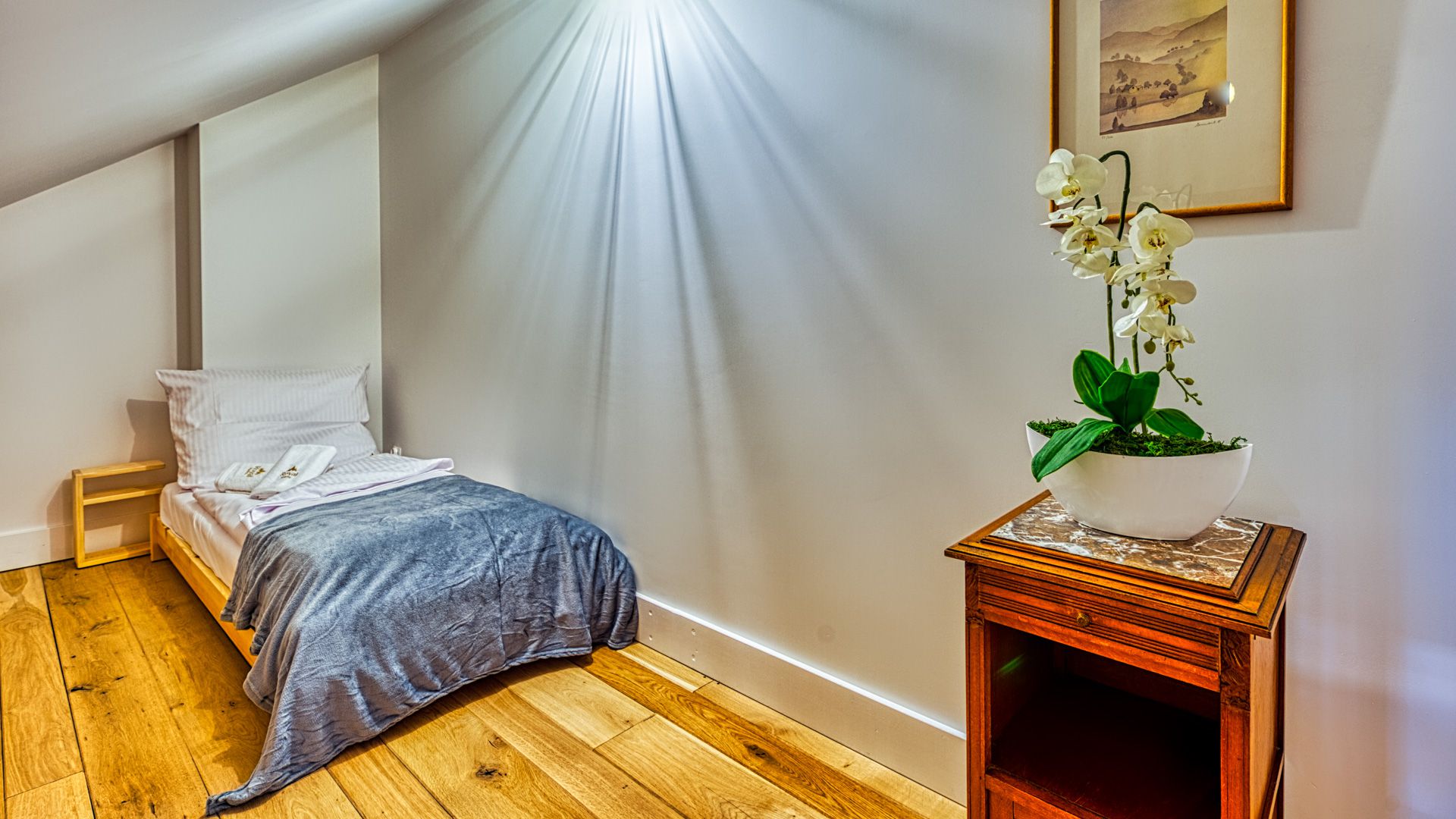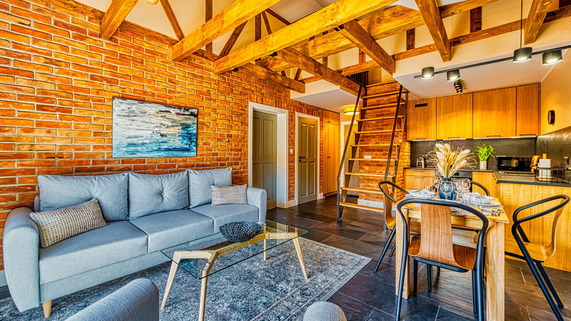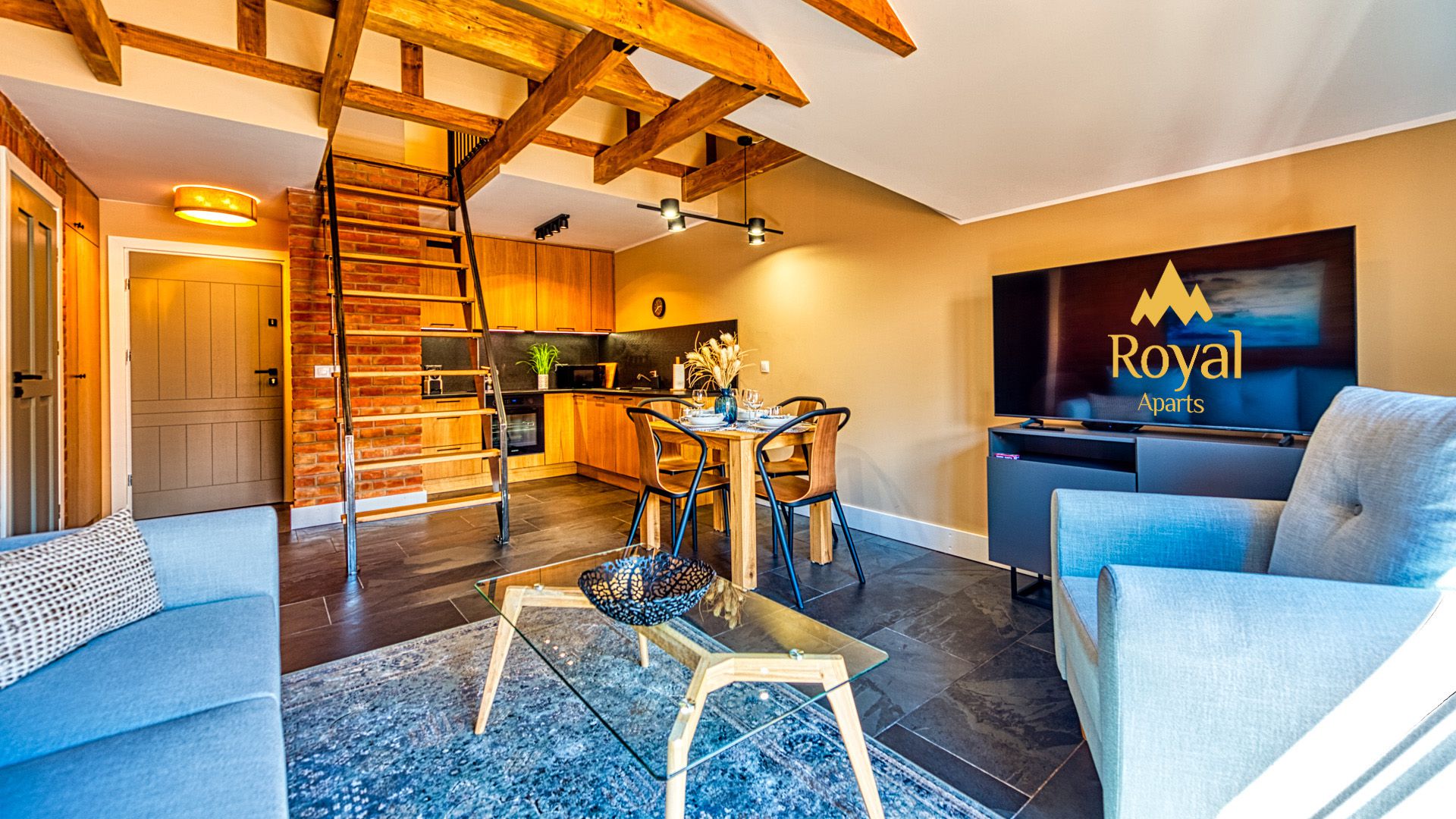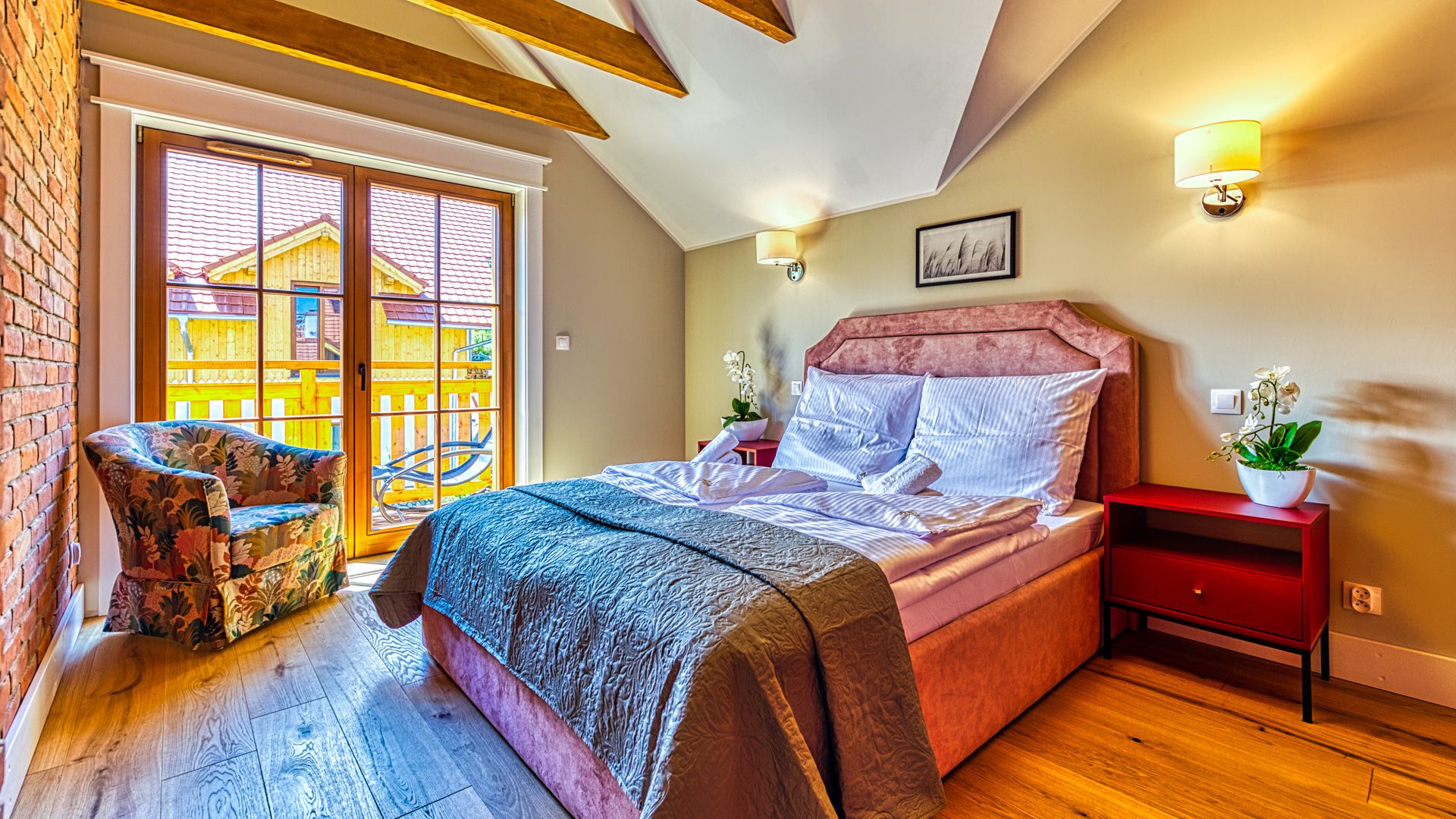 Apartament posiada dwie sypialnie, z których jedna mieści się na piętrze i jest zaopatrzona w dwa pojedyncze łóżka. W dolnej sypialni stoi duże, podwójne łoże oraz szafa. Ponadto w części wypoczynkowej znajduje się dwuosobowa, rozkładana sofa.