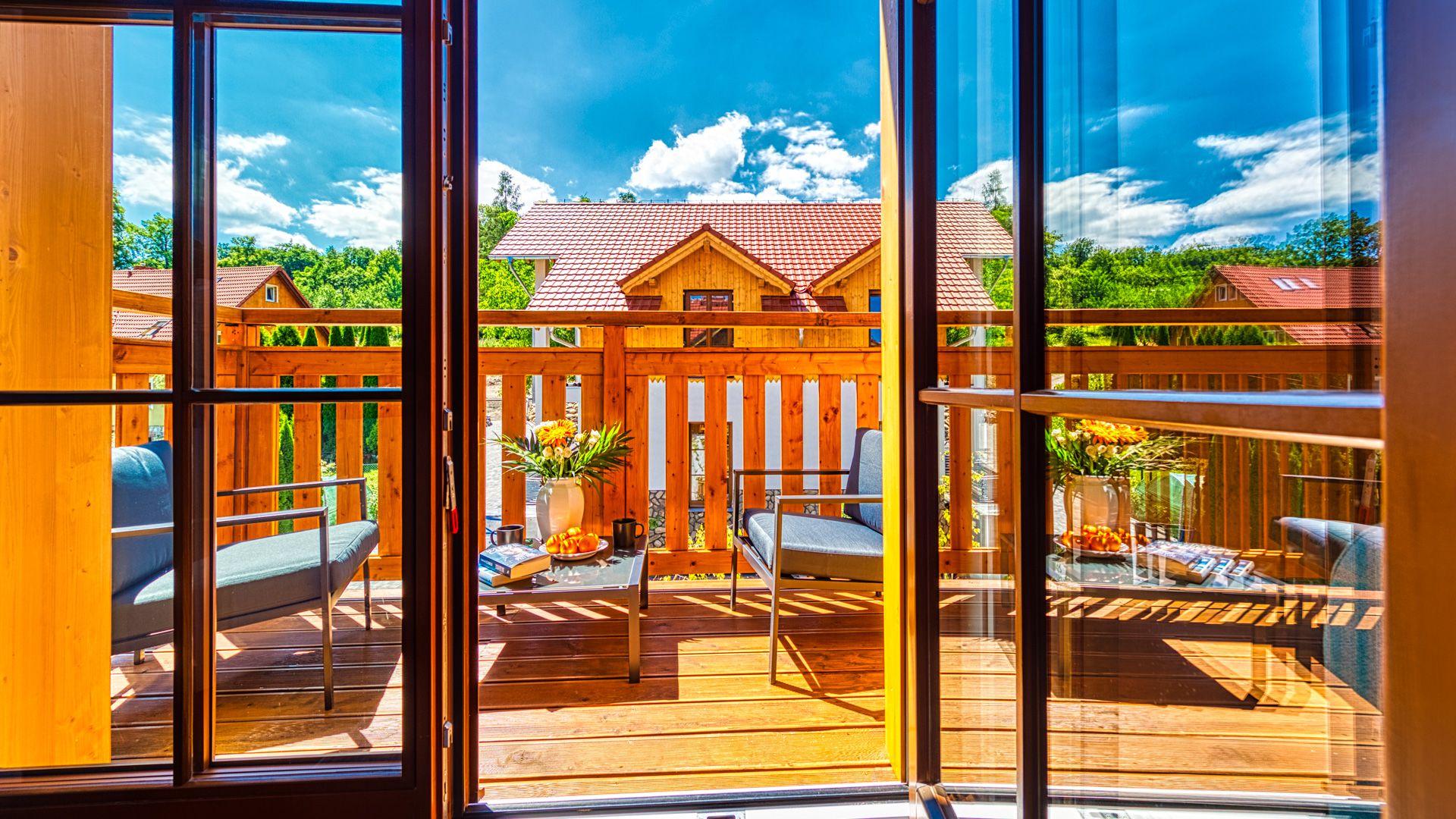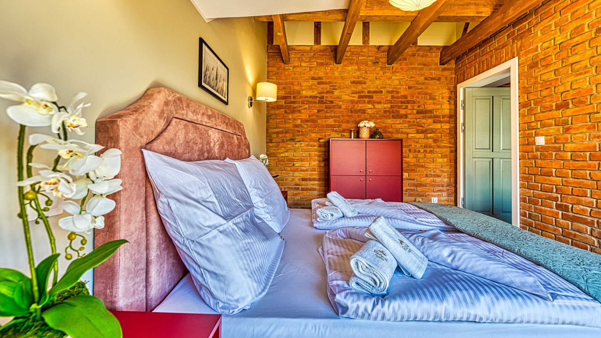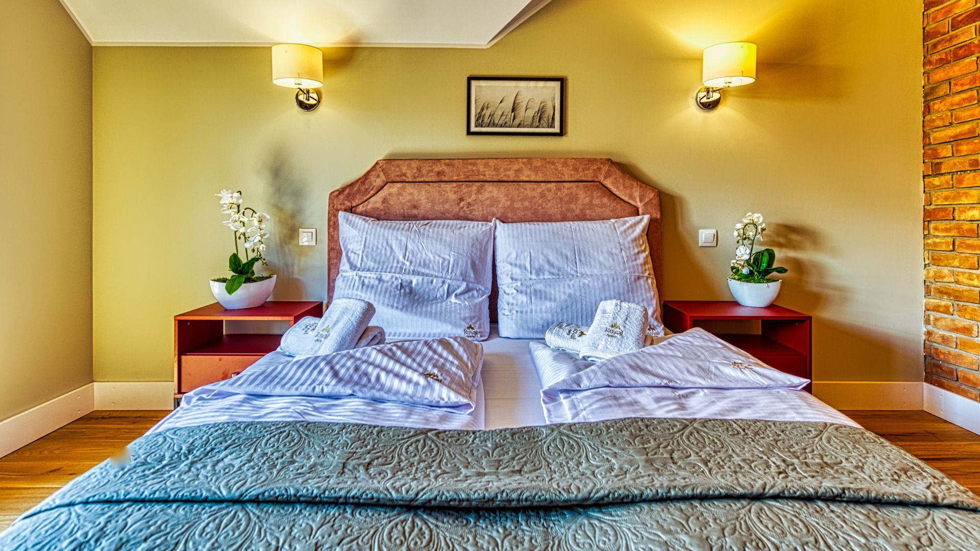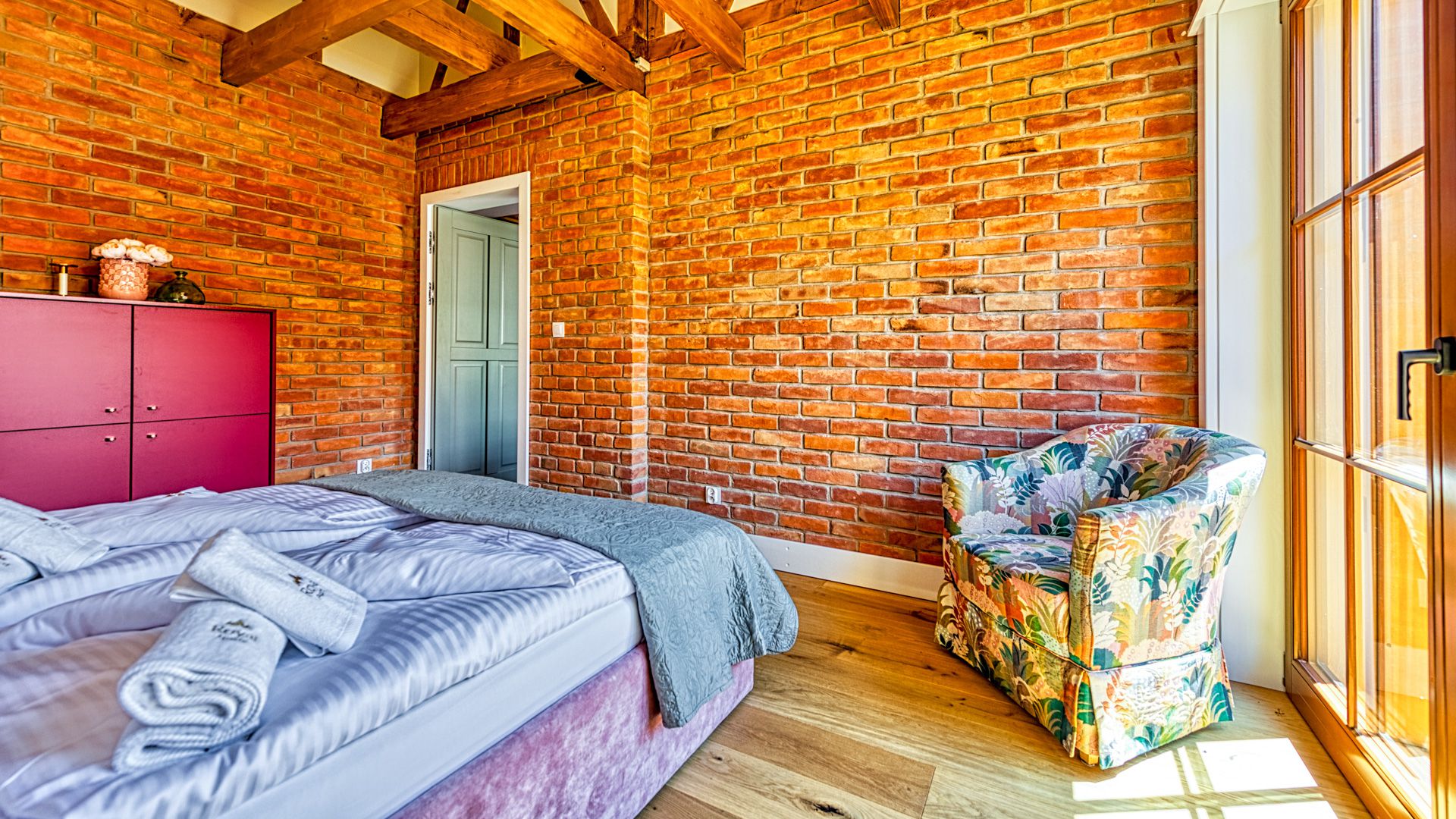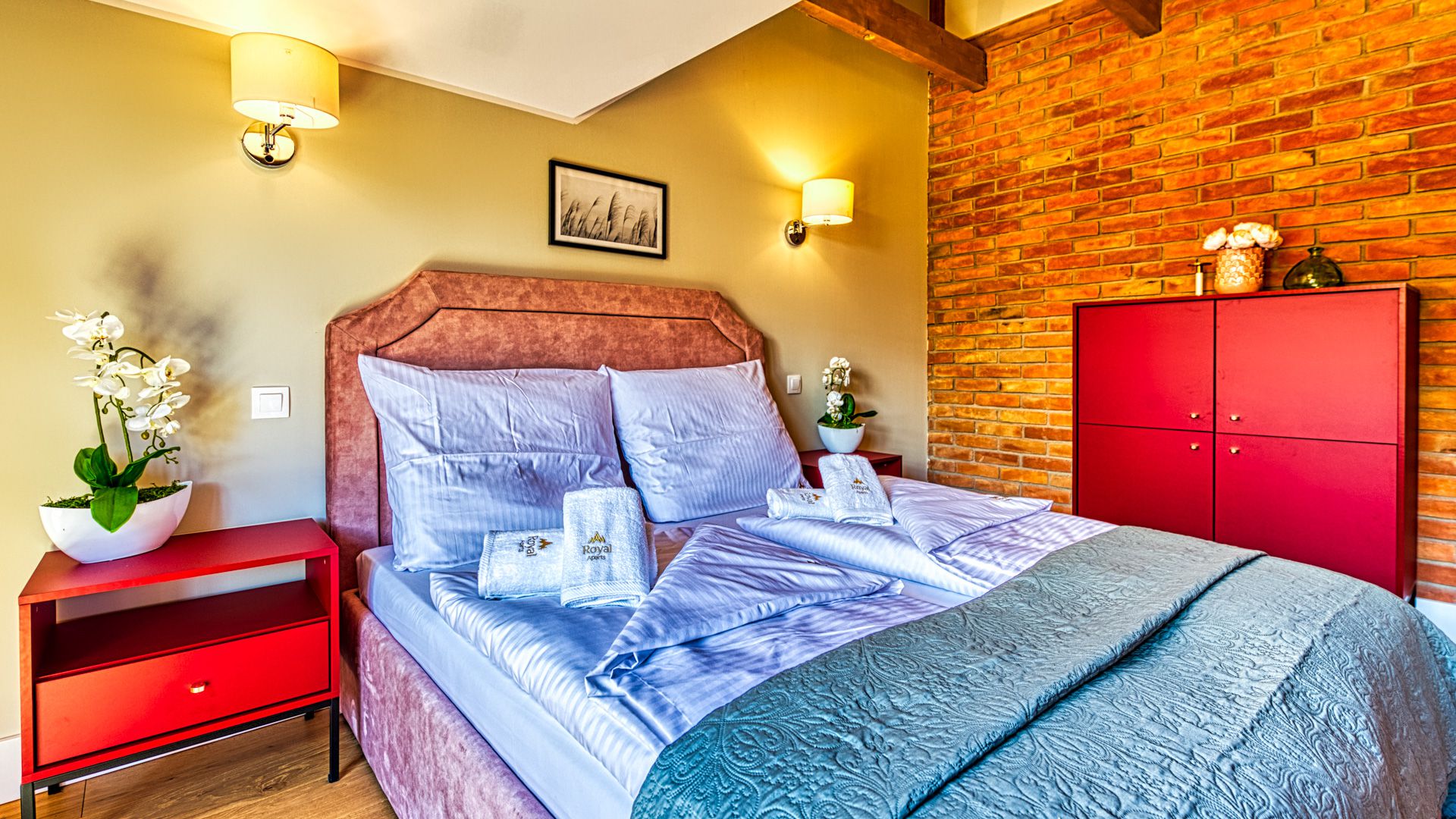 Apartament posiada dwie sypialnie, z których jedna mieści się na piętrze i jest zaopatrzona w dwa pojedyncze łóżka. W dolnej sypialni stoi duże, podwójne łoże oraz szafa. Ponadto w części wypoczynkowej znajduje się dwuosobowa, rozkładana sofa.