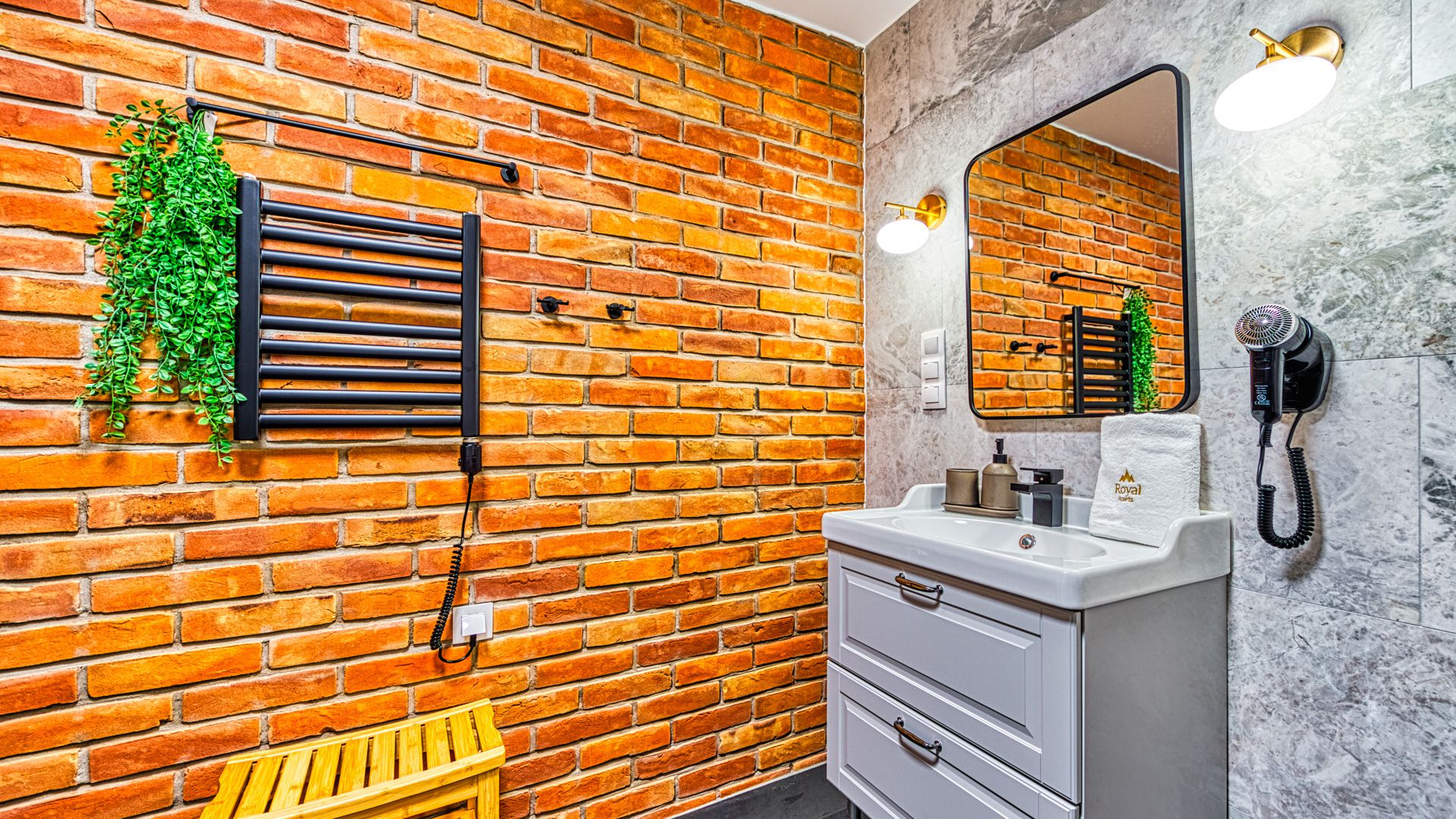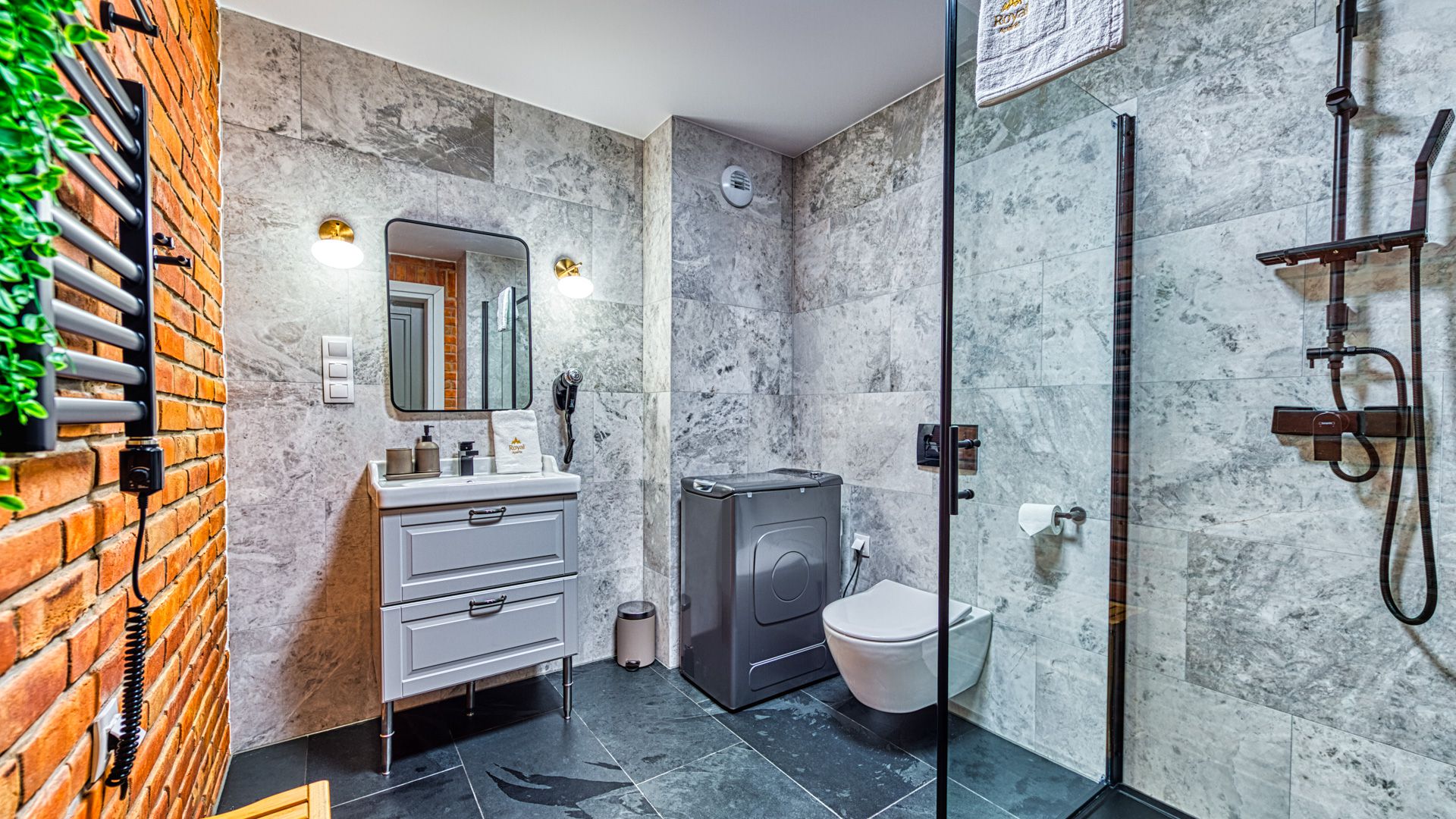W porządnym apartamencie nie mogło również zabraknąć elegancko urządzonej łazienki. Oprócz prysznica i wc, znajdą w niej Państwo pralkę, zlew i lustro.