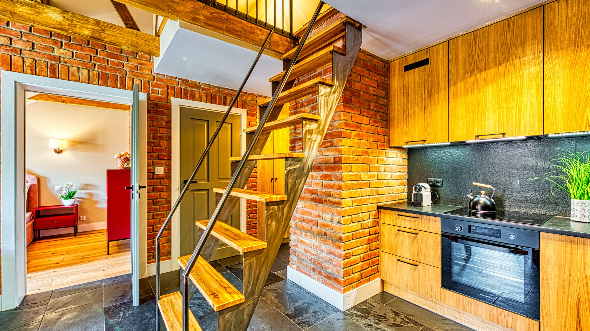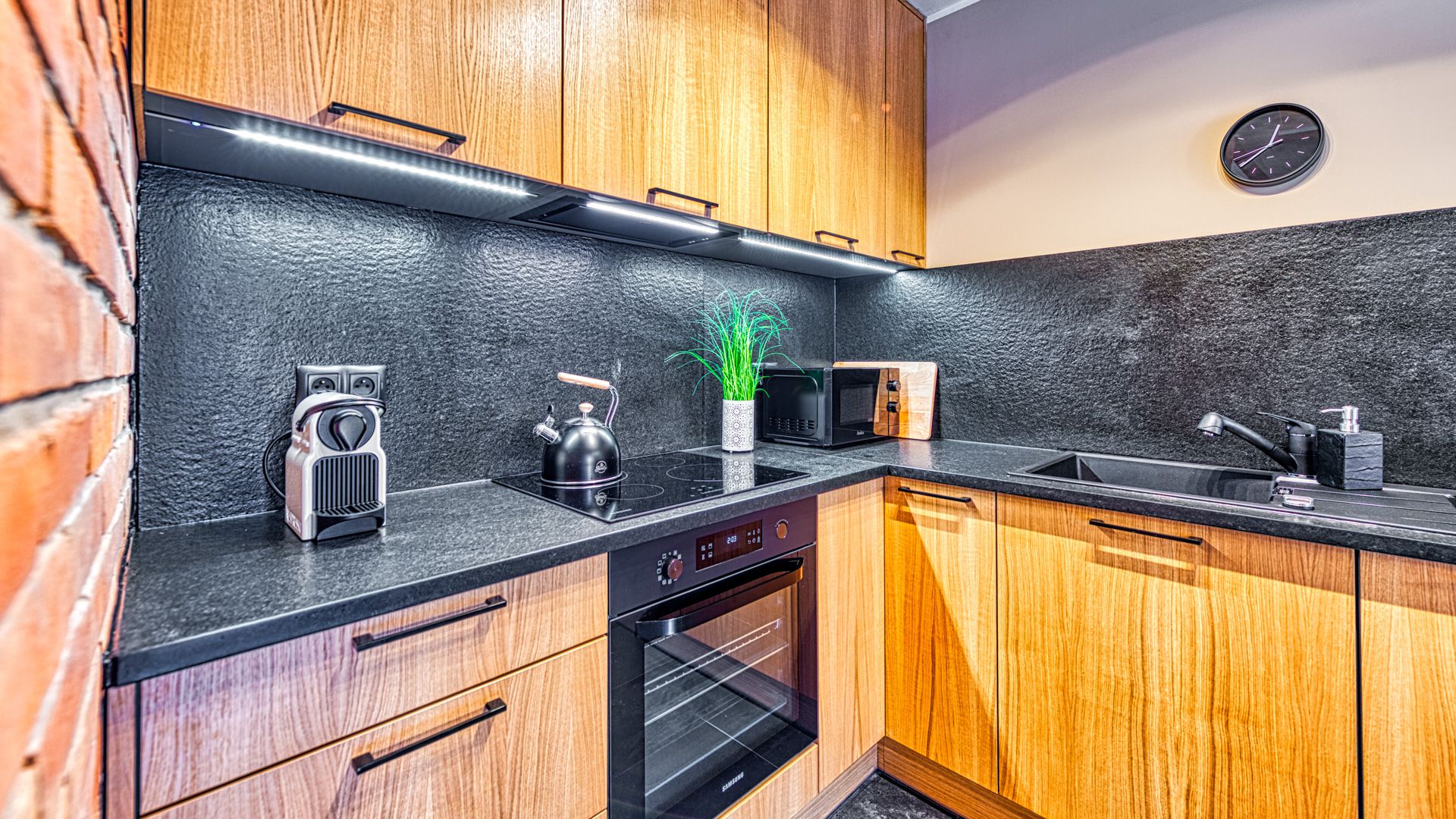 W lokalu jest także bogato wyposażony aneks kuchenny. Są w nim takie utensylia jak: czajnik indukcyjny, ciśnieniowy ekspres do kawy, piekarnik, kuchenka mikrofalowa, lodówka, zmywarka, zastawa stołowa, przybory kuchenne, płyta indukcyjna, etc.