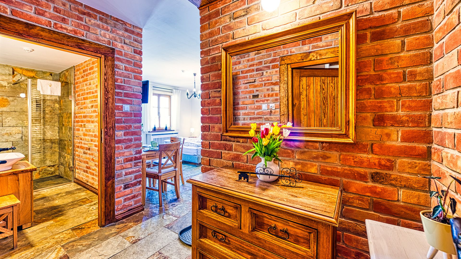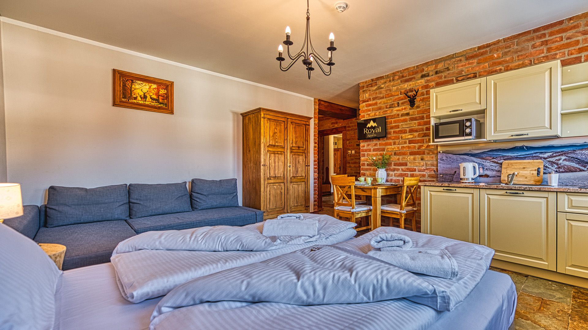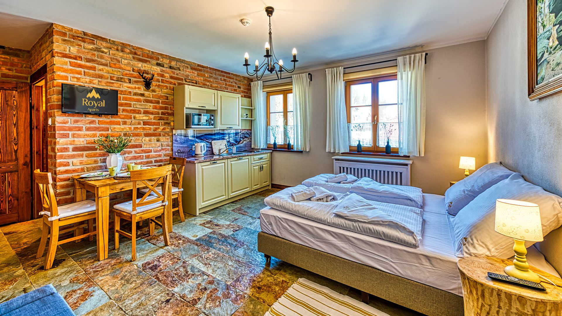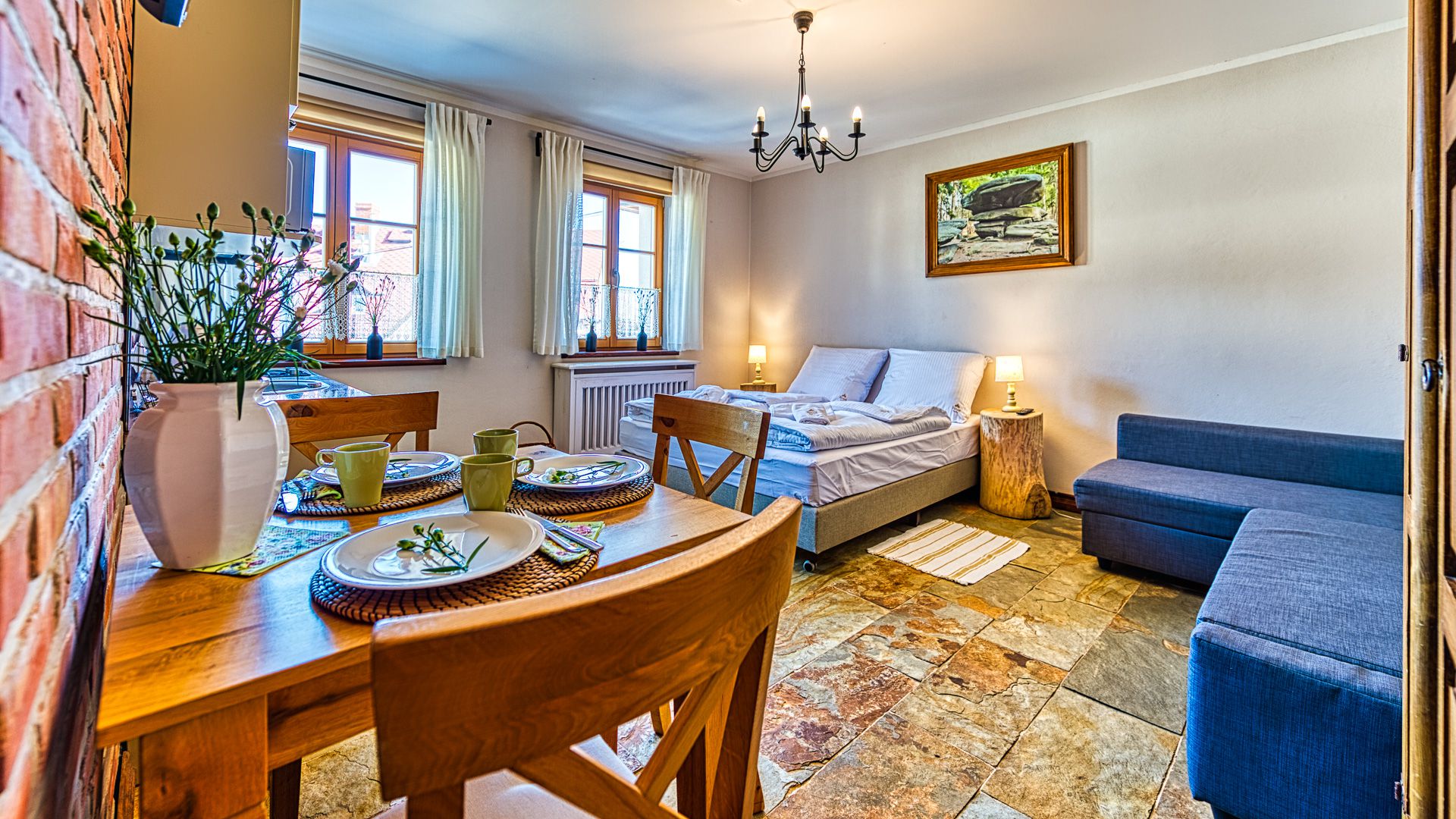 W prezentowanym apartamencie część dzienna połączona jest z sypialnią. W lokalu są dwa pojedyncze łóżka z możliwością ich złączenia (zależnie od wymagań gości) oraz rozkładana sofa. W części jadalnej stoi stół z krzesłami. Apartament posiada liczne udogodnienia. Są to m.in.: szafa/garderoba, telewizor z płaskim ekranem, zestaw do przygotowywania kawy i herbaty, ręczniki, pościel, a ponadto aneks kuchenny, kuchenka mikrofalowa, lodówka, czajnik elektryczny, przybory kuchenne. W klimatycznej, ładnie wykończonej łazience znajdziemy prysznic. Dodatkowo zapewniamy bezpłatny internet WiFi. Całość zlokalizowana jest na parterze.